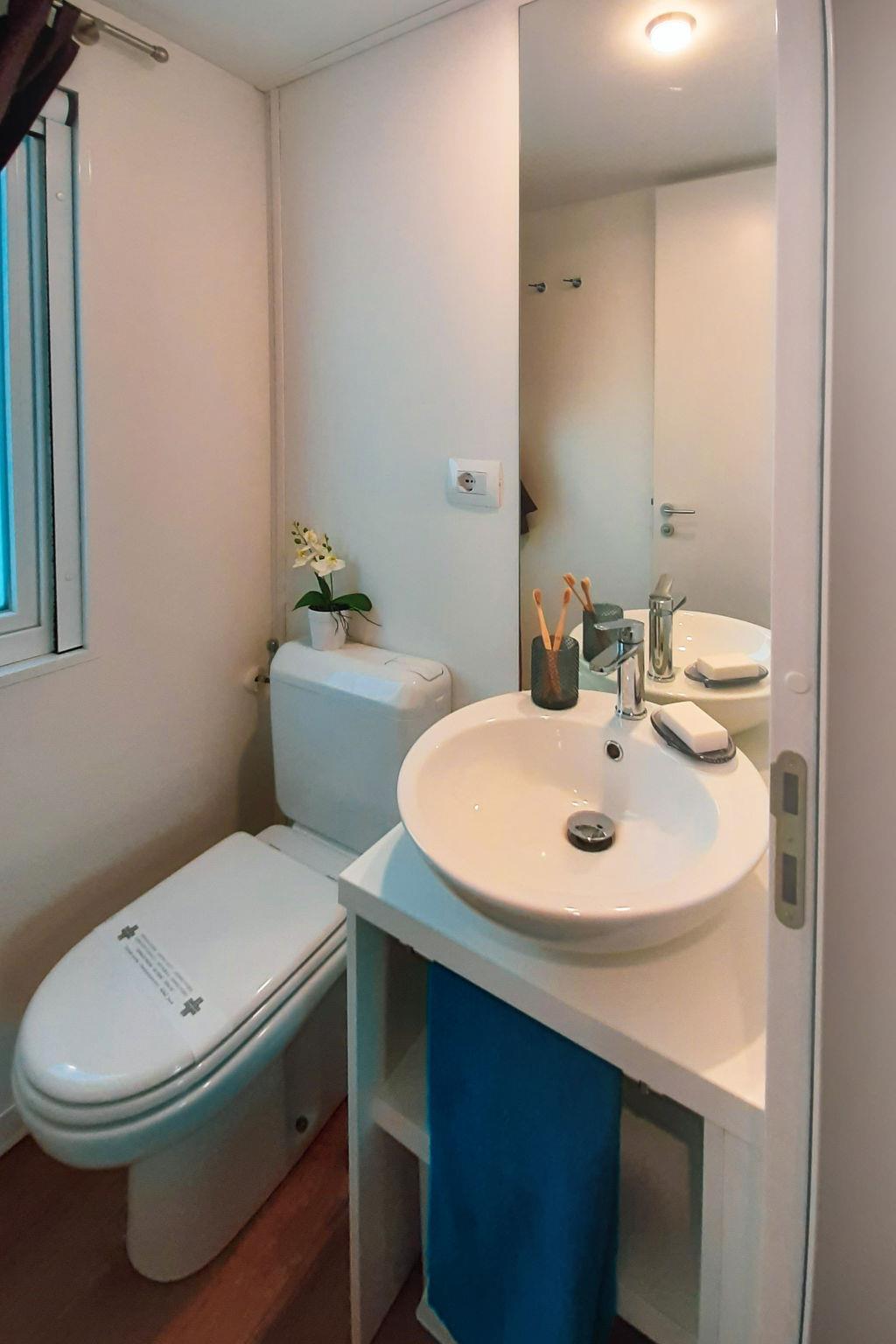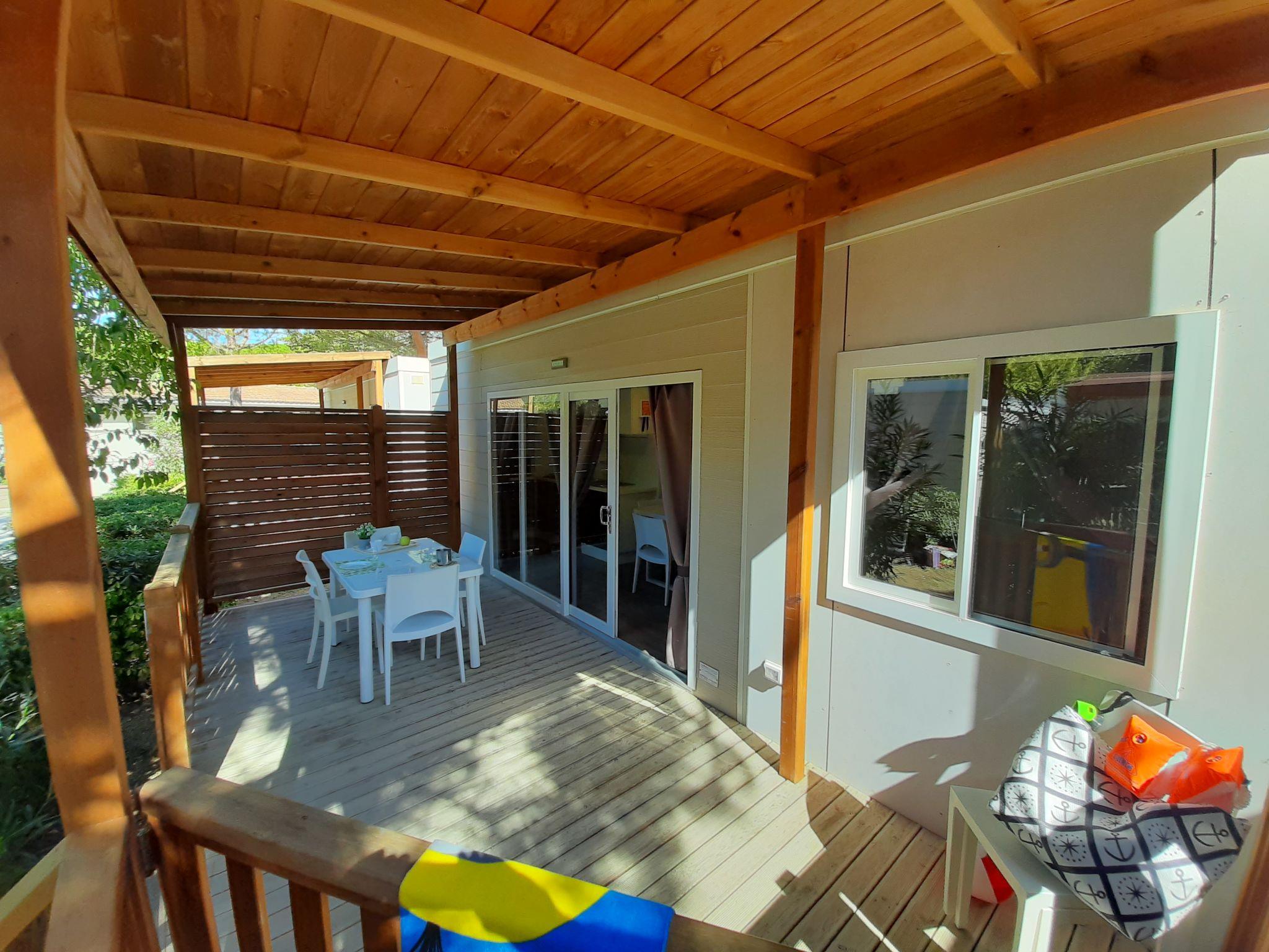 "Maestrale", 3-Zimmer-Mobilheim 30 m2. Modern eingerichtet: Wohn-/Schlafzimmer mit 1 Schlafmöglichkeit, Esstisch, Küchenblock und Klimaanlage. Ausgang zur Terrasse. 1 Zimmer mit 1 Doppelbett (160 cm, Länge 195 cm), sep. WC. 1 Zimmer mit 2 Betten (70 cm, Länge 190 cm), 1 x 1 Etagenbetten (70 cm, Länge 185 cm). Offene Küche (4 Flammen, Mikrowelle, Tiefkühler). Dusche/WC. Heizung, Klimaanlage. Terrasse 15 m2, überdacht. Terrassenmöbel. Zur Verfügung: Fliegengitter. Parkplatz (1 Auto). IT049001B1KRISVGSR