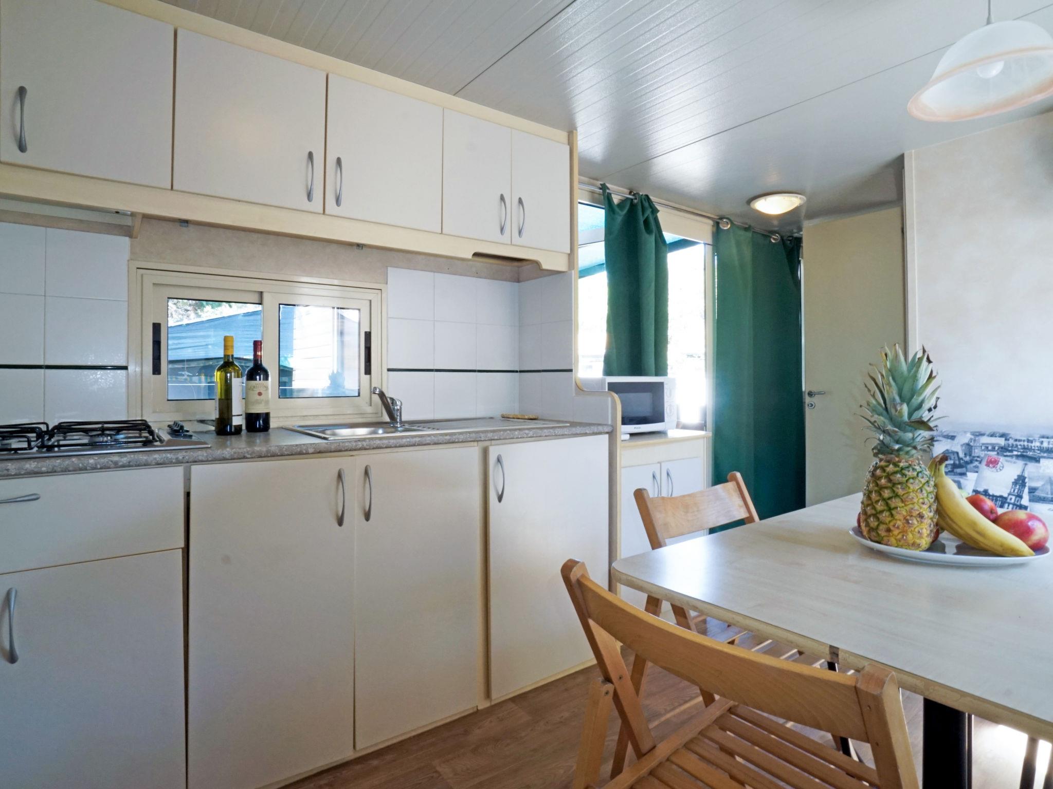 "Ponente", 3-Zimmer-Mobilheim 24 m2. Zweckmässig eingerichtet: Wohn-/Schlafzimmer mit 1 Schlafmöglichkeit, Esstisch, Küchenblock und Klimaanlage. Ausgang zur Terrasse. 1 Zimmer mit 1 franz. Bett (140 cm, Länge 190 cm). 1 Zimmer mit 2 Betten (70 cm, Länge 185 cm), 1 x 1 Etagenbetten (70 cm, Länge 185 cm). Offene Küche (4 Flammen, Mikrowelle, Tiefkühler). Dusche/WC, sep. WC. Heizung, Klimaanlage. Terrasse 18 m2, überdacht. Terrassenmöbel. Zur Verfügung: Fliegengitter. Parkplatz (1 Auto). Maximal 1 Haustier/Hund erlaubt. IT049001B1KRISVGSR