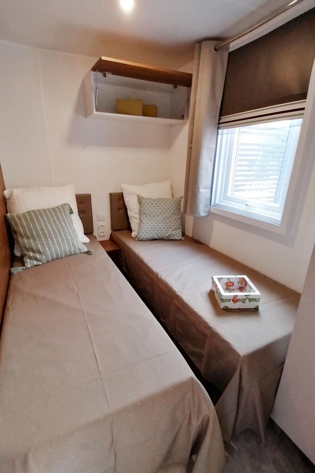 "Levante Deluxe", 3-Zimmer-Mobilheim 23 m2. Modern eingerichtet: Wohn-/Schlafzimmer mit 1 Schlafmöglichkeit, Esstisch, Küchenblock und Klimaanlage. Ausgang zur Terrasse. 1 Zimmer mit 1 franz. Bett (135 cm, Länge 190 cm). 1 Zimmer mit 2 Betten (70 cm, Länge 190 cm). Offene Küche (4 Flammen, Mikrowelle, Tiefkühler). Dusche/Bidet/WC. Heizung, Klimaanlage. Terrasse 15 m2, überdacht. Terrassenmöbel. Zur Verfügung: Fliegengitter. Parkplatz (1 Auto). IT049001B1KRISVGSR