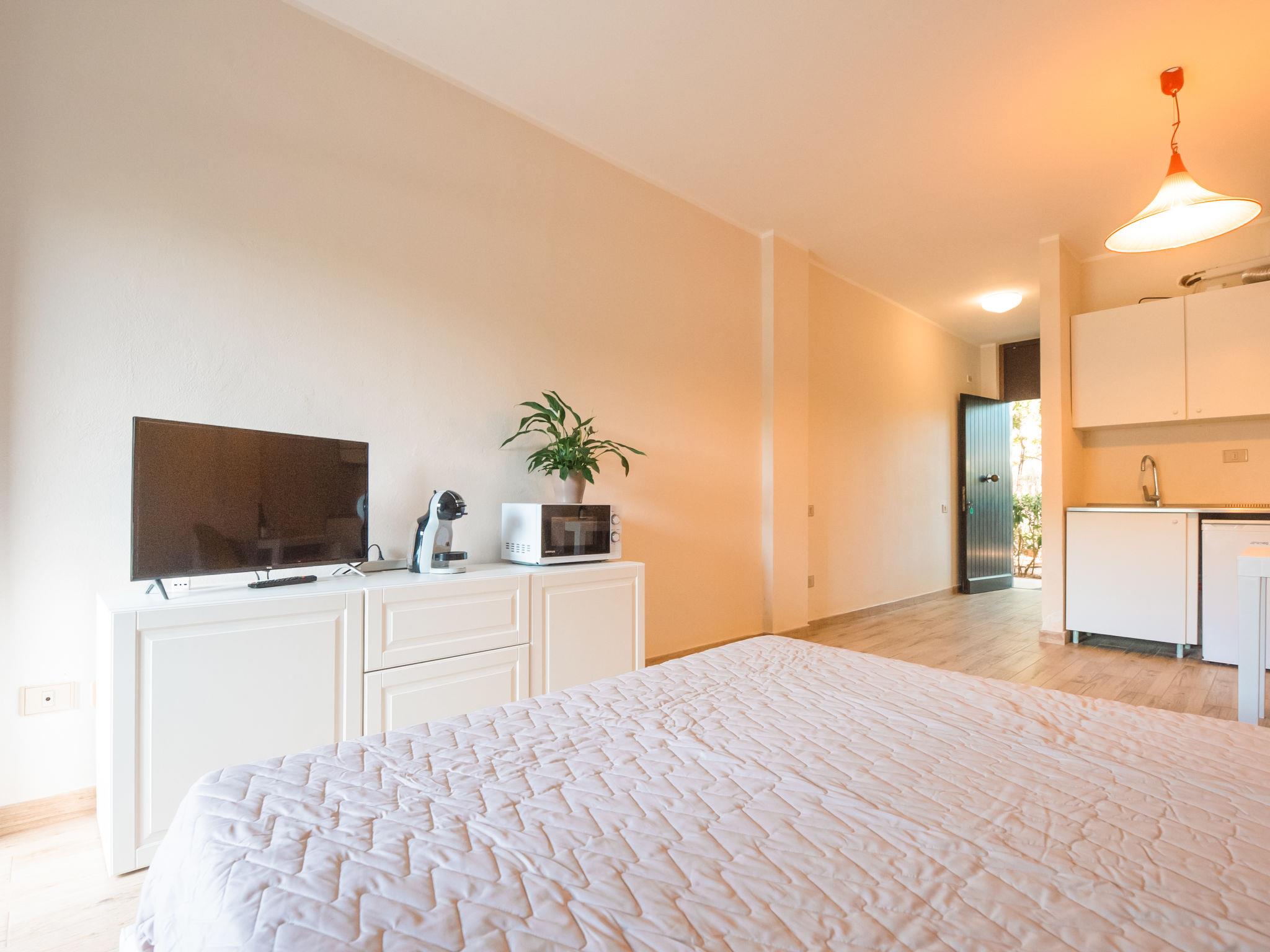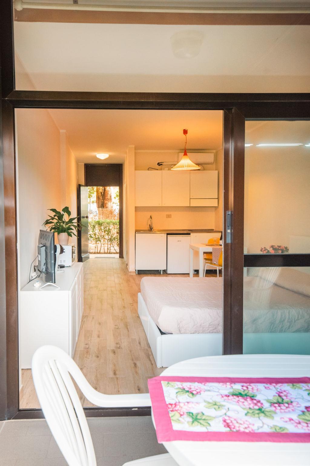 "Mono Garden", 1-Zimmer-Wohnung 25 m2, im Erdgeschoss. Renoviert im Jahre 2021, schön und modern eingerichtet: Wohn-/Schlafzimmer mit 1 Doppelbett, Esstisch, Digital-TV, Flachbildschirm, E-Heizung und Klimaanlage. Ausgang zum Garten, zur Veranda. Kochnische (4 Induktionskochplatten, Mikrowelle, elektrische Kaffeemaschine, Kapseln für die Kaffeemaschine (Nescafe Dolce Gusto) extra). Dusche/Bidet/WC. Terrasse 7 m2, überdacht, kleiner Gartensitzplatz. Terrassenmöbel. Sicht auf das Schwimmbad. Zur Verfügung: Kinderhochstuhl, Babybett bis 2 Jahre (extra), Haartrockner. Internet (Wireless LAN, gratis). IT049001B4AEH7IC3H