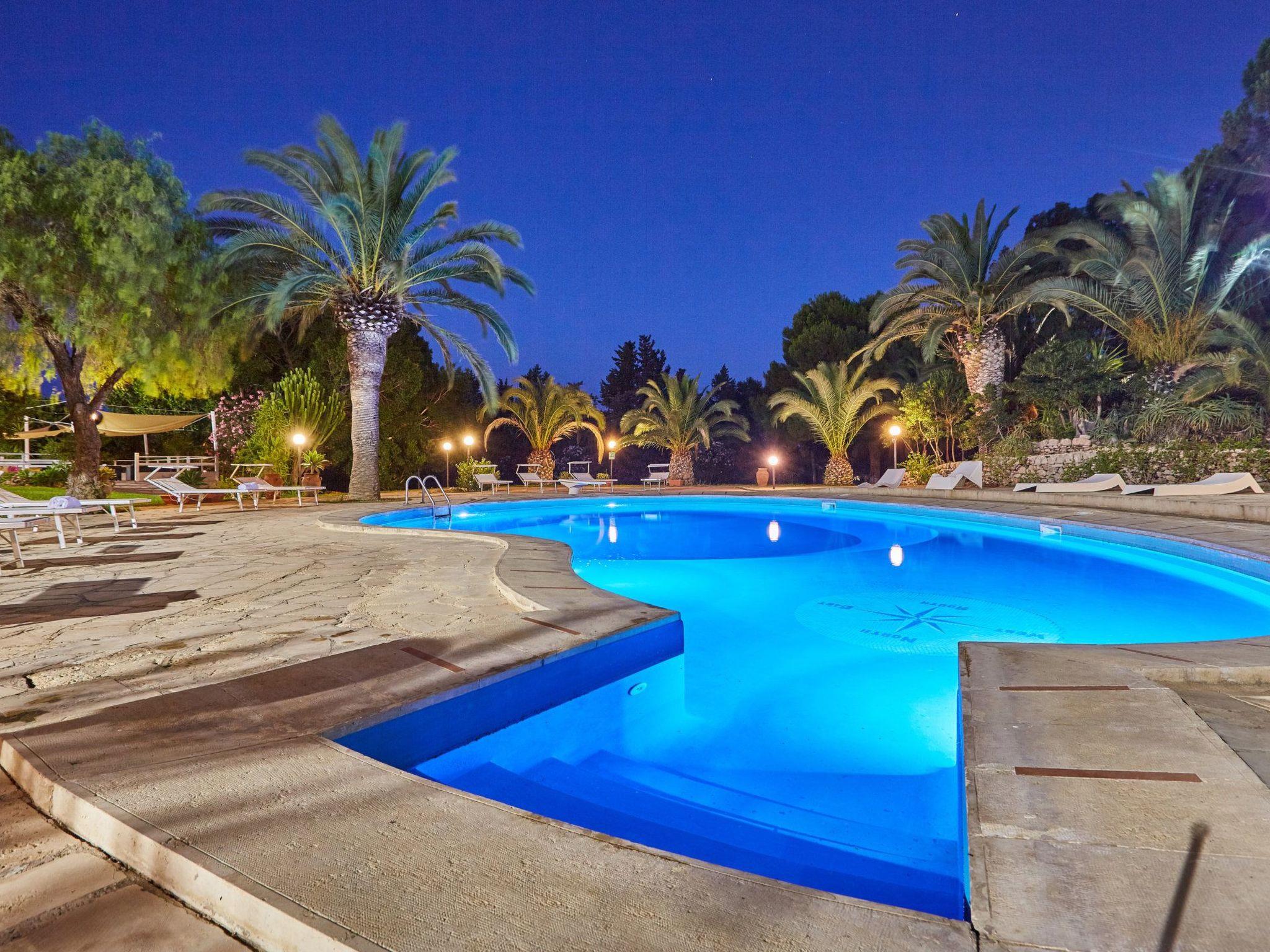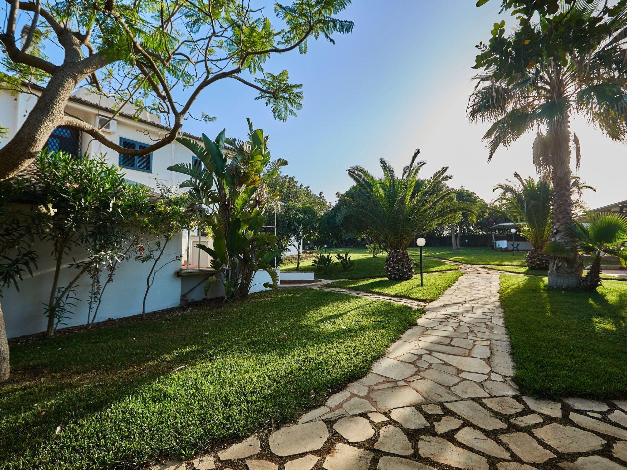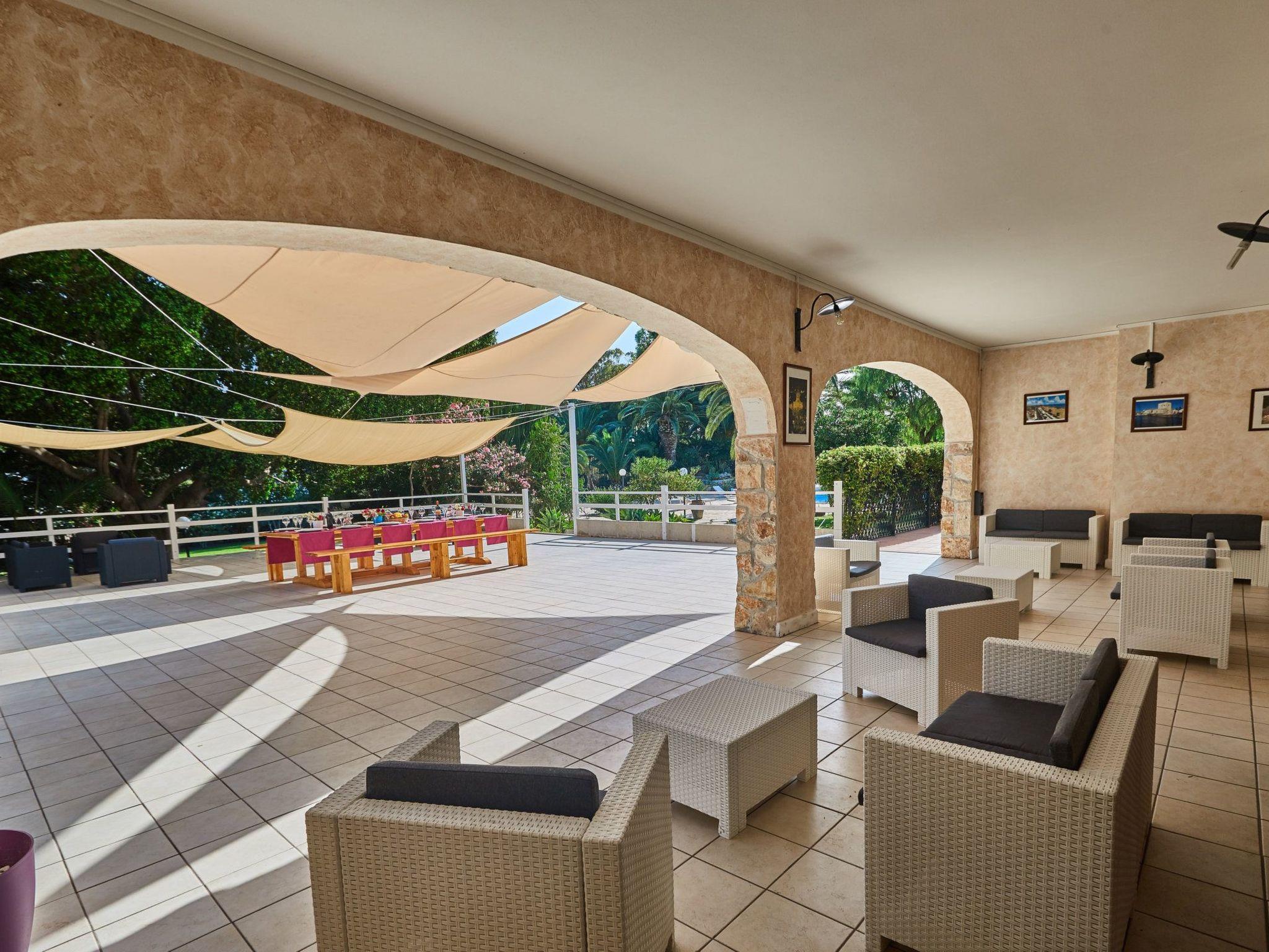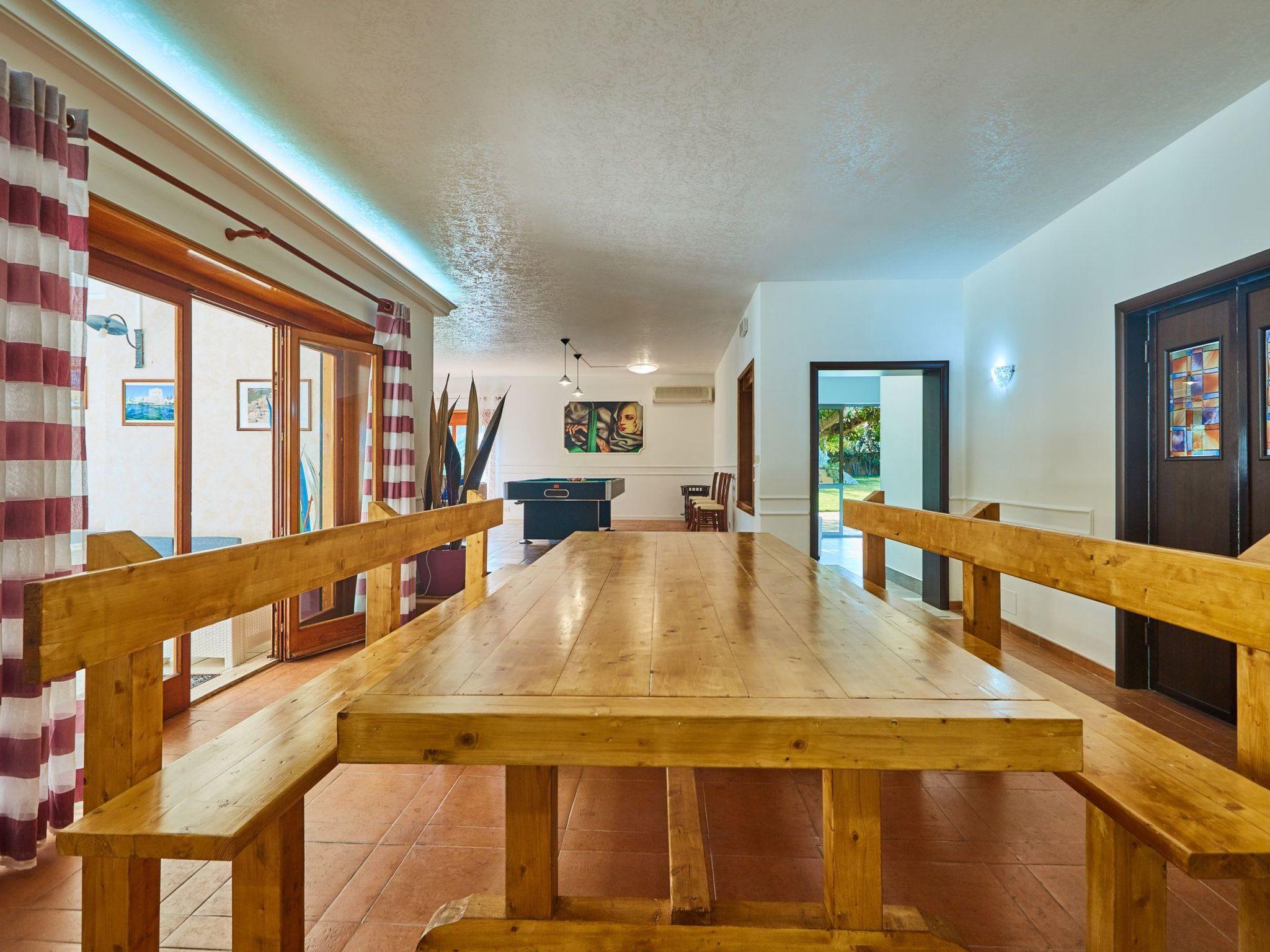 Von dem Raum, in dem sich der große Tisch befindet, gelangt man in einen etwa 50 Quadratmeter großen Innenhof mit Polirattan-Sesseln und einem Tisch für 20 Personen, wo man abends in der Kühle des Parks speisen kann. Sobald man das Eingangstor durchschreitet, hat man das Gefühl, an einem wunderschönen Ort angekommen zu sein, denn den Gästen steht eine 10.000 Quadratmeter große Rasenfläche zur Verfügung, die mit Palmen und jahrhundertealten Johannisbrotbäumen sowie vielen anderen mediterranen Pflanzenarten geschmückt und verziert ist. Der Park ist von Wegen aus einheimischen weißen Steinen durchzogen, so dass er bereits wie ein Gemälde wirkt. Dann finden wir einen Pavillon mit einem sehr großen Holztisch zum Grillen und in unmittelbarer Nähe grenzt ein weiterer Bereich an, in dem sich eine schöne Tischtennisplatte befindet, und weiter hinten gibt es zur Freude der Kleinen einen kleinen Spielplatz. Wenn man den Spaziergang fortsetzt, kommt man zum Herzstück des Parks, einem großen, unregelmäßigen Schwimmbad mit Liegestühlen und Sonnenschirmen rundherum und 2 runden, schmiedeeisernen Tischen mit Stühlen, so dass man Tage in absoluter Entspannung verbringen kann. Etwa 15 Meter entfernt befindet sich eine halb überdachte Terrasse mit Segeln und Polirattan-Liegen, die an die Küche angrenzt.