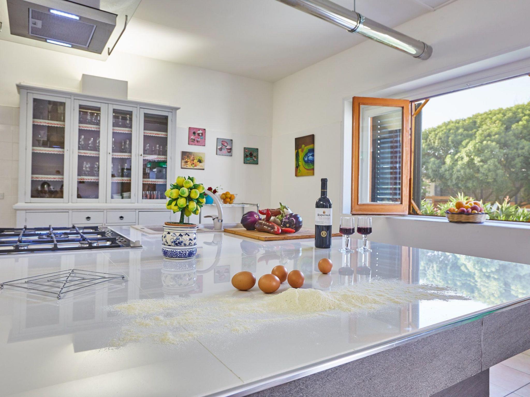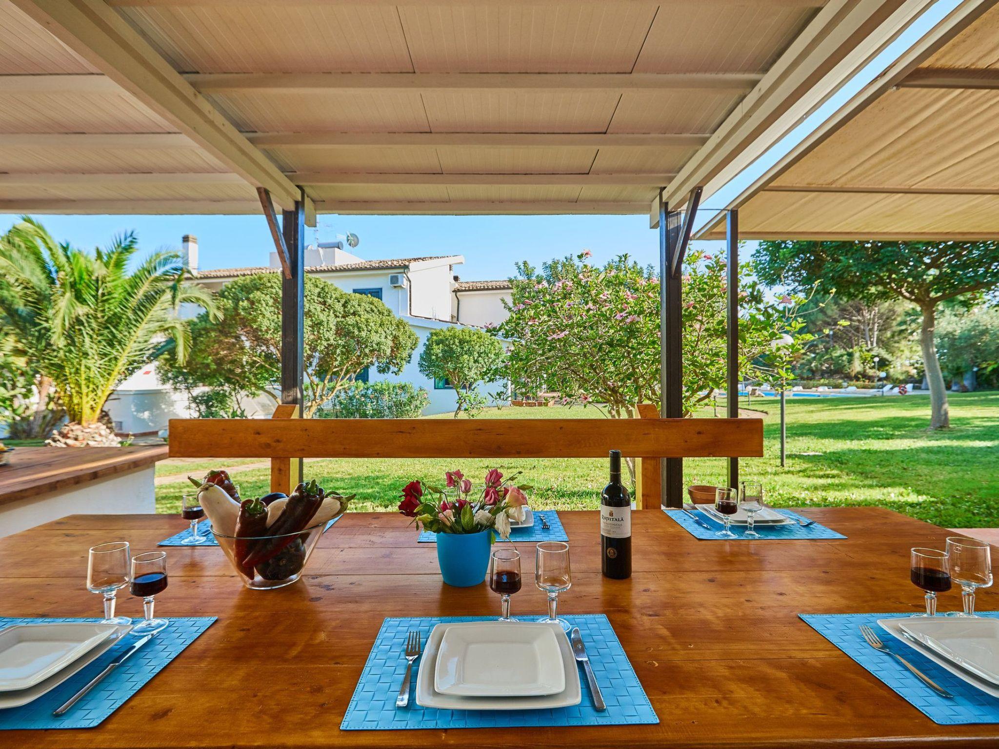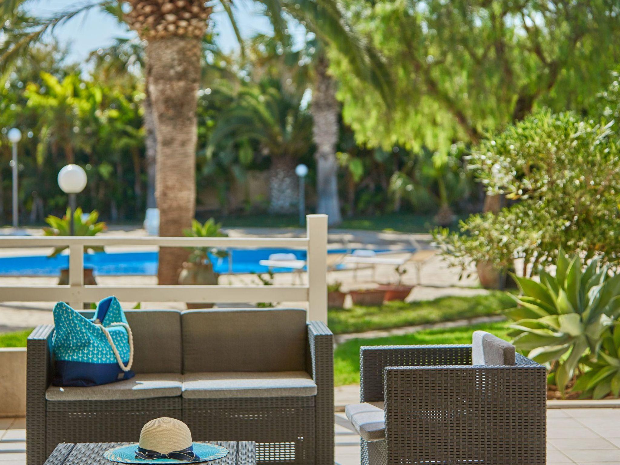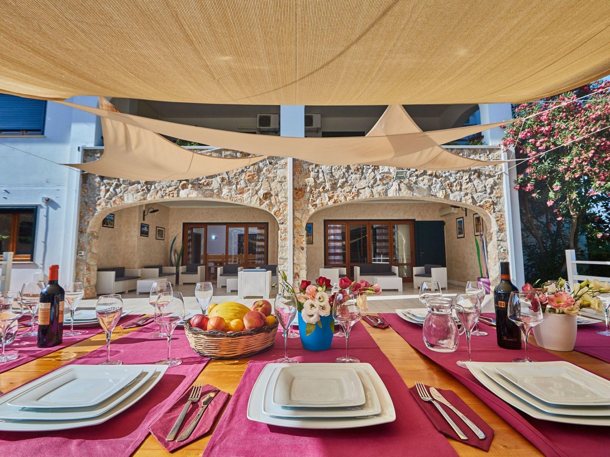 Von dem Raum, in dem sich der große Tisch befindet, gelangt man in einen etwa 50 Quadratmeter großen Innenhof mit Polirattan-Sesseln und einem Tisch für 20 Personen, wo man abends in der Kühle des Parks speisen kann. Sobald man das Eingangstor durchschreitet, hat man das Gefühl, an einem wunderschönen Ort angekommen zu sein, denn den Gästen steht eine 10.000 Quadratmeter große Rasenfläche zur Verfügung, die mit Palmen und jahrhundertealten Johannisbrotbäumen sowie vielen anderen mediterranen Pflanzenarten geschmückt und verziert ist. Der Park ist von Wegen aus einheimischen weißen Steinen durchzogen, so dass er bereits wie ein Gemälde wirkt. Dann finden wir einen Pavillon mit einem sehr großen Holztisch zum Grillen und in unmittelbarer Nähe grenzt ein weiterer Bereich an, in dem sich eine schöne Tischtennisplatte befindet, und weiter hinten gibt es zur Freude der Kleinen einen kleinen Spielplatz. Wenn man den Spaziergang fortsetzt, kommt man zum Herzstück des Parks, einem großen, unregelmäßigen Schwimmbad mit Liegestühlen und Sonnenschirmen rundherum und 2 runden, schmiedeeisernen Tischen mit Stühlen, so dass man Tage in absoluter Entspannung verbringen kann. Etwa 15 Meter entfernt befindet sich eine halb überdachte Terrasse mit Segeln und Polirattan-Liegen, die an die Küche angrenzt.