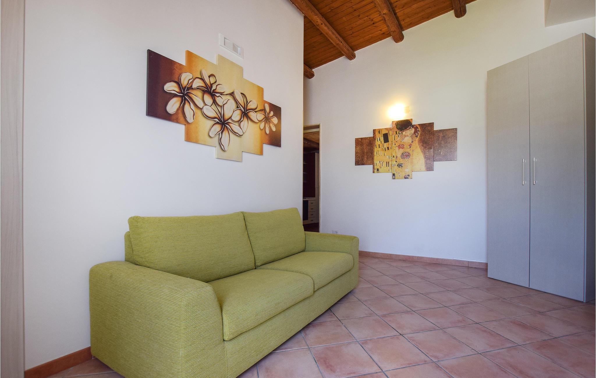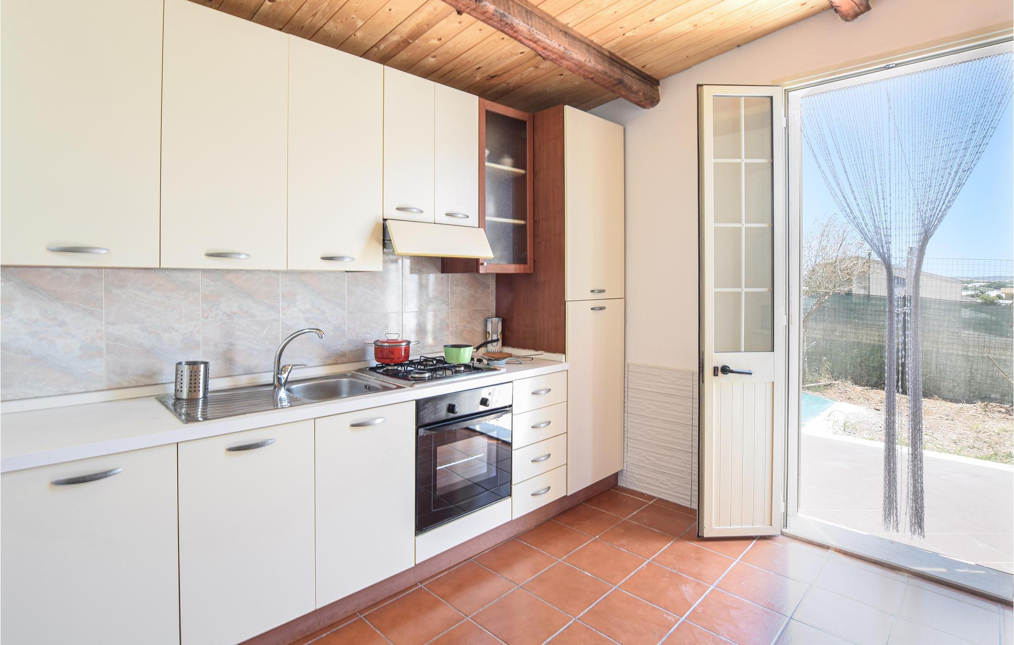 In einem Wohngebiet befindet sich diese Doppelhaushälfte mit unabhängigem Eingang, Außenbereich mit Liegestühlen und Gartentischen und überdachter Veranda mit Tisch und Stühlen für Mahlzeiten im Freien. Im Inneren befinden sich ein Wohnzimmer mit einem Schlafsofa, ein Schlafzimmer mit Doppelbett und einem versenkbaren begehbaren Kleiderschrank sowie eine Küche mit Zugang nach außen, auf der sich eine Veranda befindet (Rückseite des Hauses).