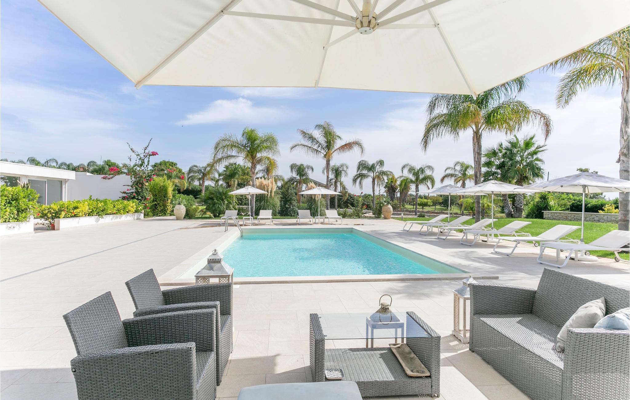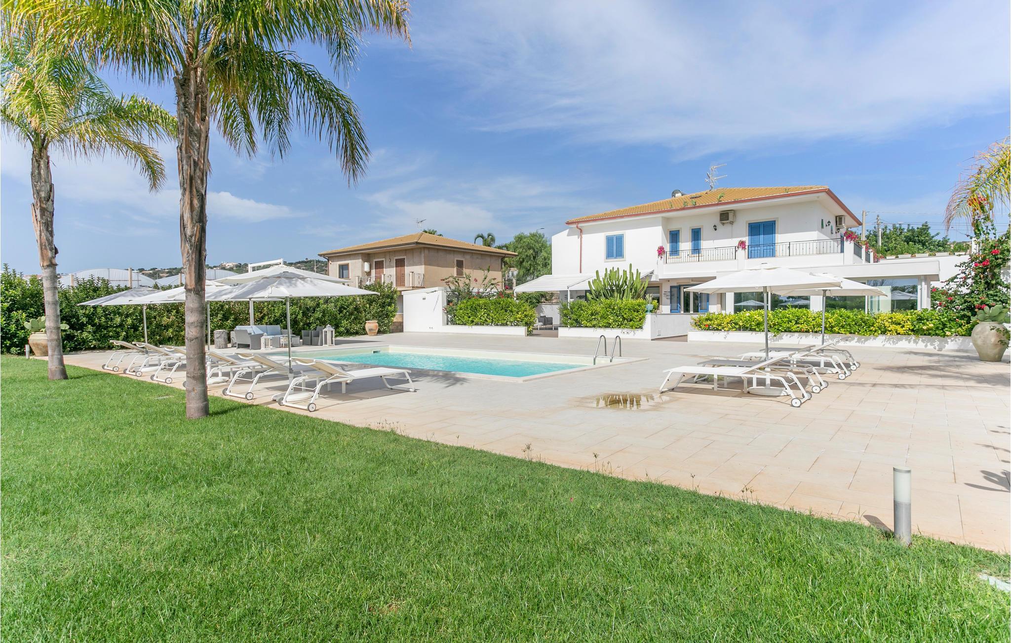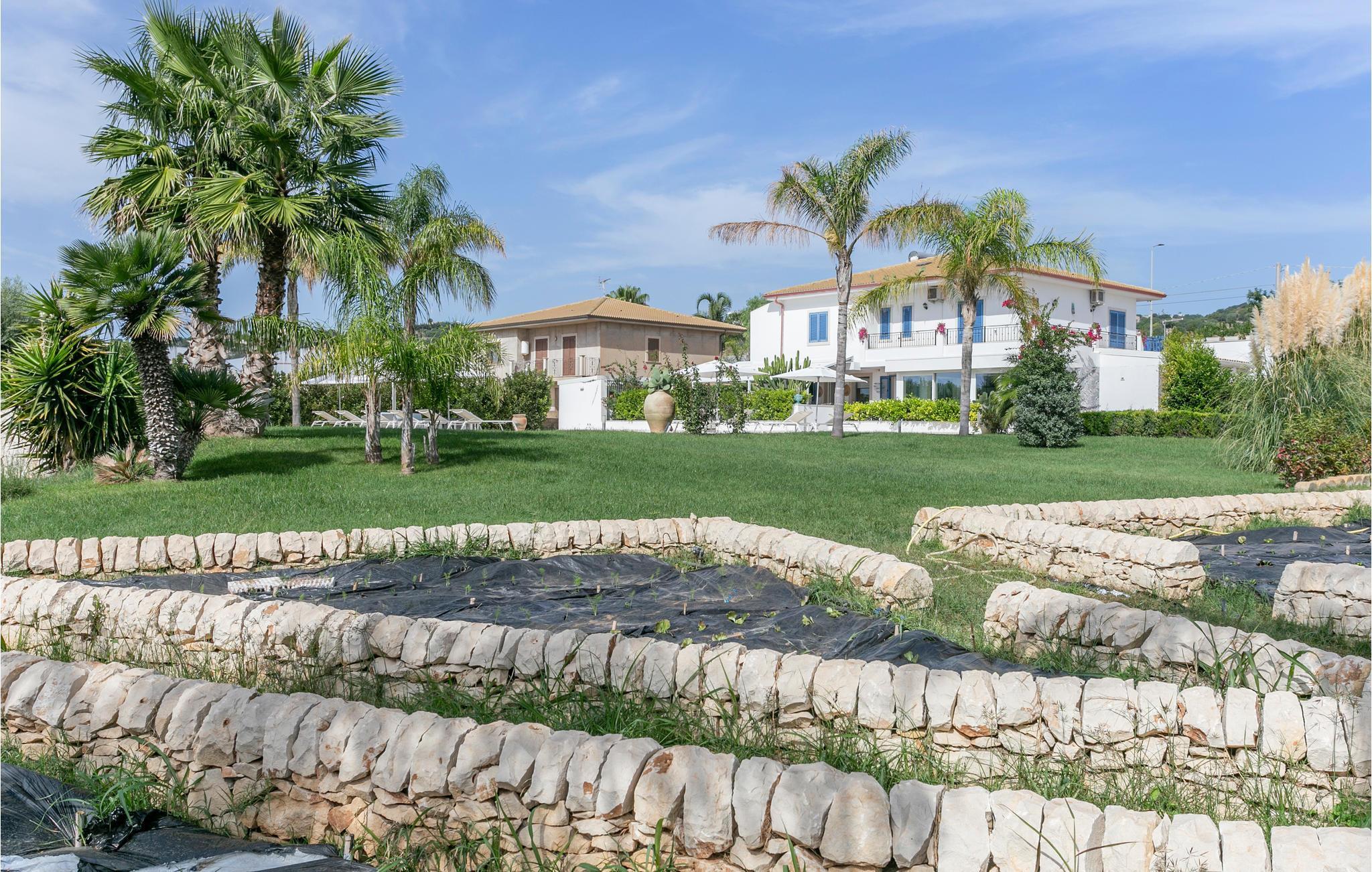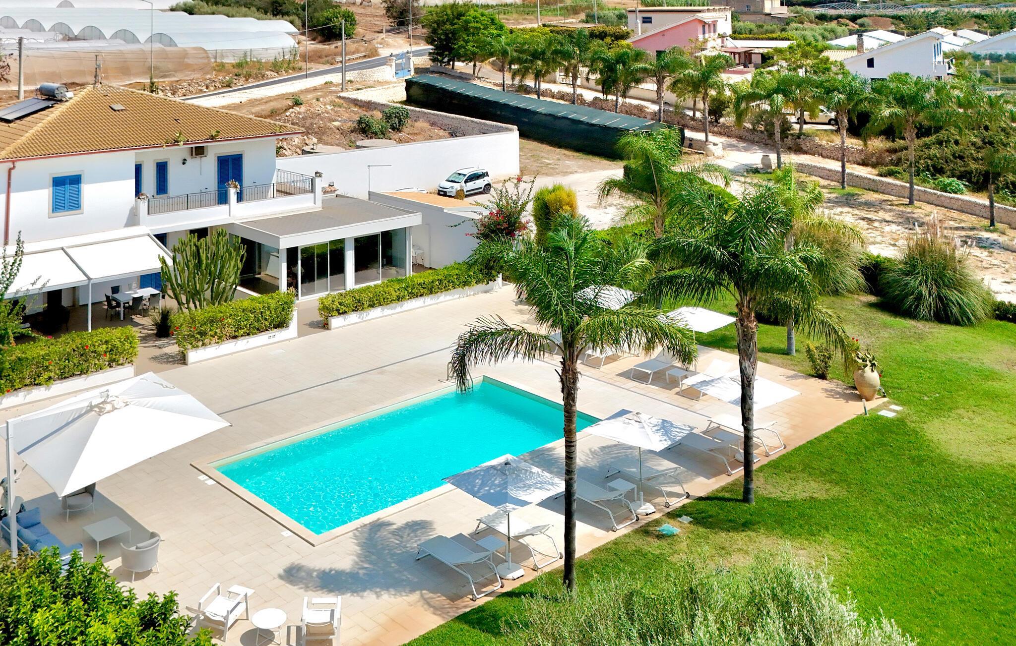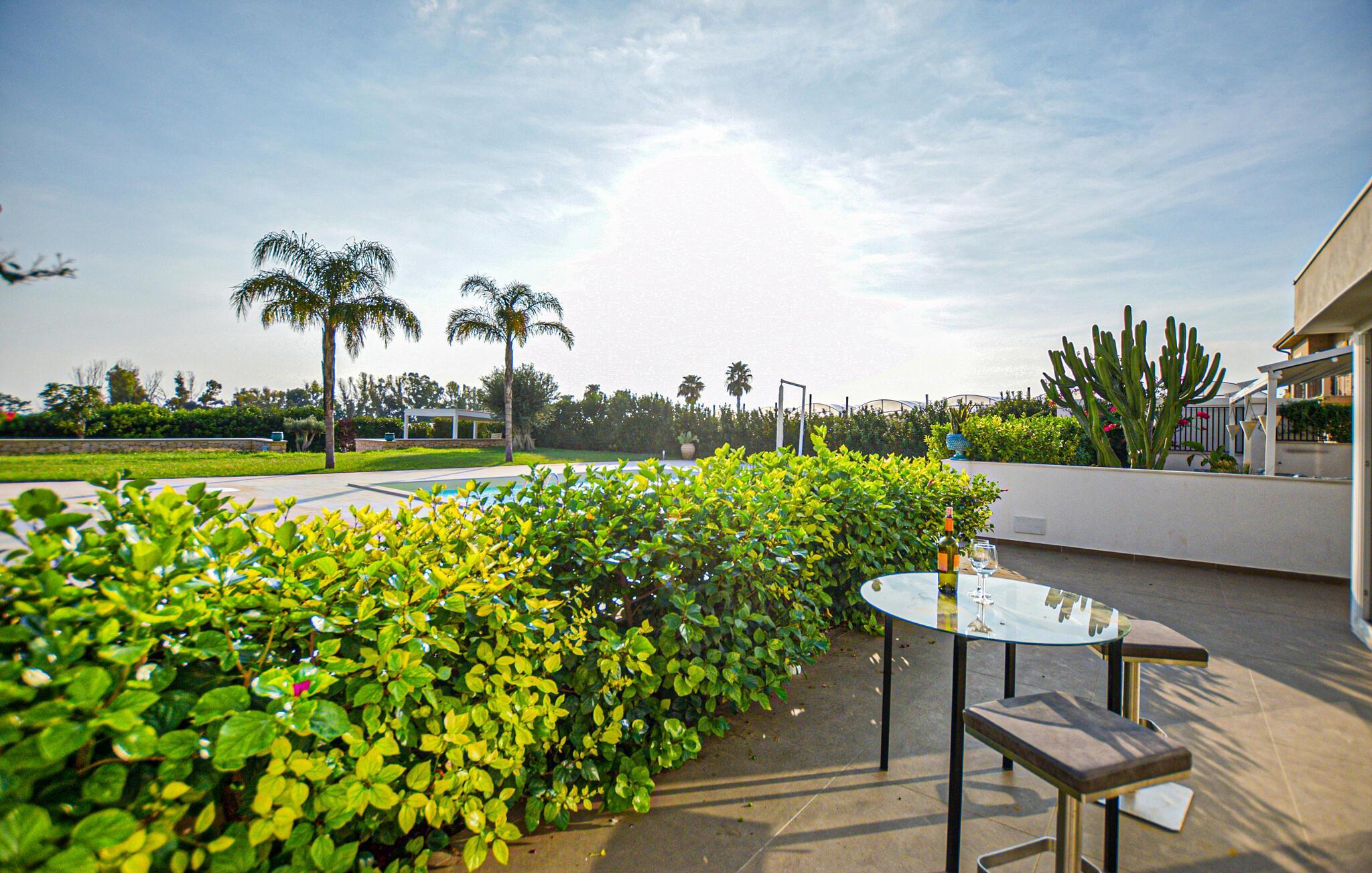 In der Nähe von Marina di Ragusa, nur wenige hundert Meter von der Mündung des Flusses Irminio und dem Naturschutzgebiet Irminio - bekannt als Beobachtungspunkt für Zugvögel aus dem nahen Afrika - befindet sich diese elegante Ferienunterkunft. Sie liegt inmitten eines großen Grundstücks von ca. 5000 m2, das zum Teil unberührt ist - entsprechend den Vorschriften des Naturschutzgebietes - und zum Teil mit Rasen, Steinmauern und Palmen bepflanzt ist. Den Gästen steht ein Pool mit Sonnenterrasse, Liegestühlen und Sonnenschirmen zur Verfügung. Vor dem Haus befinden sich zwei weitere ausgestattete Veranden, von denen eine mit einem großen Sonnenschirm und die andere mit einer festen Abdeckung versehen ist. Beide sind auch mit Tisch, Stühlen und Sitzgelegenheiten zum Entspannen mit Blick auf den Pool ausgestattet.