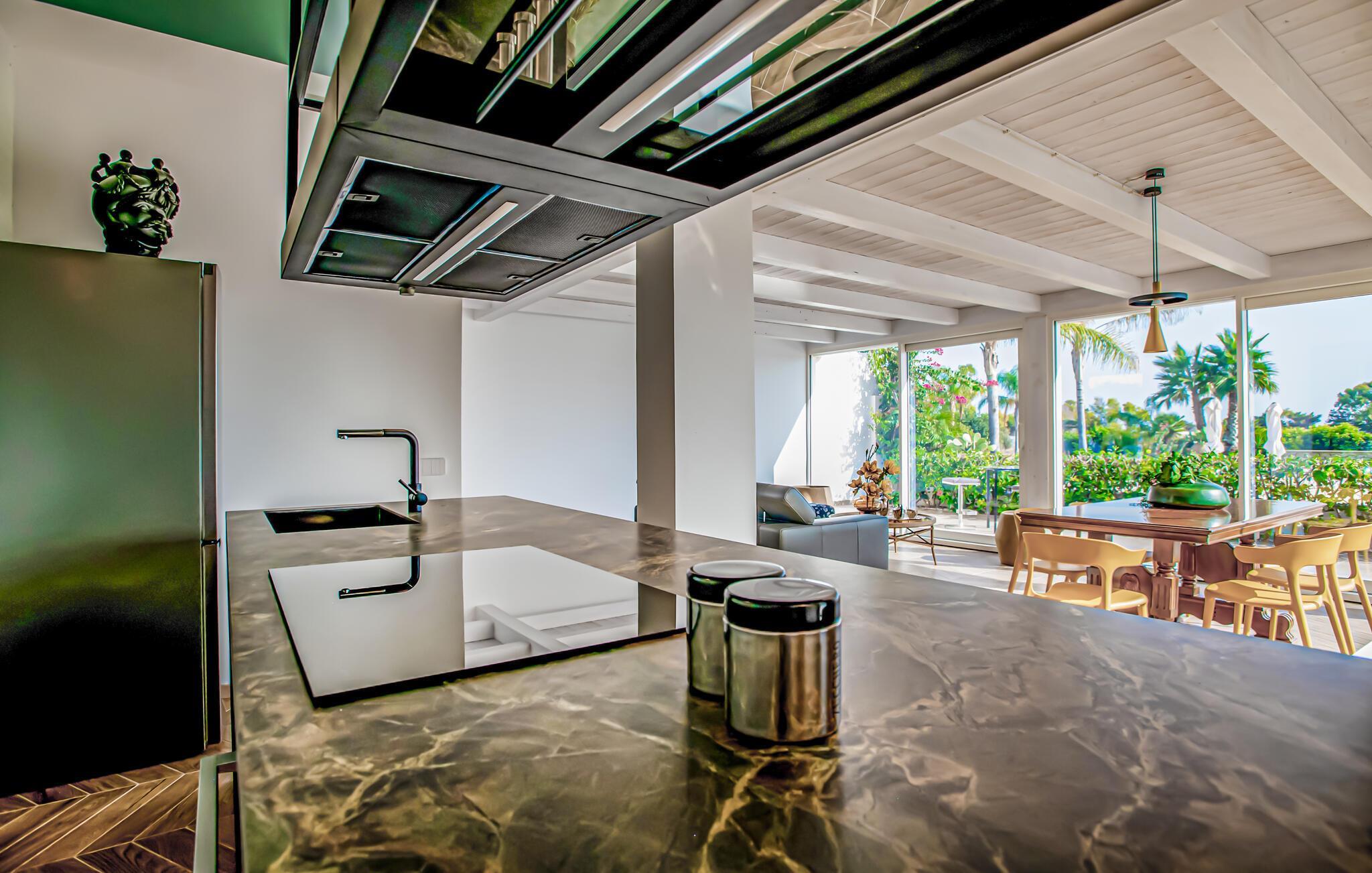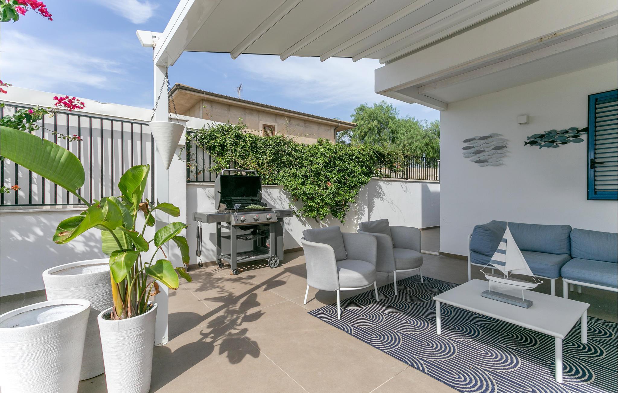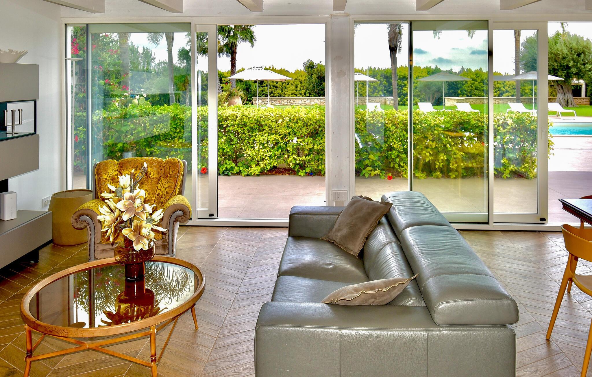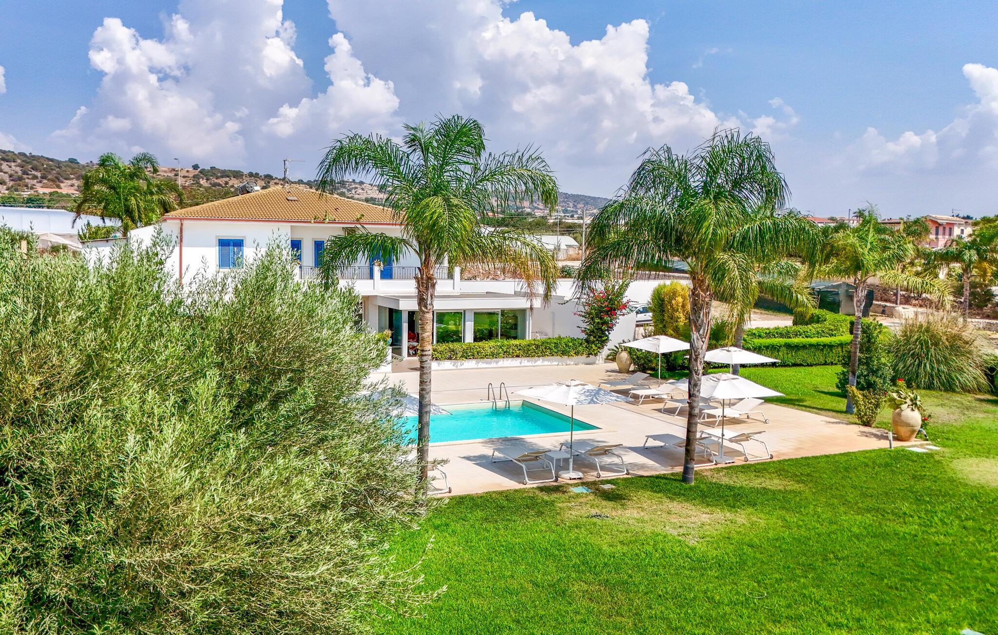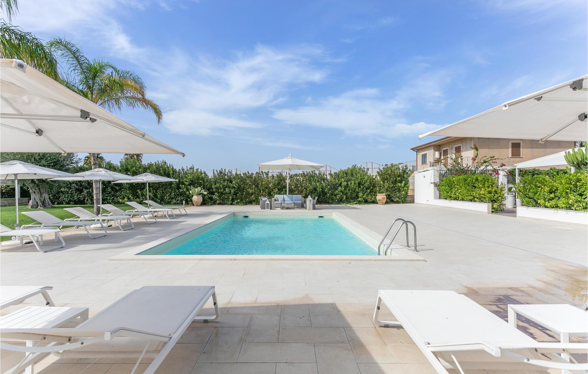 In der Nähe von Marina di Ragusa, nur wenige hundert Meter von der Mündung des Flusses Irminio und dem Naturschutzgebiet Irminio - bekannt als Beobachtungspunkt für Zugvögel aus dem nahen Afrika - befindet sich diese elegante Ferienunterkunft. Sie liegt inmitten eines großen Grundstücks von ca. 5000 m2, das zum Teil unberührt ist - entsprechend den Vorschriften des Naturschutzgebietes - und zum Teil mit Rasen, Steinmauern und Palmen bepflanzt ist. Den Gästen steht ein Pool mit Sonnenterrasse, Liegestühlen und Sonnenschirmen zur Verfügung. Vor dem Haus befinden sich zwei weitere ausgestattete Veranden, von denen eine mit einem großen Sonnenschirm und die andere mit einer festen Abdeckung versehen ist. Beide sind auch mit Tisch, Stühlen und Sitzgelegenheiten zum Entspannen mit Blick auf den Pool ausgestattet.