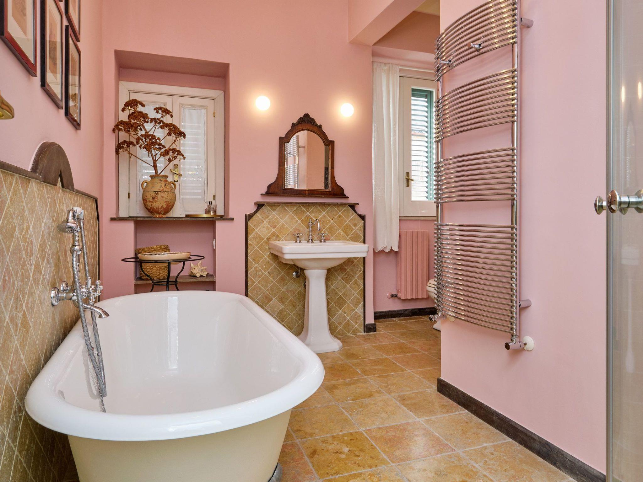 Ein großes, luxuriöses Badezimmer mit Dusche und eleganter Badewanne im antiken Stil (Badewanne nicht verfügbar).