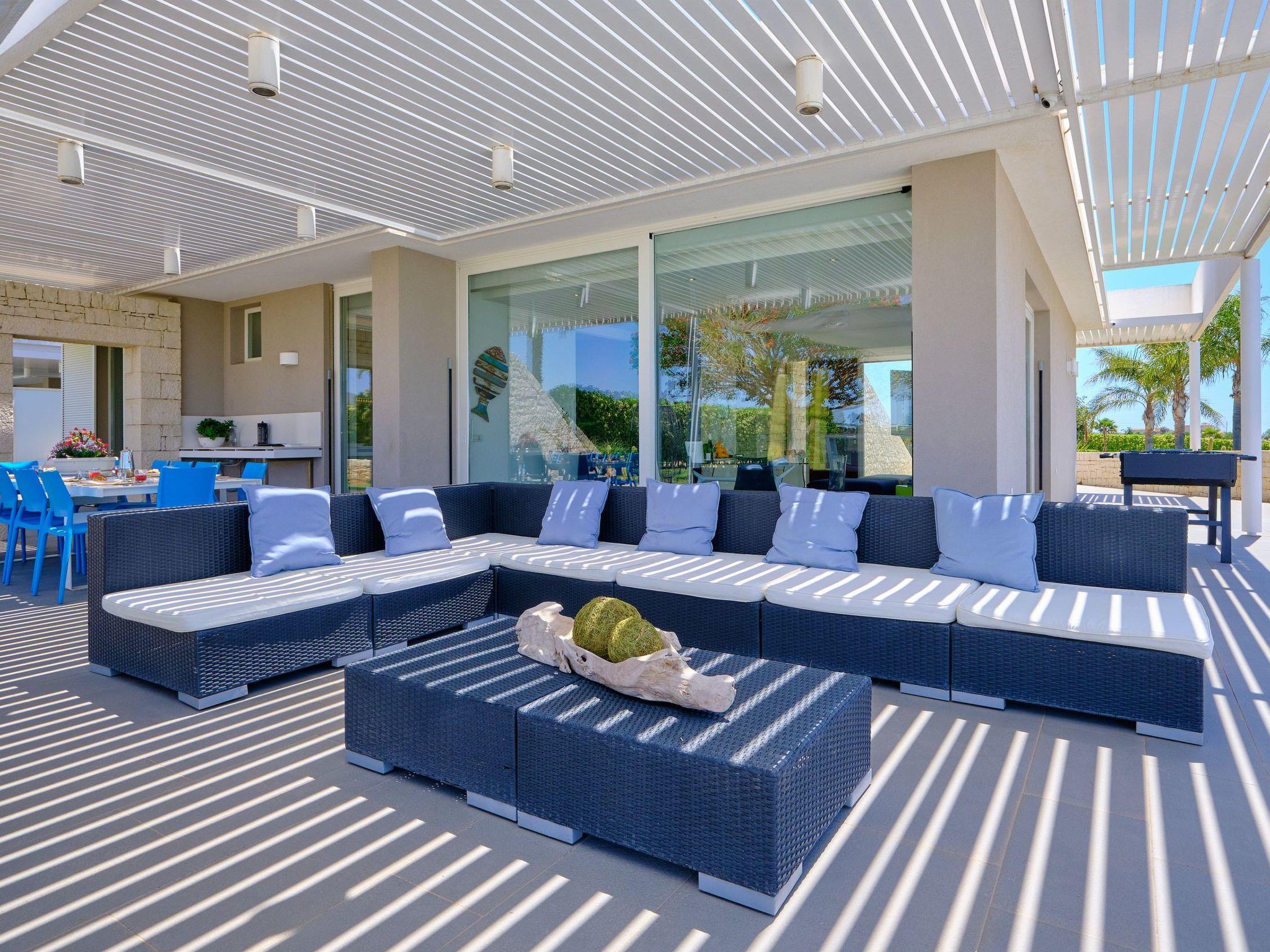 Der Wohnbereich ist lichtdurchflutet mit Blick auf den Pool und Garten. Der große Aufenthaltsbereich ist mit einem Ecksofa sowie Satelliten-TV ausgestattet.