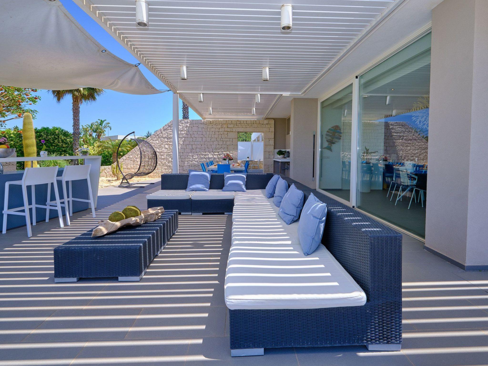 Eine elegante und möblierte Terrasse bietet eine Außenküche mit Grillmöglichkeit und Esstisch.
