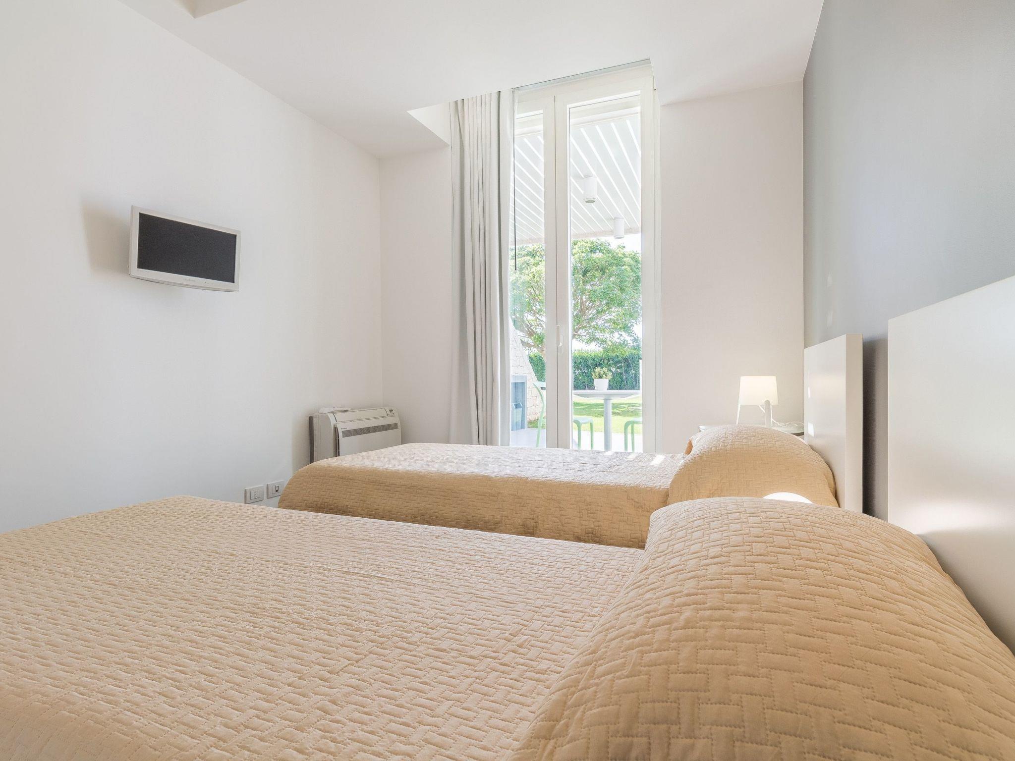 Zwei Zweibettzimmer mit TV blicken auf den Garten.