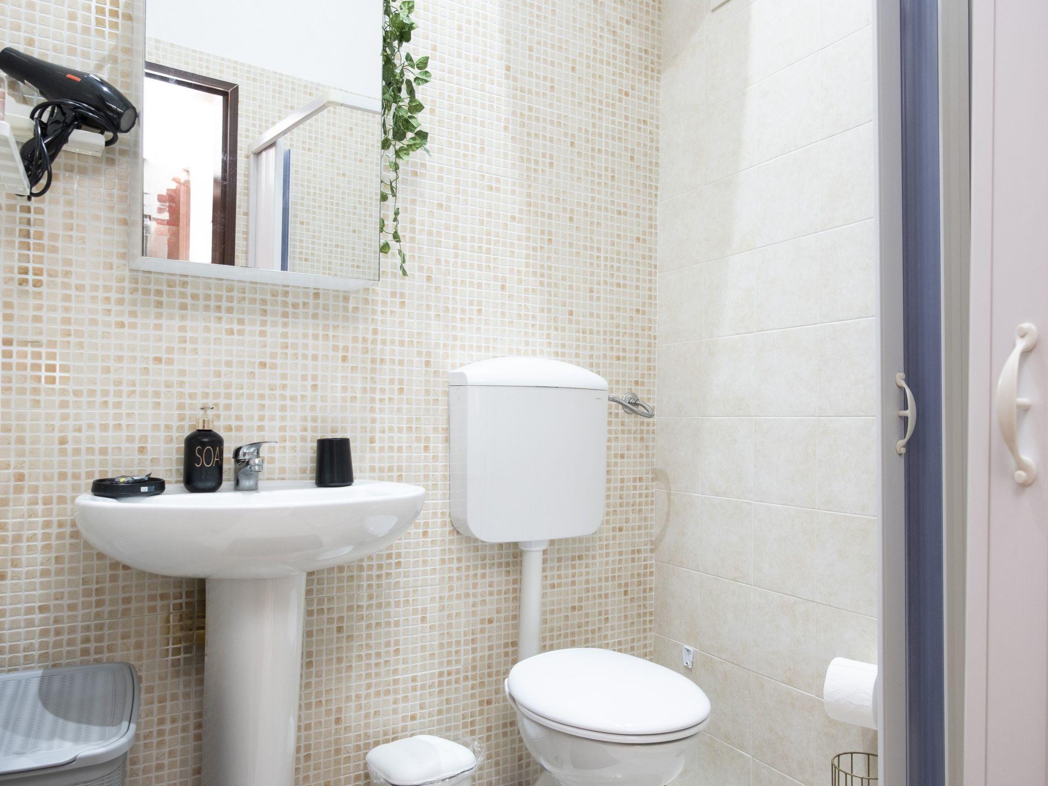 Das moderne, aber kleine Badezimmer ist mit einer funktionellen Dusche für Ihr tägliches Wohlbefinden ausgestattet.