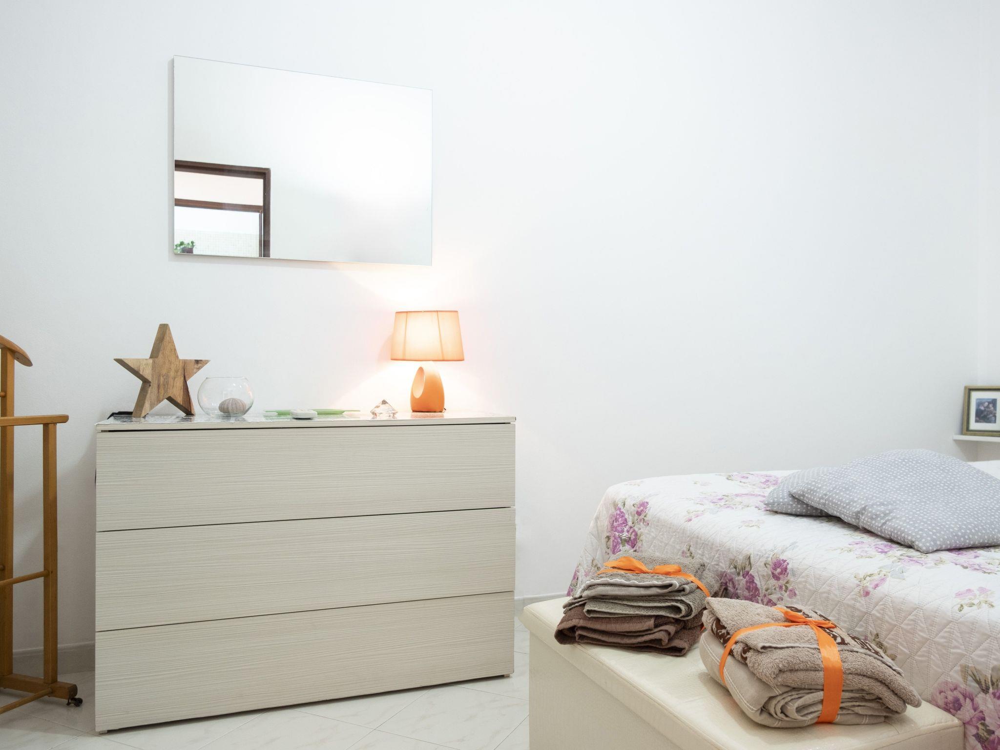 Das Schlafzimmer mit Doppelbett ist ein wahres Schmuckstück an Komfort, mit einer ergonomischen Matratze, die erholsame Nächte garantiert. Nachttische mit Lampen, Kleiderschränke und geräumige Schubladen zur Aufbewahrung Ihrer persönlichen Gegenstände vervollständigen die Einrichtung. Einen Hauch von Klasse verleiht das schöne Gemälde, das Michelangelos Erschaffung Adams darstellt und über dem Kopfende des Bettes angebracht ist. Das Zimmer ist klimatisiert, um auch an heißen sizilianischen Sommertagen maximalen Komfort zu gewährleisten.