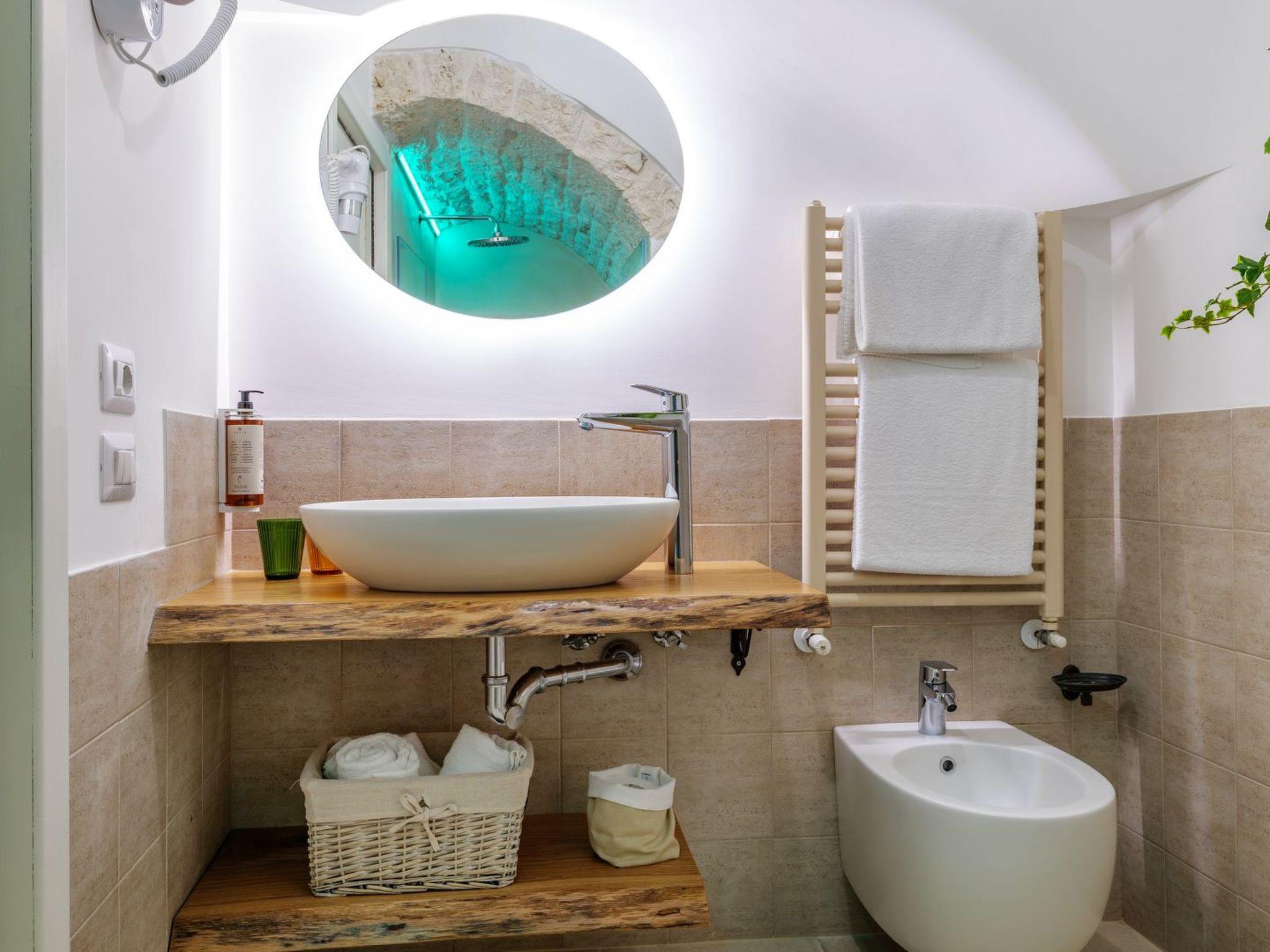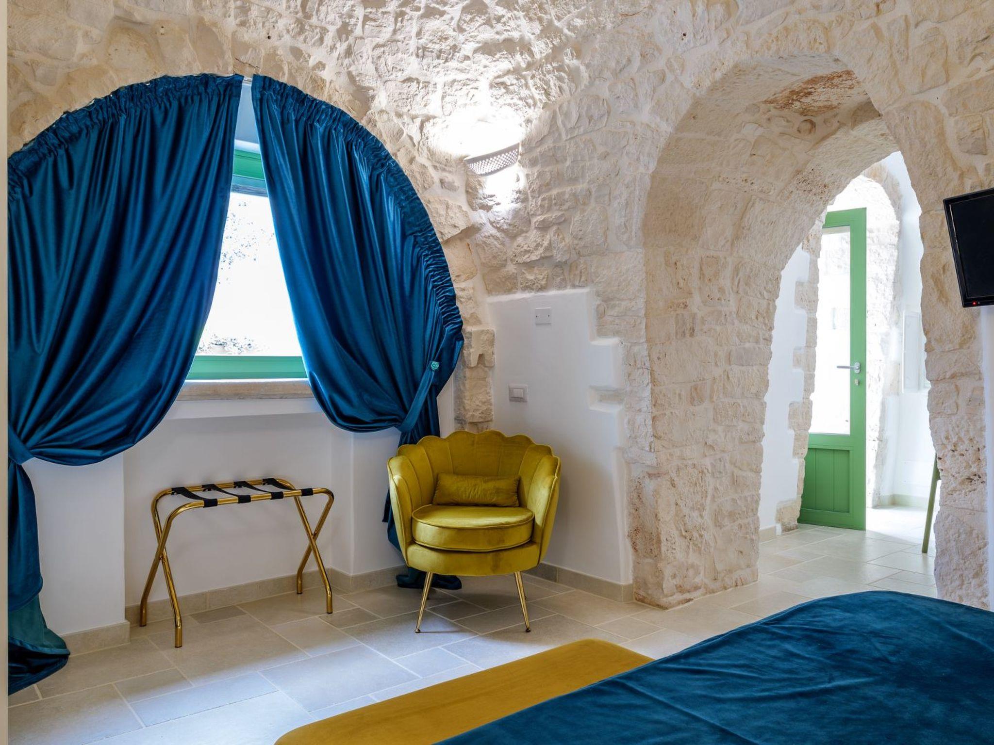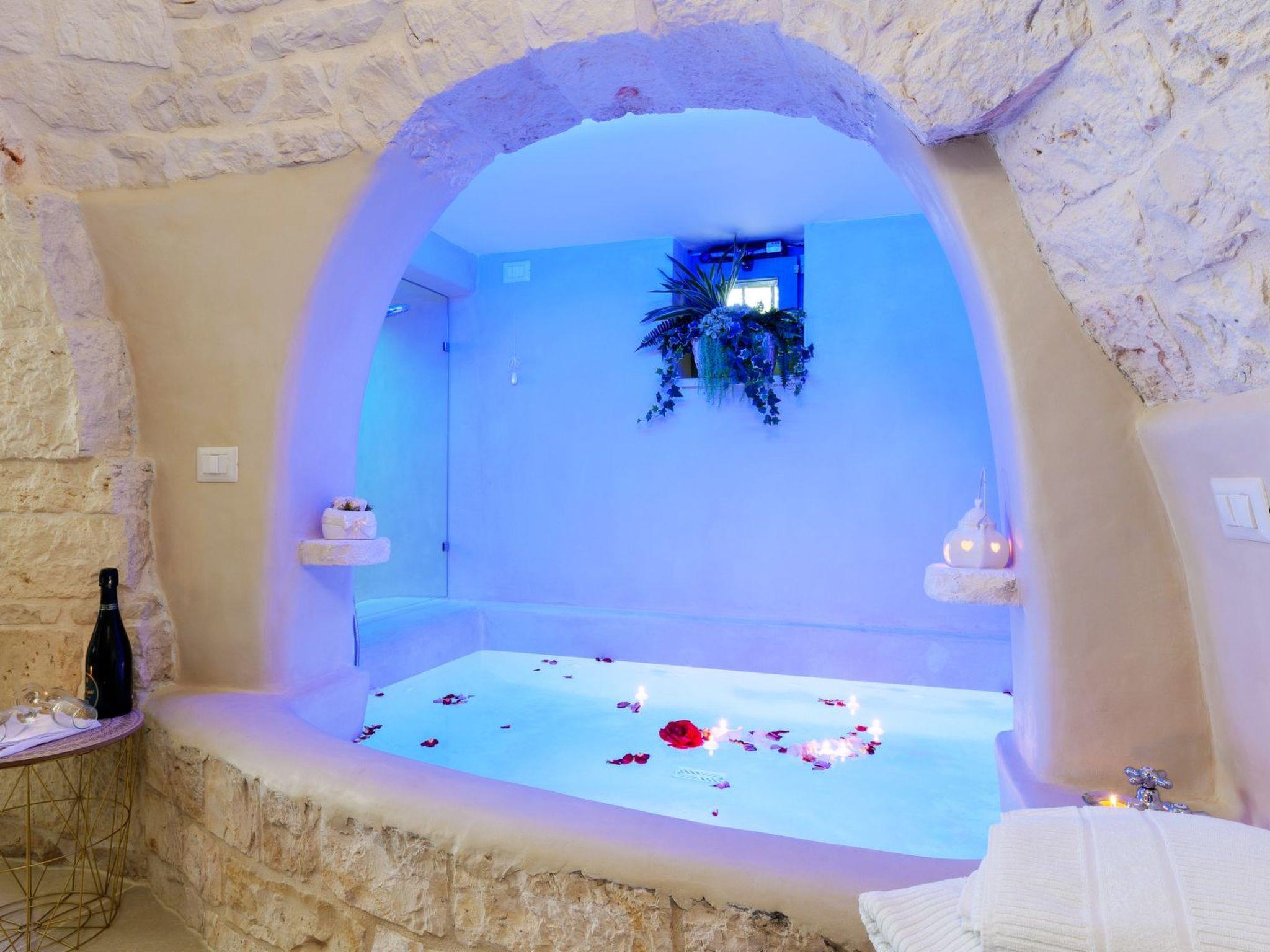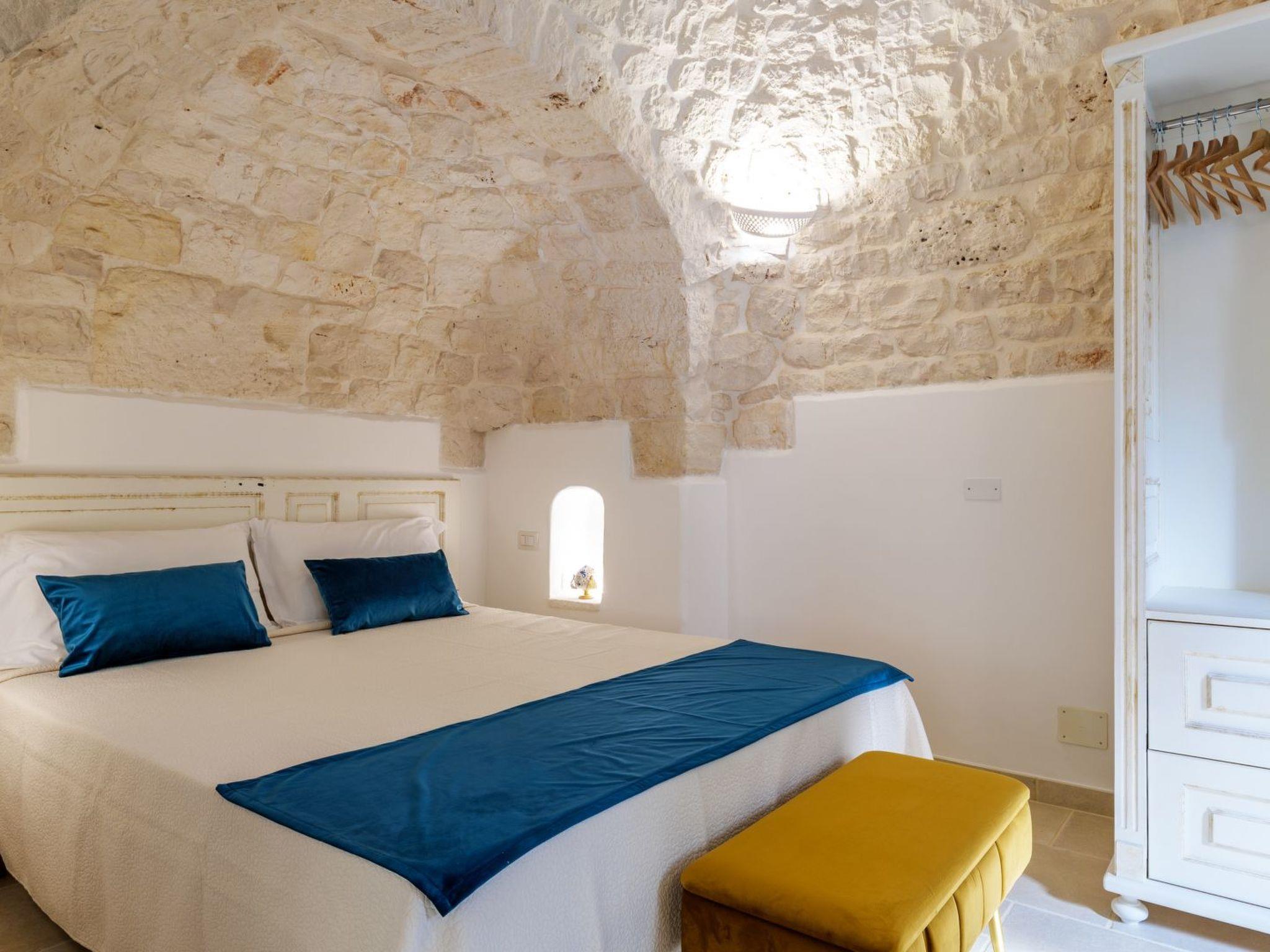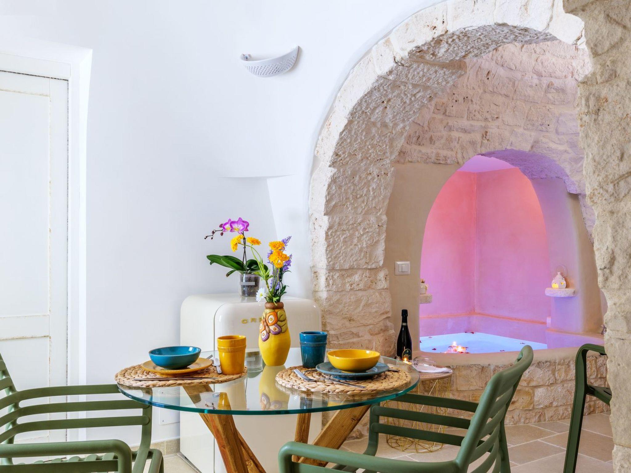 Der Trullo "Palmento", der vor kurzem zu einer romantischen Suite renoviert wurde, besteht aus einer Eingangshalle, einem Schlafzimmer mit Doppelbett, einem Badezimmer mit Dusche und Hydromassagewanne aus Stein und einer Entspannungsecke.