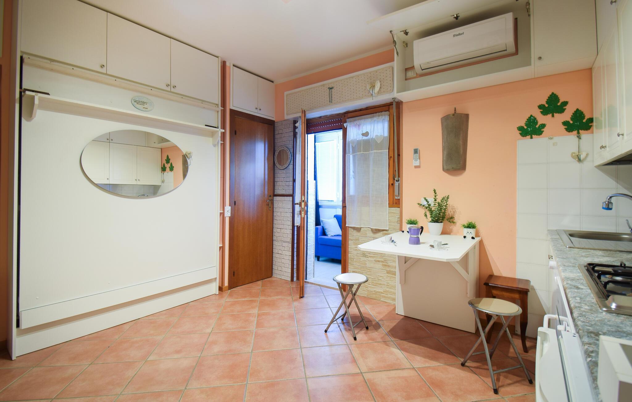 Genießen Sie Ihre Auszeit in diesem Studio-Appartement, die Ihnen eine ideale Kombination aus Strandnähe, urbanem Flair und gemütlicher Unterkunft bietet. Nutzen Sie den freundlich gestalteten Wohnbereich, der durch helle Farben und eine praktische Einrichtung überzeugt. Entspannen Sie auf der Sitzecke oder sehen Sie fern, wenn Sie einen ruhigen Abend verbringen möchten. Bereiten Sie in der praktischen Küche Ihre Lieblingsgerichte zu und genießen Sie diese am kleinen Esstisch.