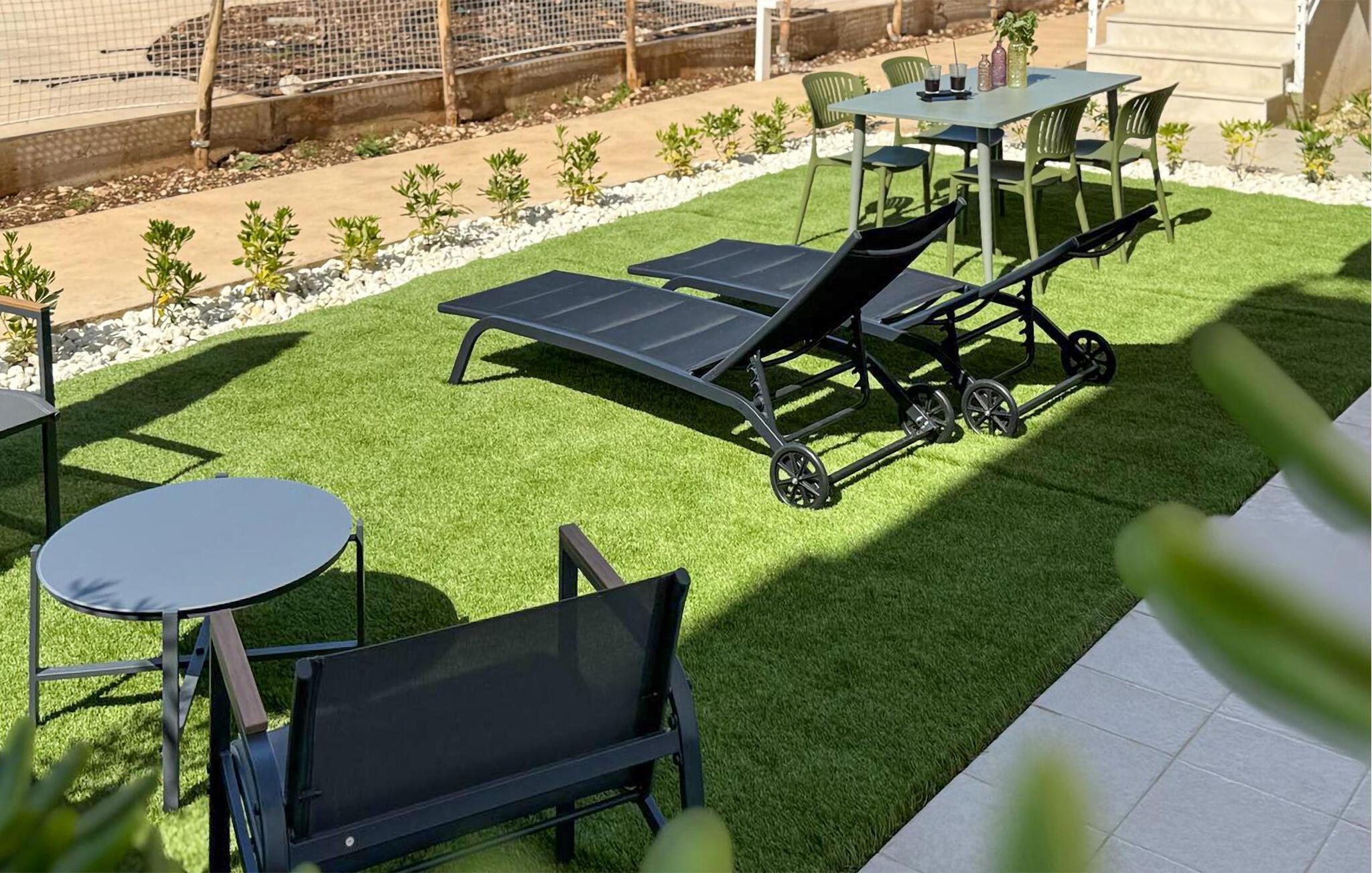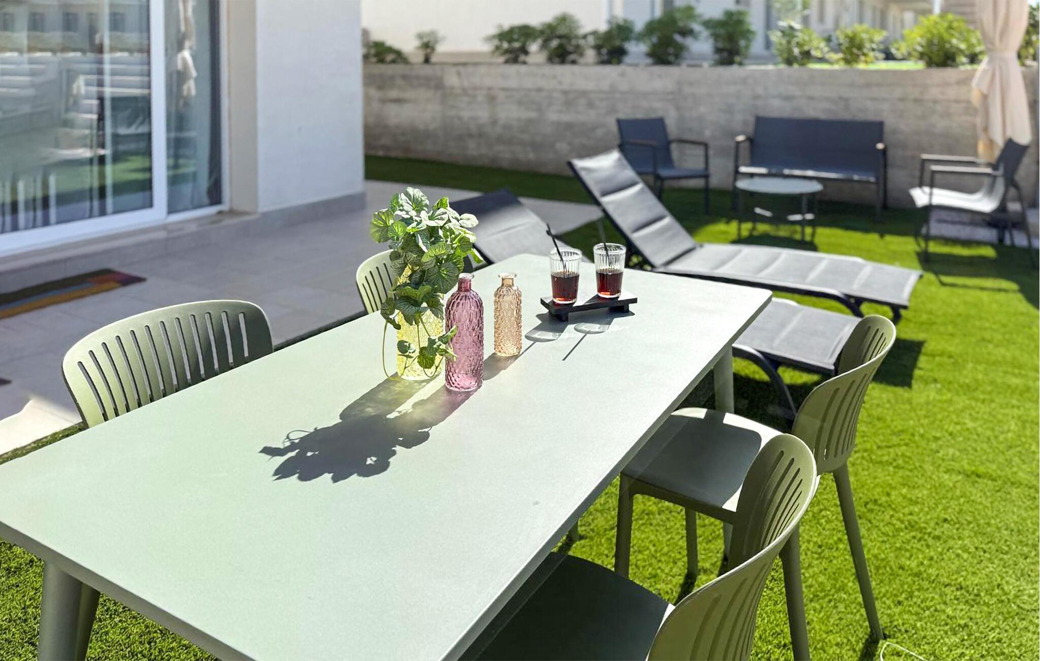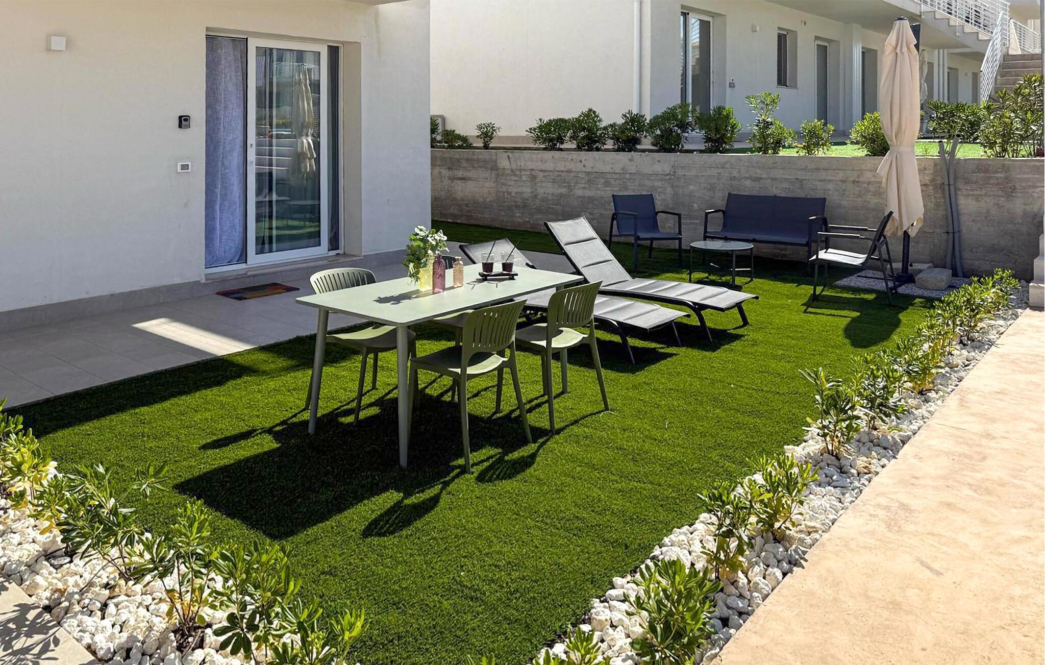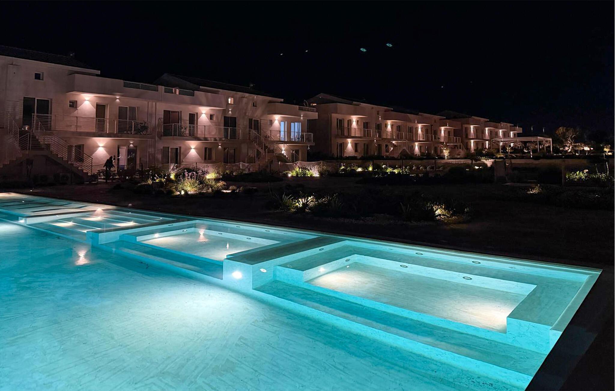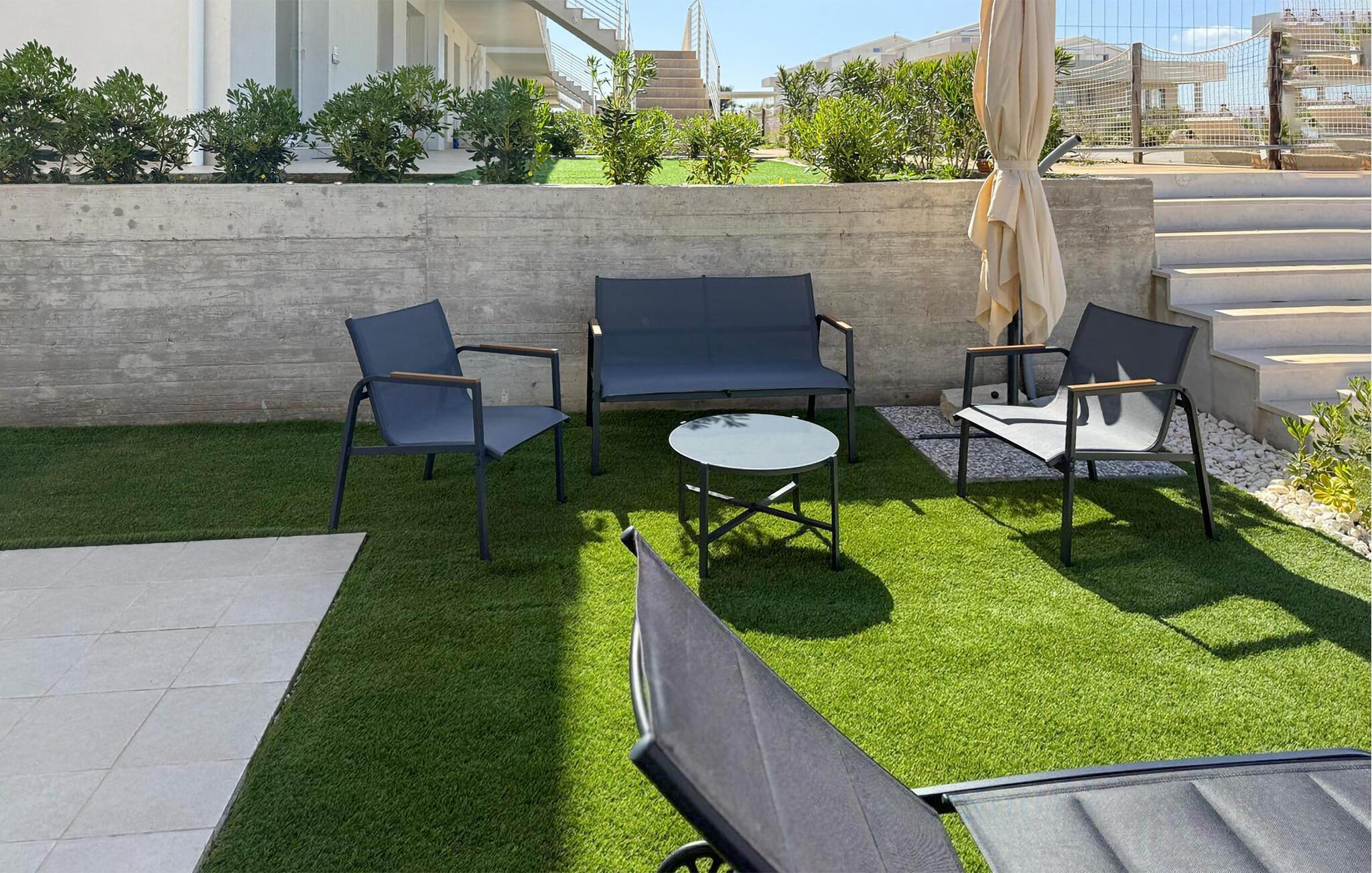 Der Pool, den Sie sich mit anderen teilen, sorgt jederzeit für eine erfrischende Abkühlung. Springen Sie schon morgens in ruhiger Atmosphäre ins glitzernde Wasser oder abends nach einem erlebnisreichen Tag. Sonnenliegen laden zum Entspannen ein, und wer Lust auf Bewegung hat, kann im Fitnessraum trainieren oder sich beim Beachvolleyball und Padeltennis mit anderen Gästen messen.