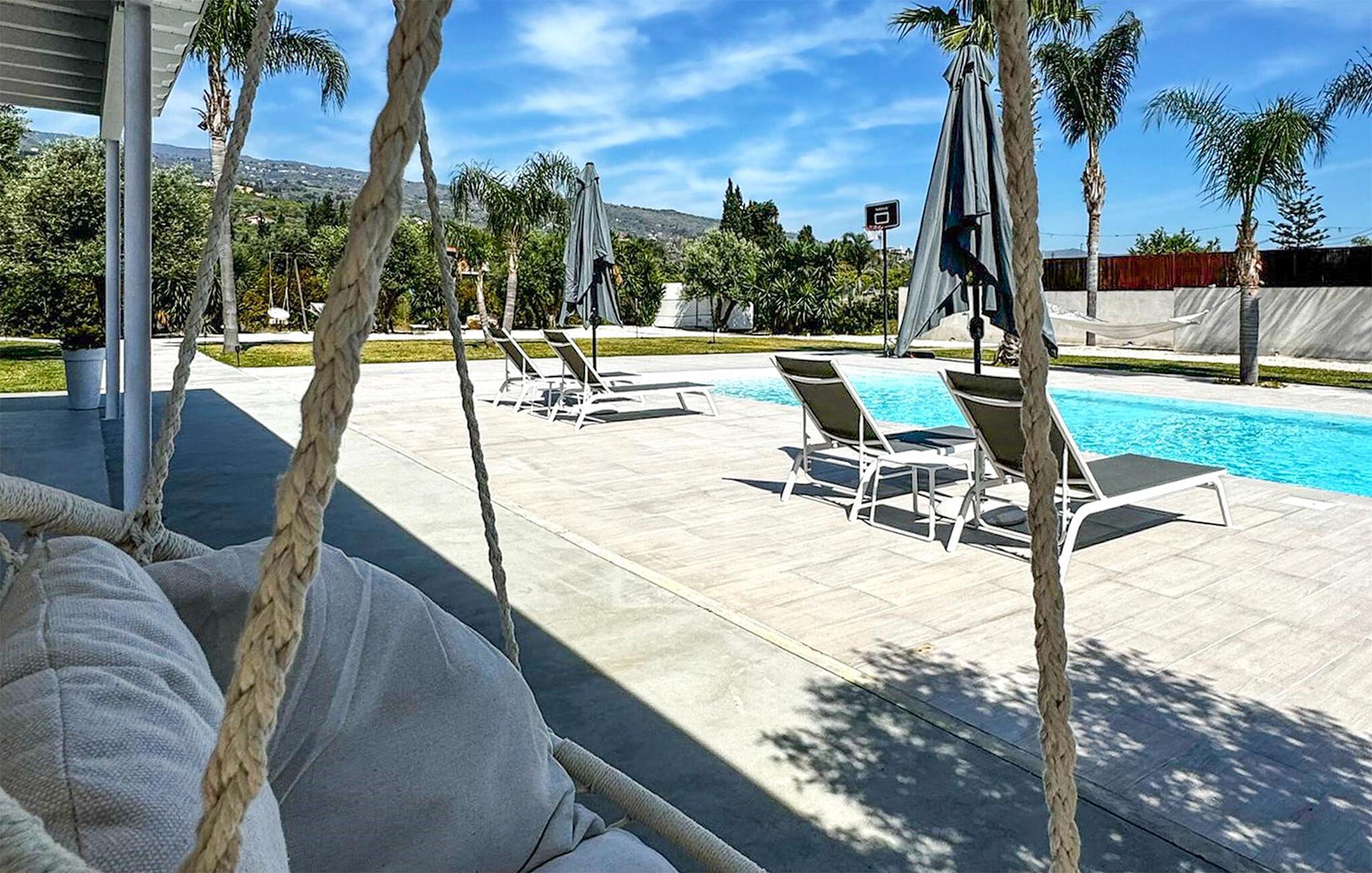 Auf der Terrasse, von wo aus Sie am Horizont das Mittelmeer glitzern sehen, erwartet Sie ein erfrischender Pool. Relaxen Sie auch in der Hängematte und genießen Sie den Blick auf die umliegende Berglandschaft.
