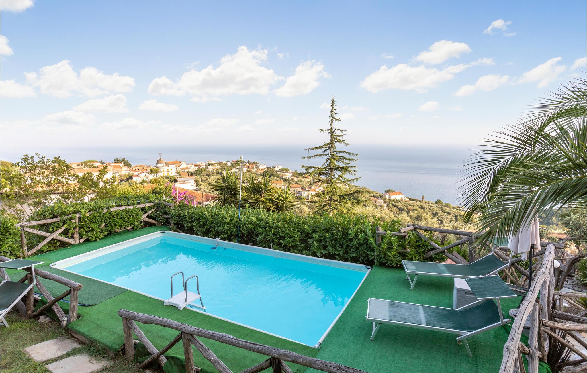 Genießen Sie Ihren Urlaub in dieser Ferienwohnung mit Panoramablick auf das Meer und Poolzugang.