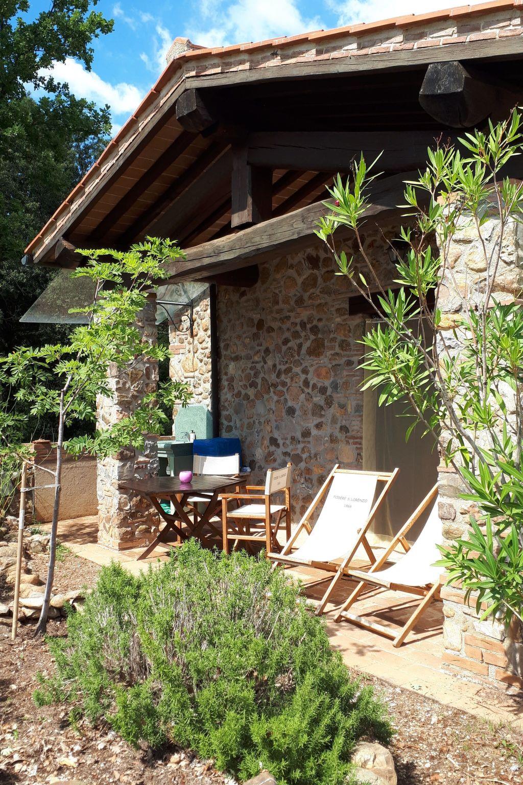 Draußen gibt es eine private überdachte Terrasse, die mit Holzmöbeln (Tisch, Stühle und Liegestühle) ausgestattet ist, sowie ein Gartenwaschbecken.