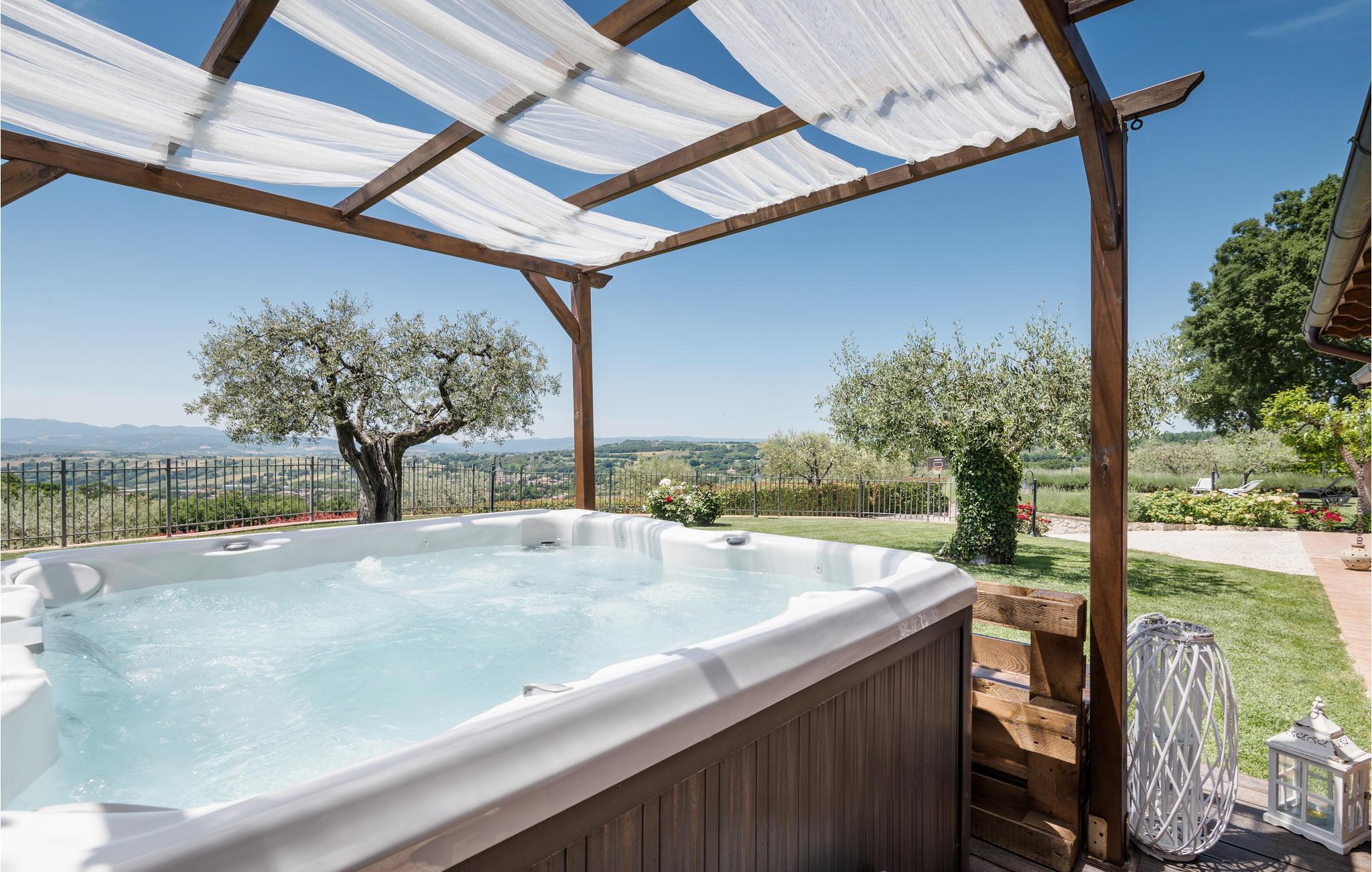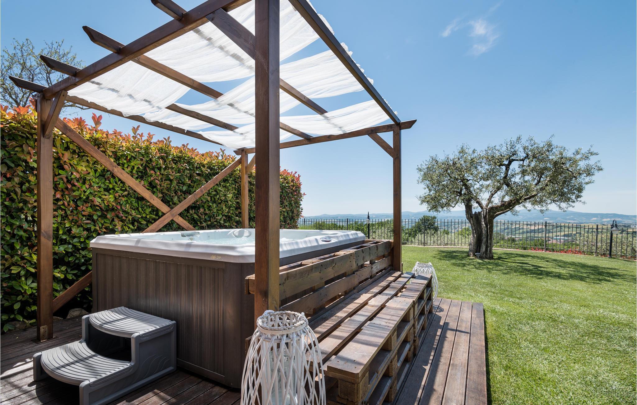 Der Außenbereich des Ferienhauses bietet zahlreiche Annehmlichkeiten. Der Panorama-Whirlpool für 6 Personen steht Ihnen exklusiv zur Verfügung, die Outdoor-Aktivitäten werden gemeinsam mit den Eigentümern genutzt.