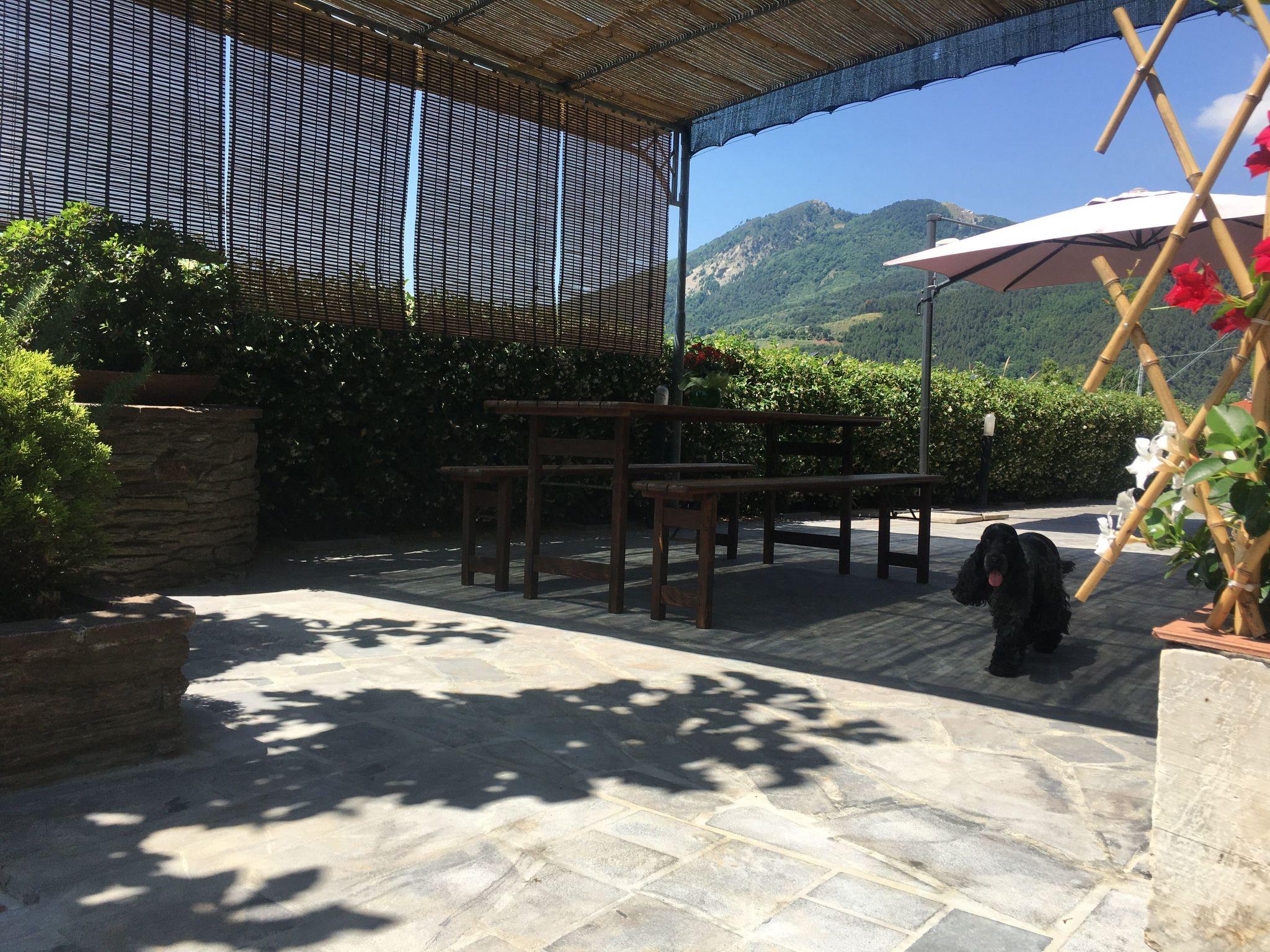 Großer Außenbereich mit Gartenmöbeln, Tisch, Stühlen, Bank, Pergola und Grill mit der Möglichkeit, draußen zu essen.