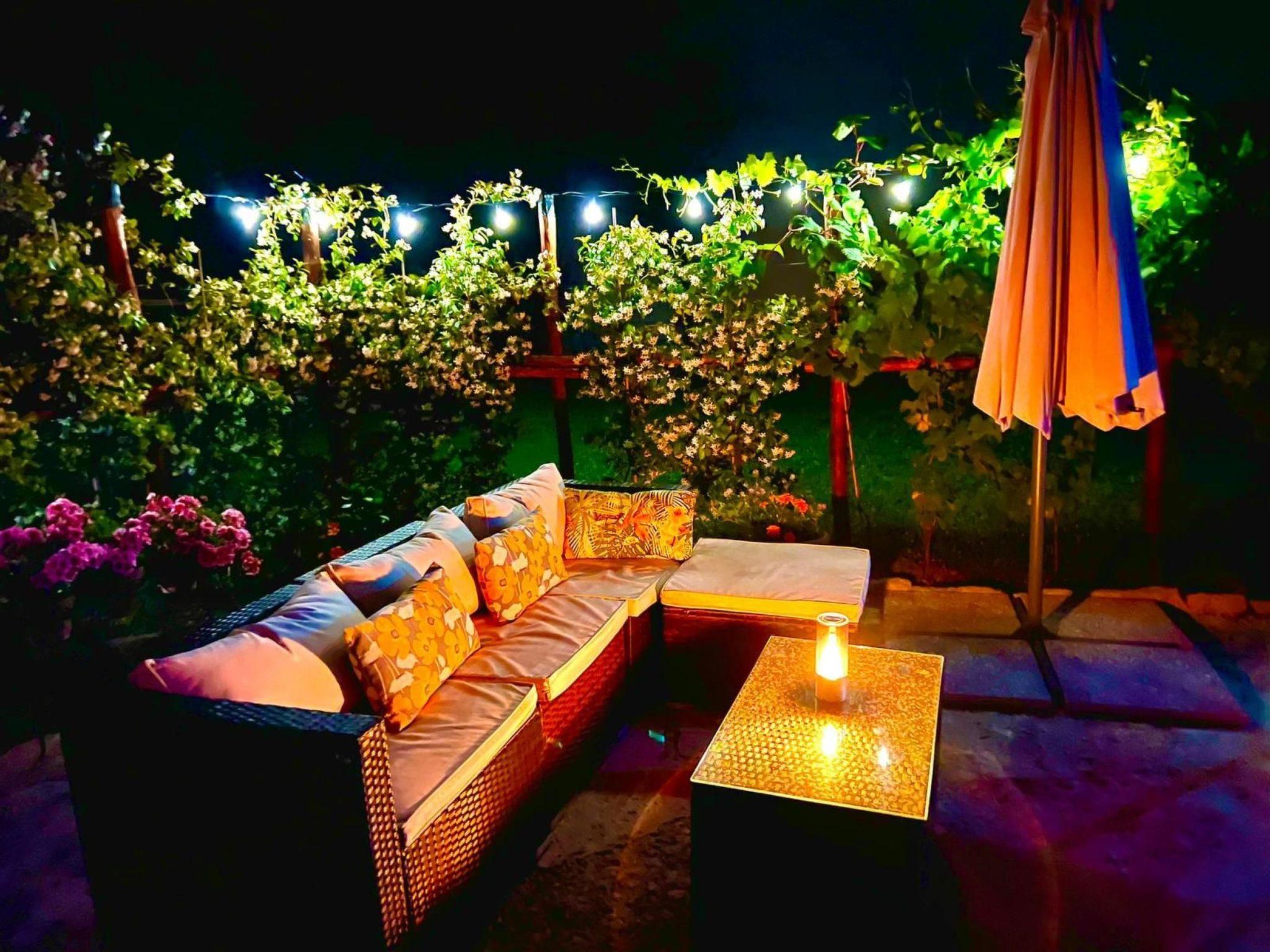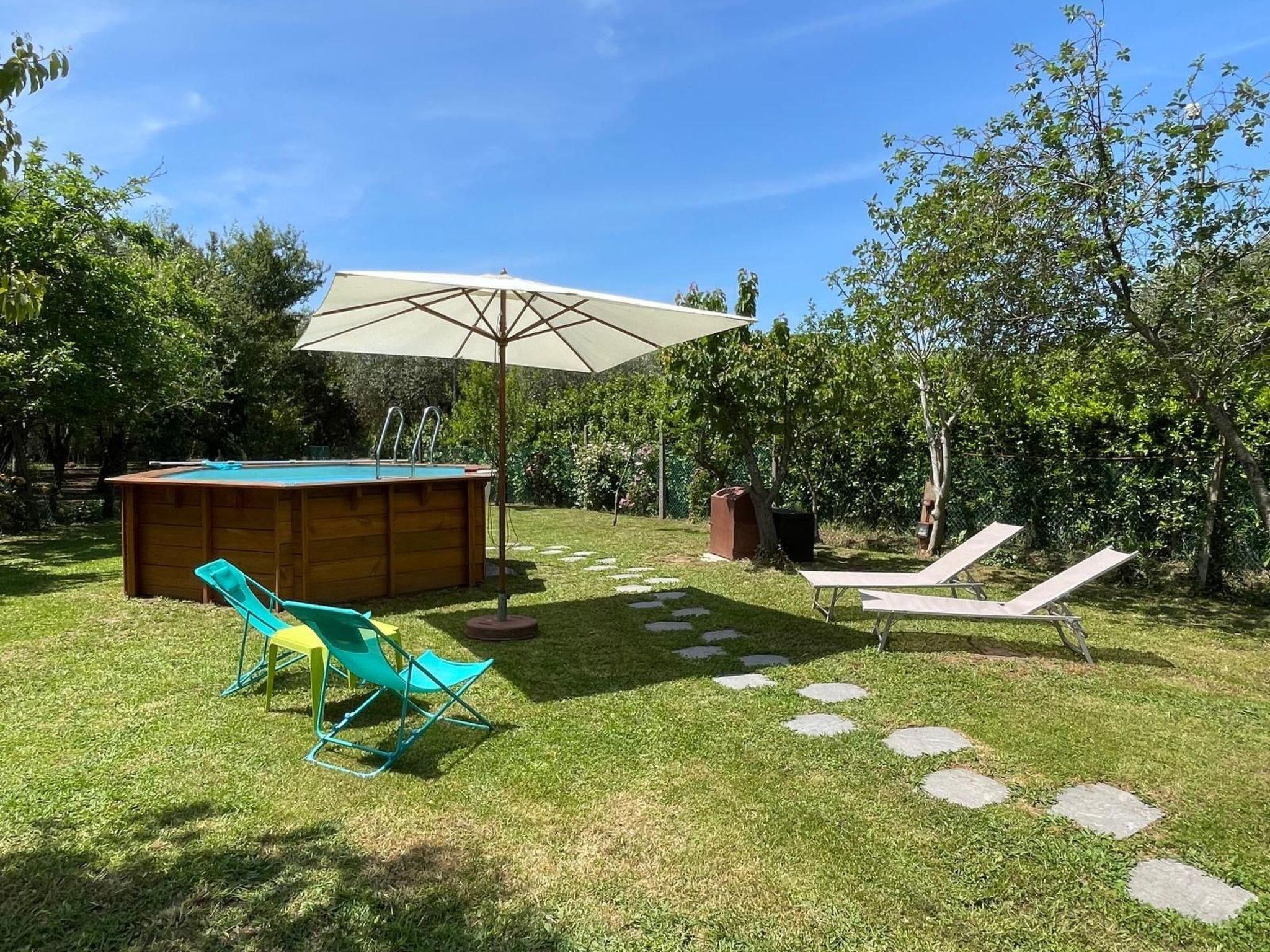 Das Ferienhaus ist von einem schönen, vollständig eingezäunten Garten umgeben, der mit Tisch, Stühlen und Grill für Mahlzeiten im Freien ausgestattet ist, sowie mit einem Entspannungsbereich mit Sofa und einem sechseckigen Swimmingpool (Durchmesser 3 m, Tiefe 100 cm, geöffnet von Mai bis Mitte Oktober) mit Liegestühlen und Sonnenschirmen.
