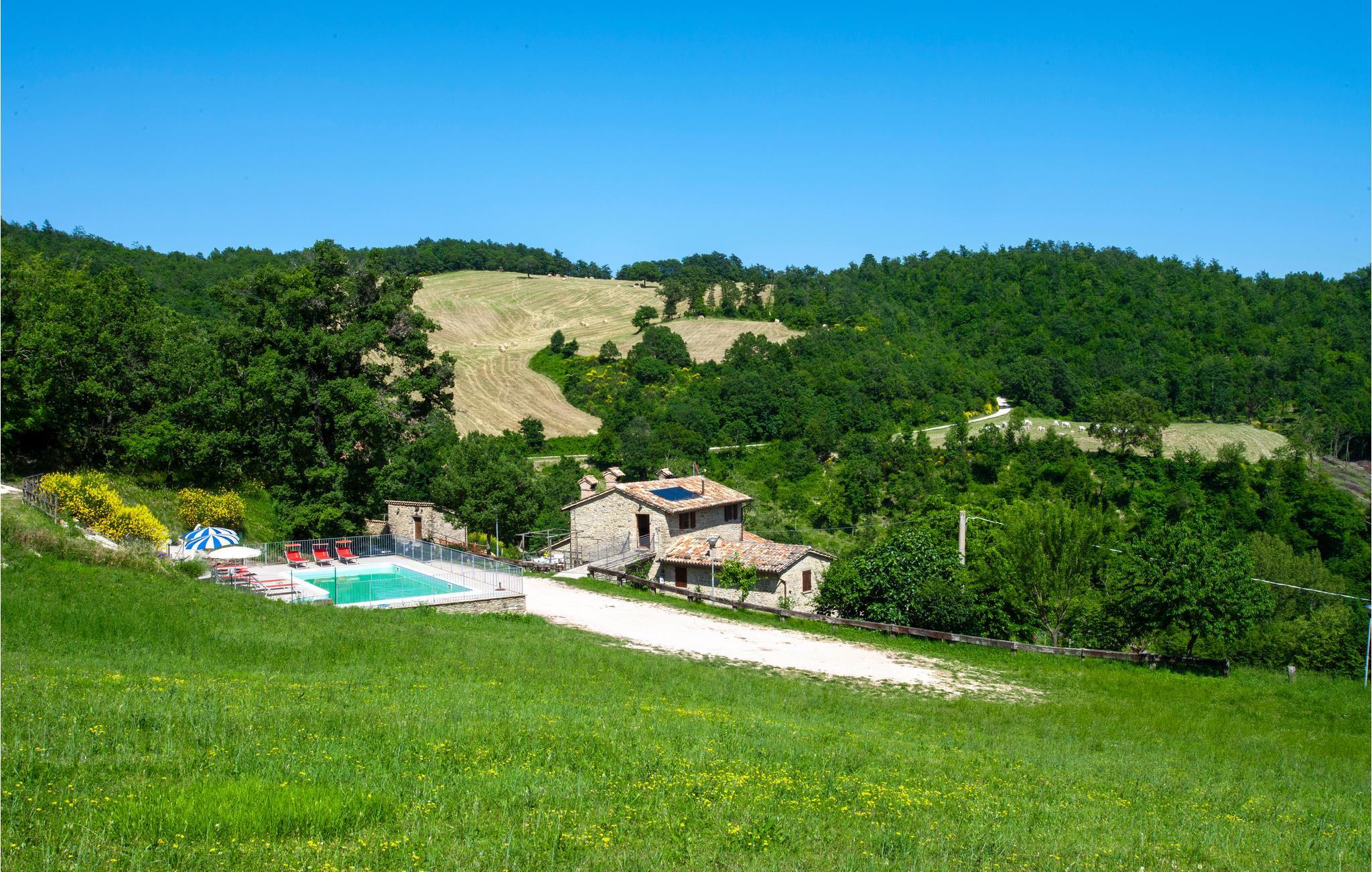 Etwa 6 km oberhalb von Mercatello sul Metauro liegt diese gemütliche Ferienwohnung mit Pool in romantischer Hügellage. Die Wohnung gehört zu einem kleinen Bio-Hof mit Tierhaltung; sie hat einen ebenerdigen Zugang zur Wohnküche, mit offenem Kamin und Schlafcouch (Etagenbetten); ein komfortables Bad (Dusche mit Wassermassage) und ein Schlafzimmer mit Baldachin-Bett. Vor der Wohnung gibt es einen privaten überdachten Sitzplatz; etwas oberhalb liegt der umzäunte Poolbereich mit Sonnenterrassen und Talblick (gemeinsam mit weiteren zwei Ferienwohnungen). – Die Eigentümerin bietet ihren Gästen auf Anfrage lokale Küche in der hauseigenen Trattoria, sowie biologische Produkte aus eigener Produktion. Von der Ferienwohnung können Sie direkt loswandern oder biken – etwa zur Badestelle im Wildbach (5 km) oder nach Mercatello sul Metauro, einer der schönsten mittelalterlichen Städte der Marken, mit Geschäften, Restaurants, Bars auf der Piazza. Spezialitäten der Gegend sind Steinpilze und Trüffelgerichte! Die Lage ist ideal für Erkundungen der sehenswerten Städte der Umgebung: Sant‘Angelo in Vado 10 km, Urbino 35 km, Sansepolcro 42 km oder für einen Badetag an der Adria (Küste bei Fano 70km). Unasphaltierte Zufahrt.
