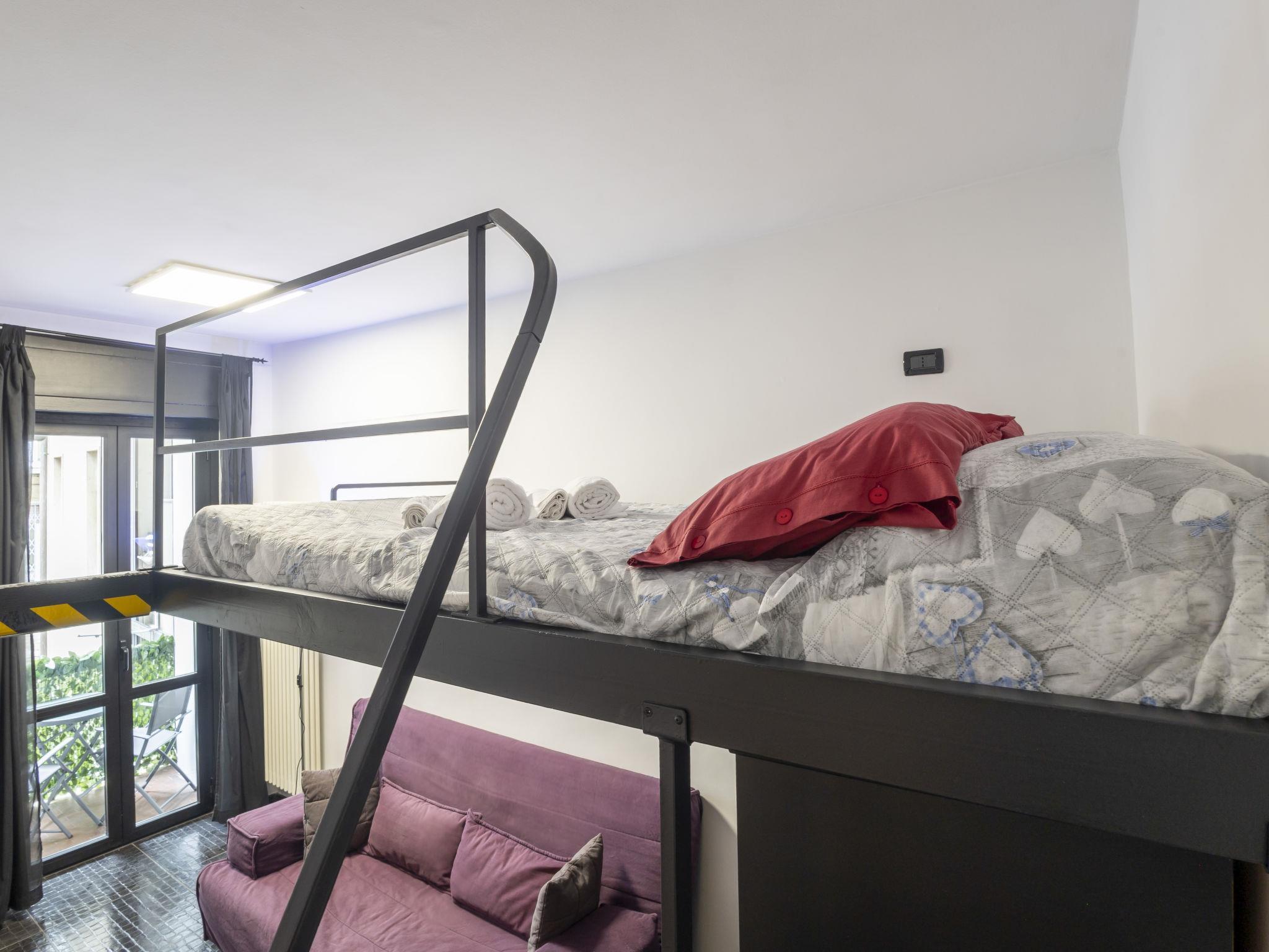 1-Zimmer-Loft 35 m2 im 1. Stock. Renoviert, zweckmässig und komfortabel eingerichtet: Wohn-/Esszimmer mit 1 Doppeldiwanbett (180 cm, Länge 190 cm), Esstisch und TV. Ausgang zum Balkon. Kleine Kochnische (2 Induktionskochplatten, Toaster, Wasserkocher, Mikrowelle, Tiefkühler, elektrische Kaffeemaschine, Kapseln für die Kaffeemaschine (Nespresso) gratis). Dusche/Bidet/WC. Heizung, Klimaanlage. Obergeschoss: (steile Treppe) offene Galerie mit 1 franz. Bett (160 cm, Länge 190 cm). Kleiner Balkon. Balkonmöbel. Zur Verfügung: Bügeleisen, Haartrockner. Internet (Wireless LAN, gratis). Bitte beachten: Wohnung auf Hofseite. Nichtraucher-Unterkunft. Rauchmelder, Feuerlöscher. IT015146C2KREQ7497