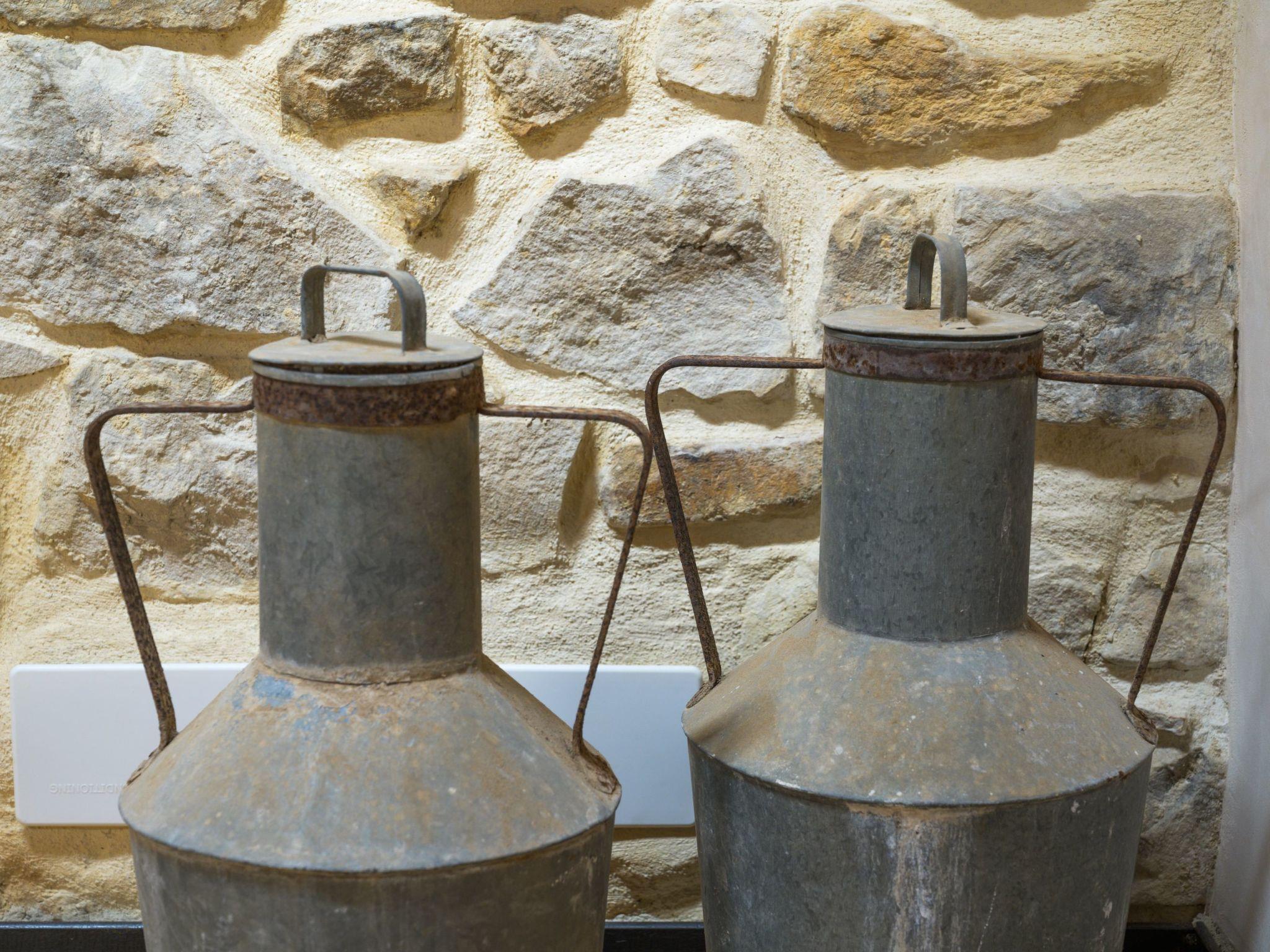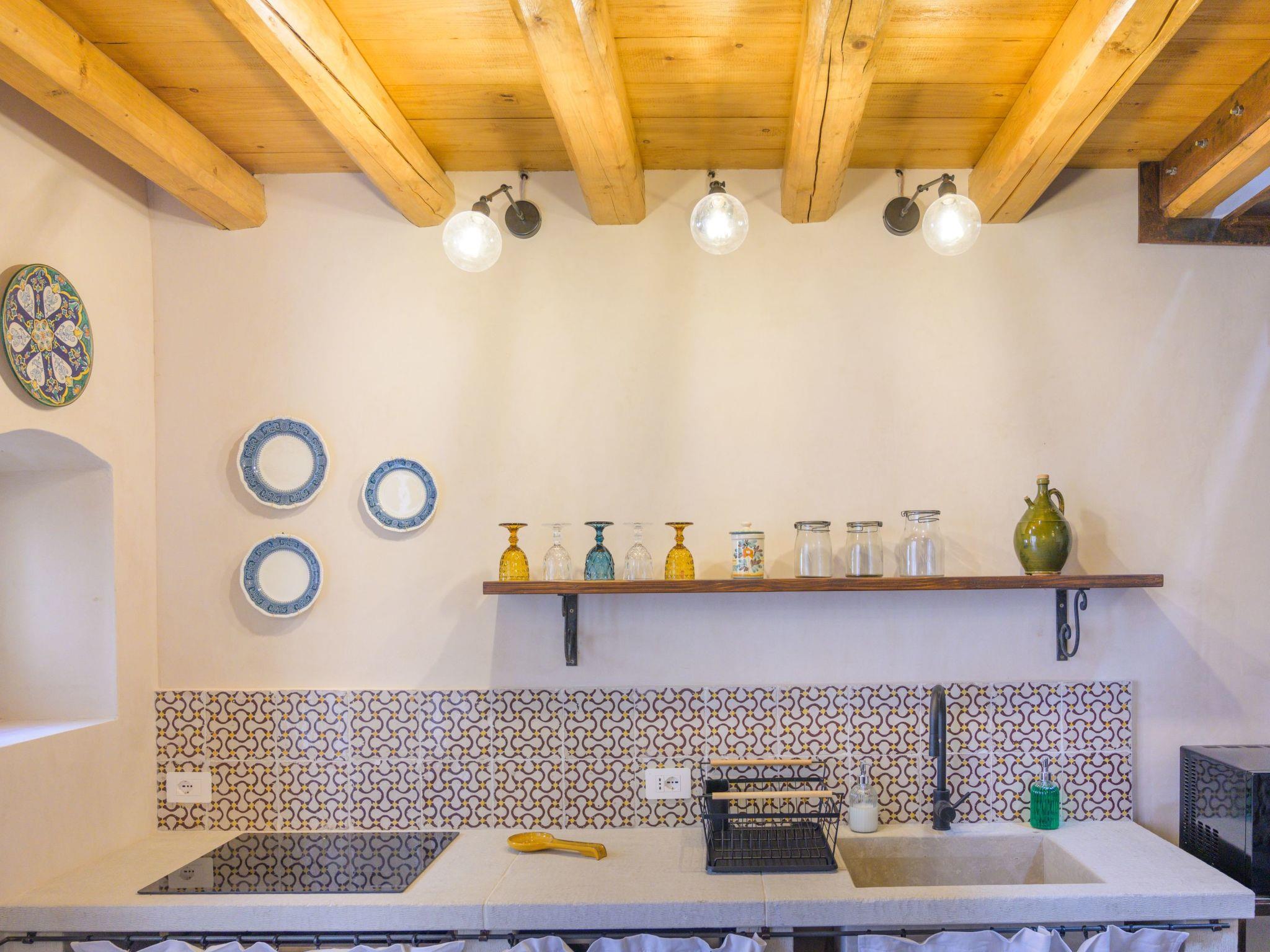 Die Wohnung ist in einem originellen und raffinierten antiken Stil eingerichtet, mit weißen Steinwänden, einer Holzdecke und Böden aus Pechstein und dekorierten Fliesen.