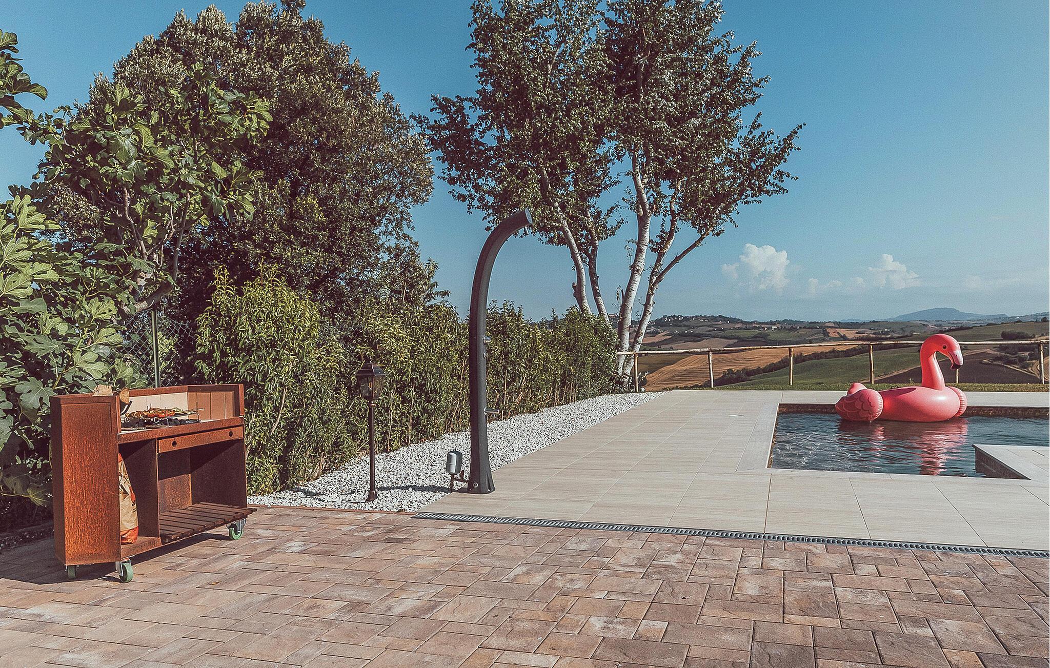 Sie können Ihre Mahlzeiten auch im weitläufigen Außenbereich servieren. Oder entspannen Sie auf einer der Sonnenliegen am Pool und genießen Sie den Blick über die malerische Landschaft. Spielen Sie eine Partie Basketball oder Fußball oder fordern Sie Ihre Mitreisenden auf dem benachbarten, gemeinschaftlichen Tennisplatz heraus. Für die jüngsten Gäste sorgt eine Rutsche für zusätzlichen Spaß.