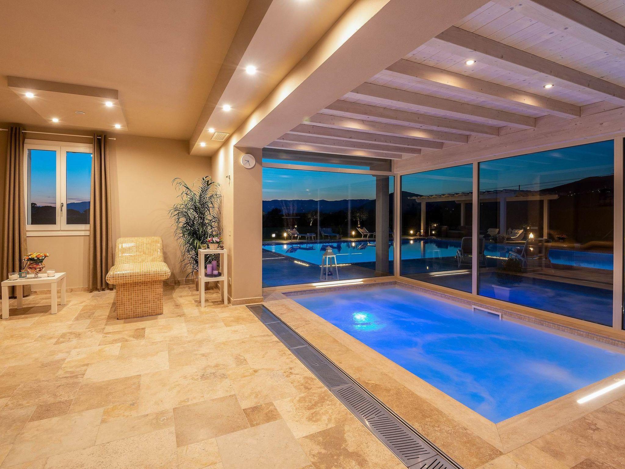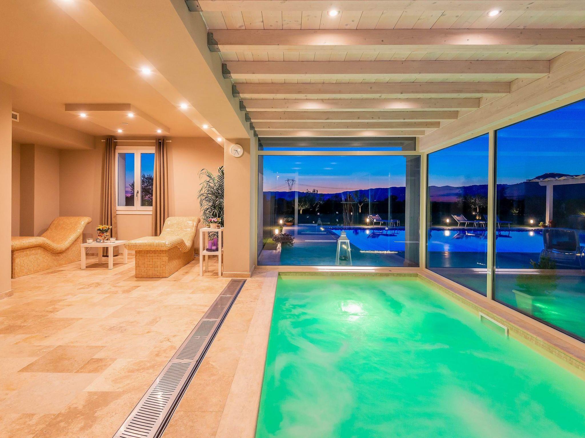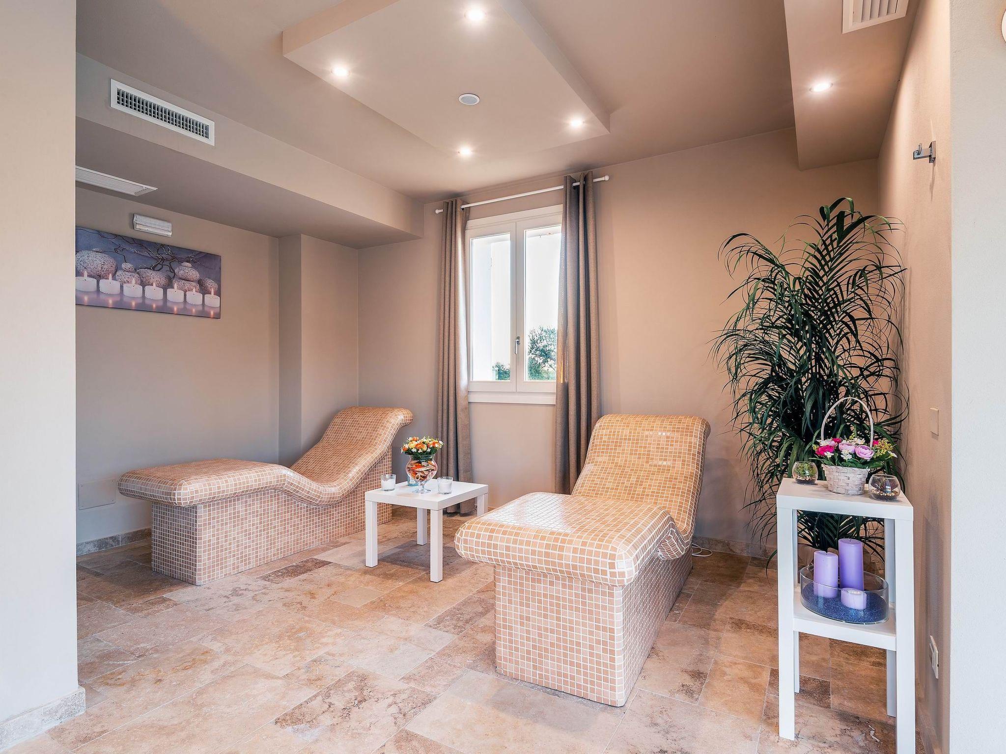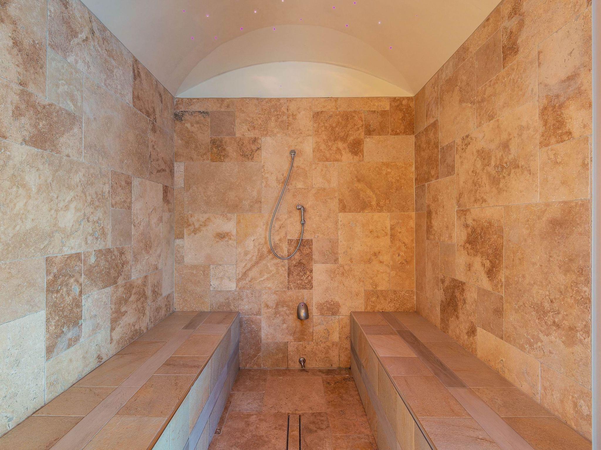Im Erdgeschoss befindet sich außerdem ein Wellnessbereich mit Whirlpool (3,80 x 2,5 m, Tiefe 1 m), Sauna, 4 m² Dampfbad, 2 beheizten Wellnessliegen und Blick auf den Außenbereich, 2 Umkleideräume mit WC, Duschen und ein behindertengerechtes Bad.