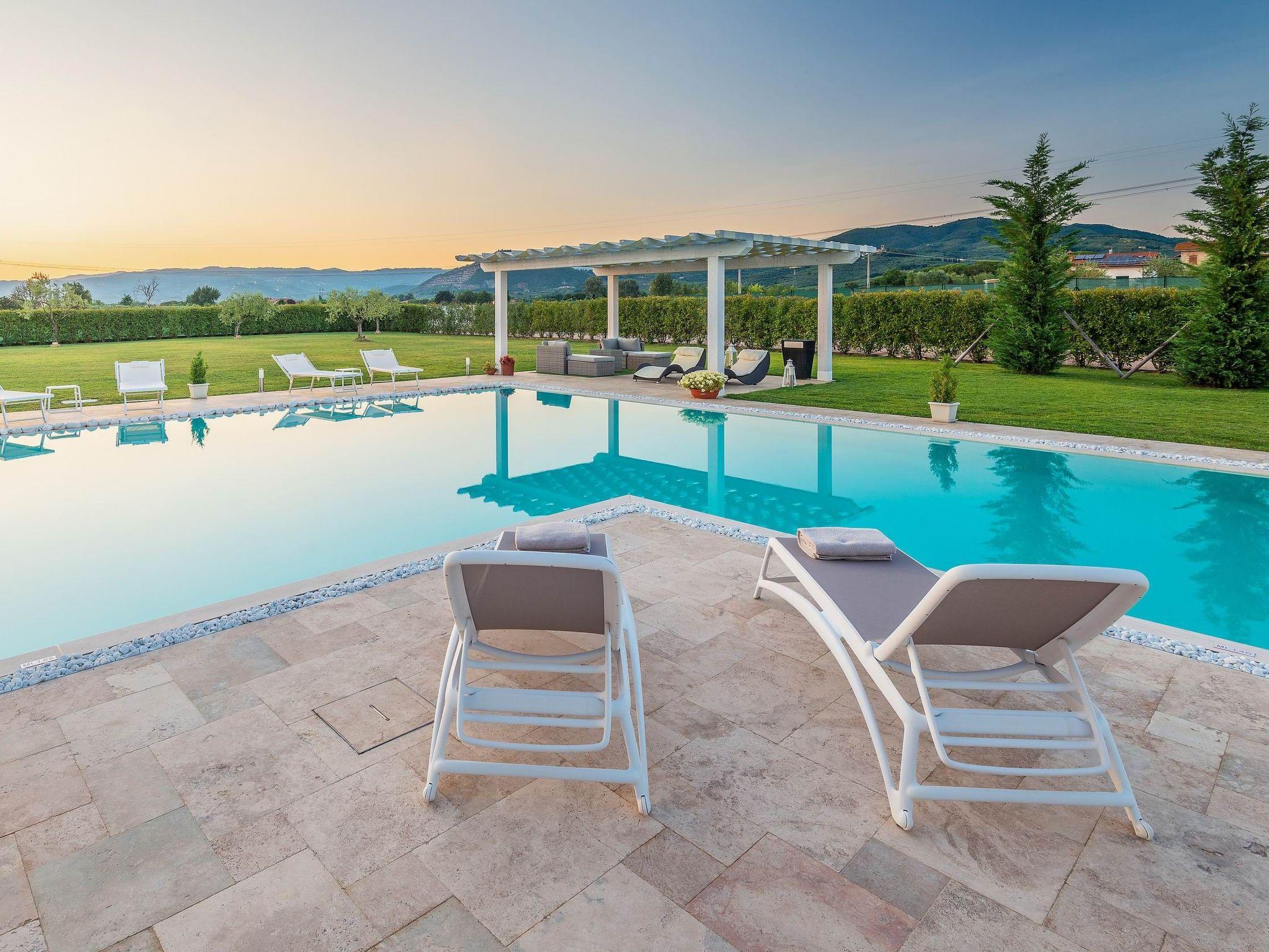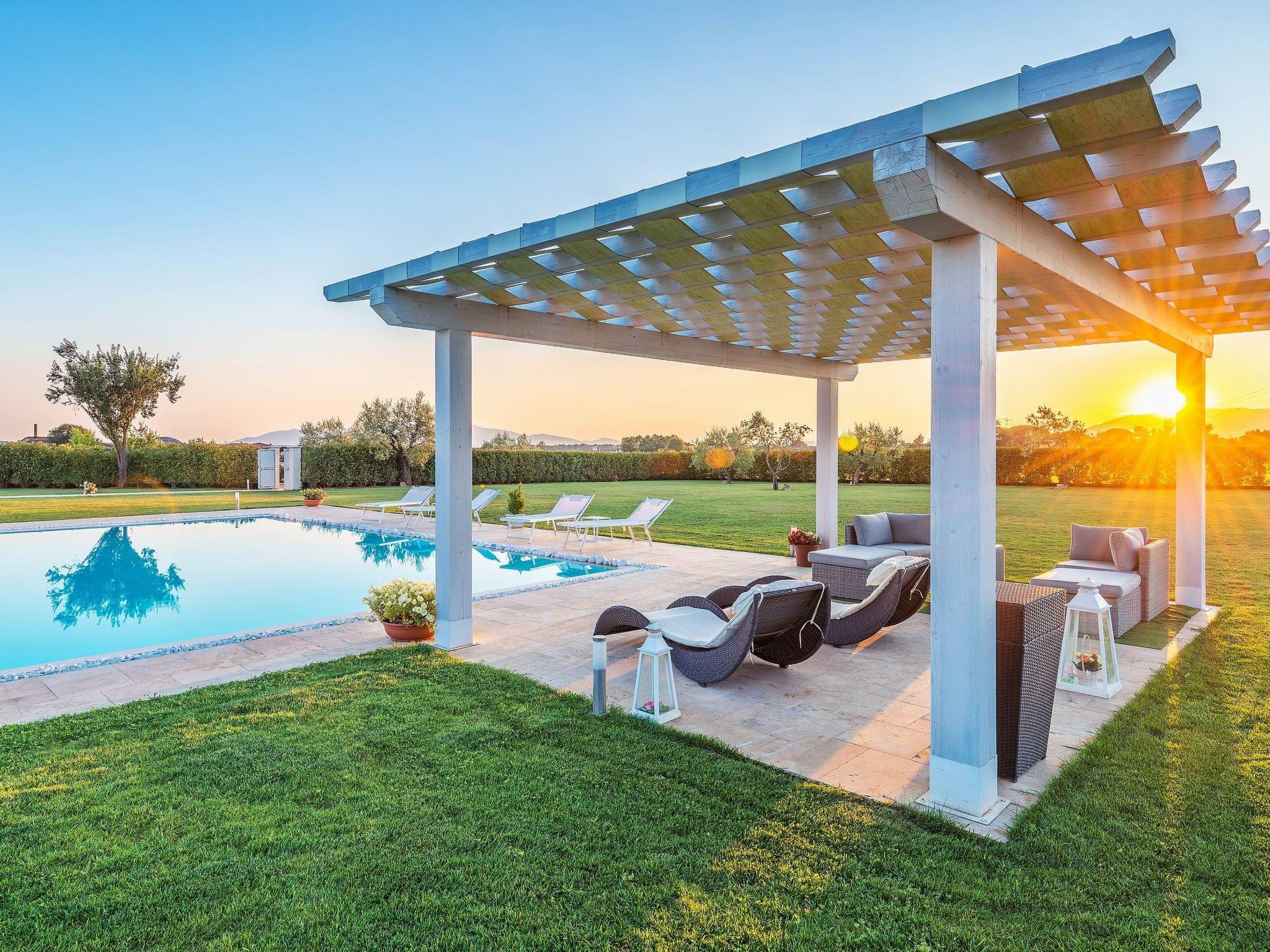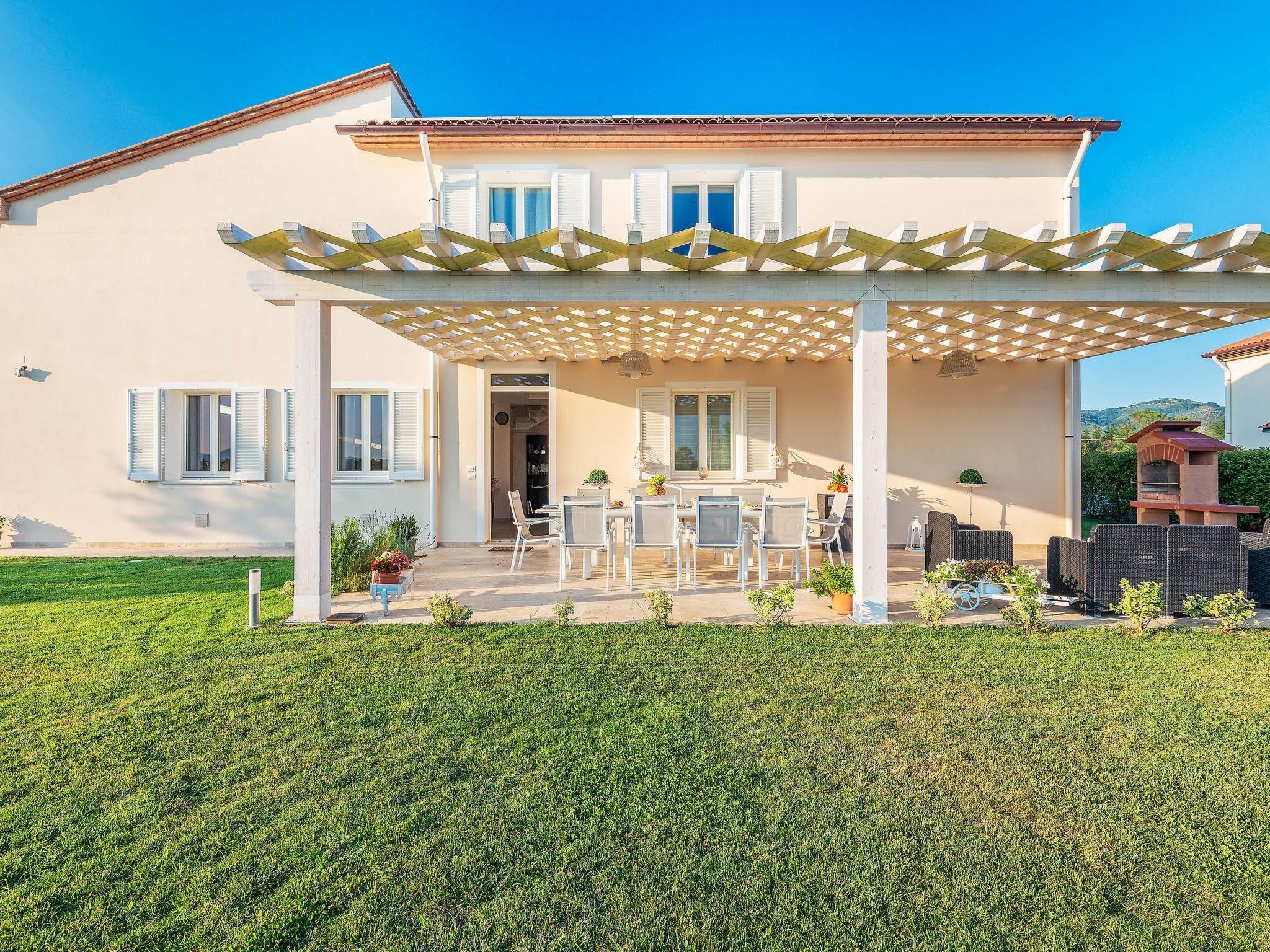 Die Villa ist von einem großen, gepflegten Garten umgeben, der mit einer Pergola für Mittag- und Abendessen im Freien, einem Grill und einer Entspannungszone neben dem großen L-förmigen Schwimmbad (11 x 7 m, mit einer Verlängerung von 4 x 5 m) ausgestattet ist.