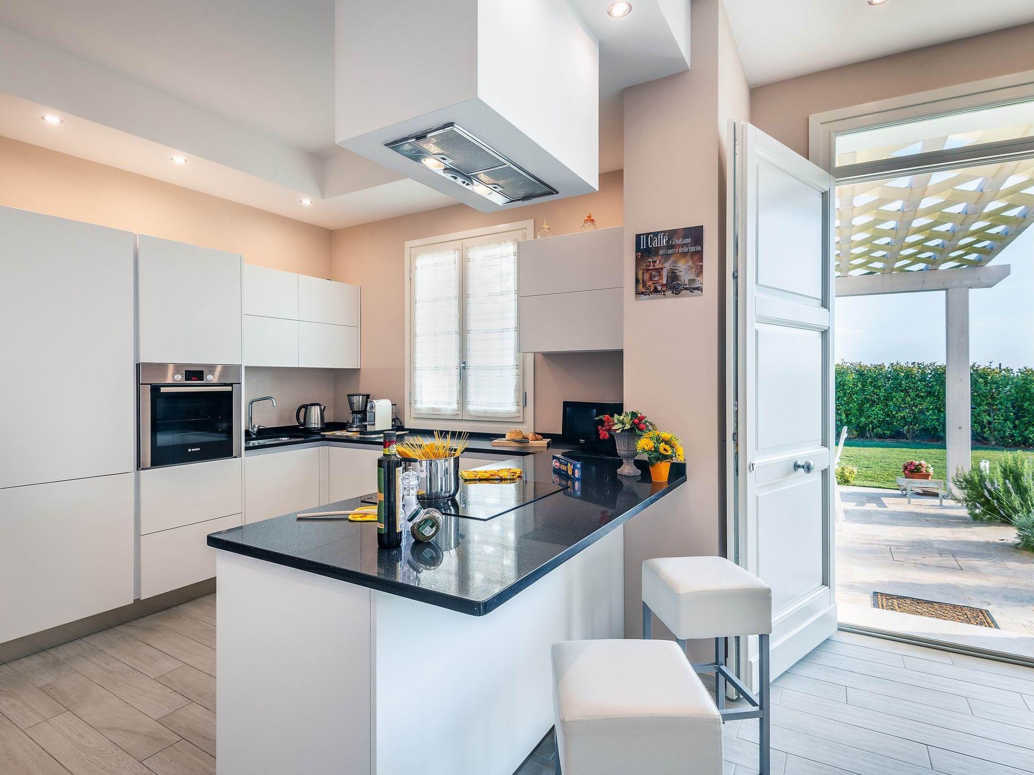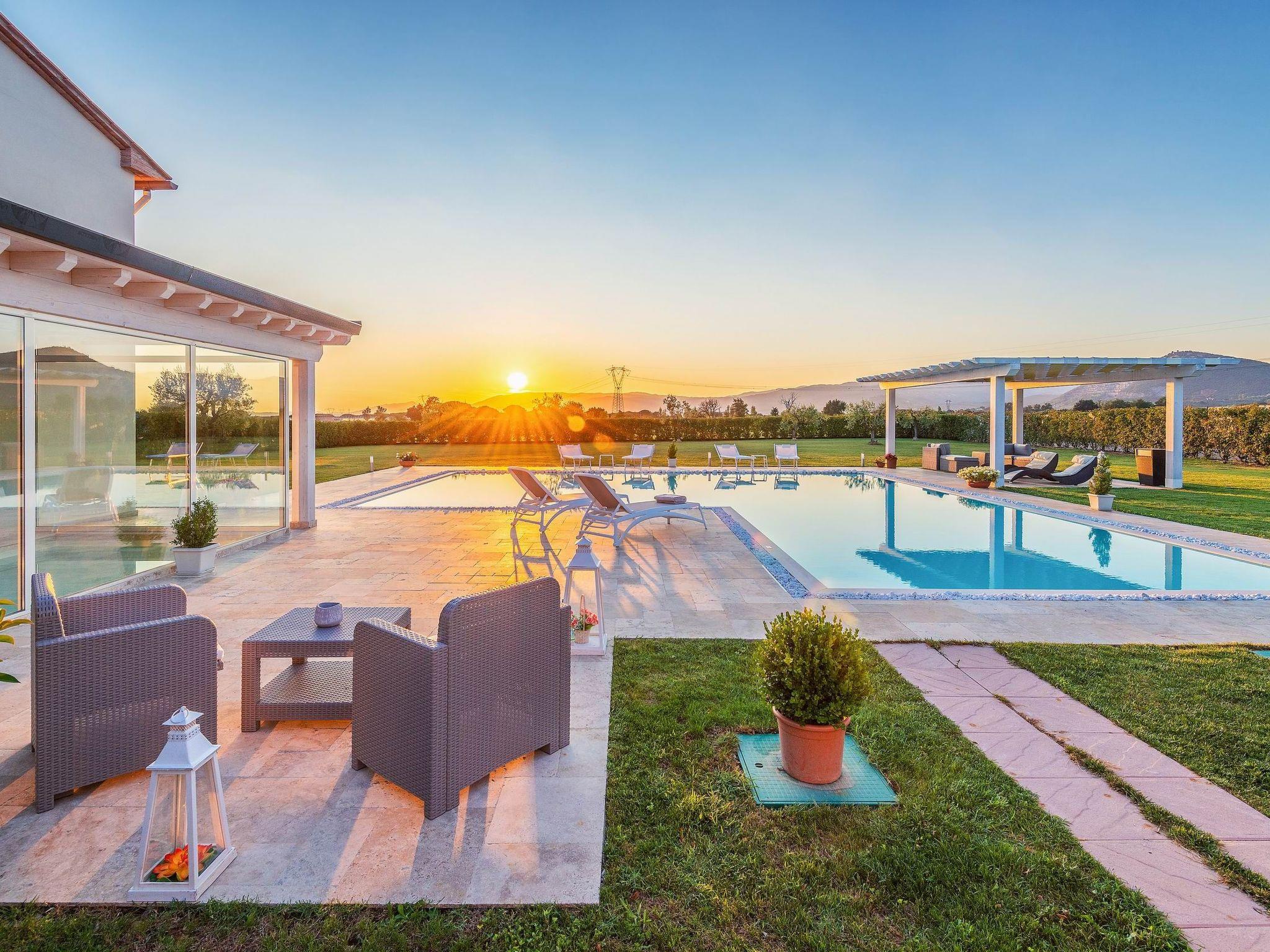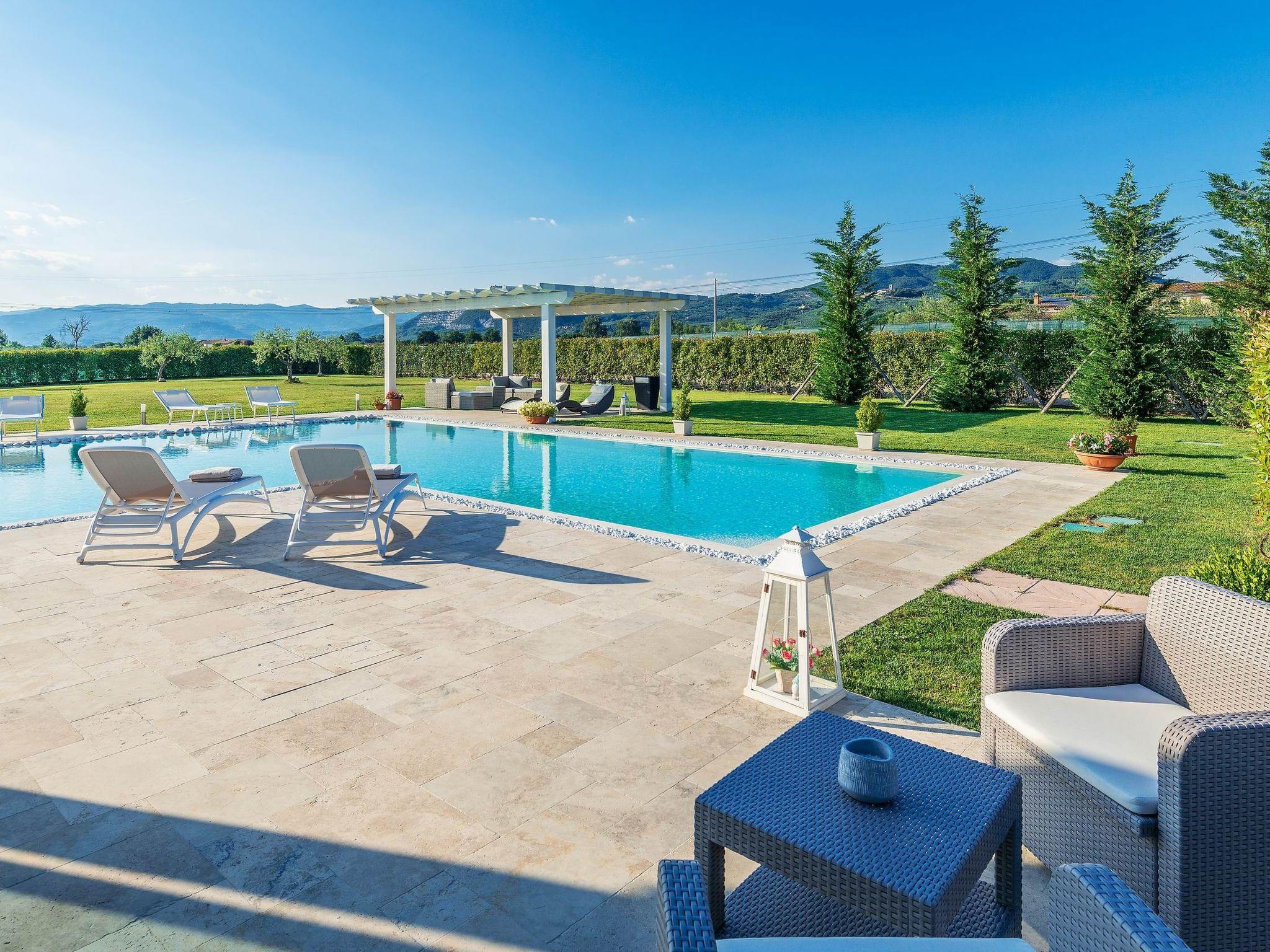 Die Villa ist von einem großen, gepflegten Garten umgeben, der mit einer Pergola für Mittag- und Abendessen im Freien, einem Grill und einer Entspannungszone neben dem großen L-förmigen Schwimmbad (11 x 7 m, mit einer Verlängerung von 4 x 5 m) ausgestattet ist.