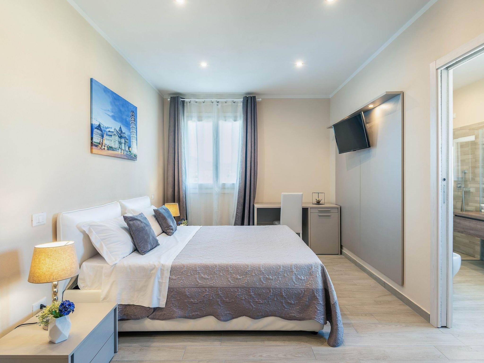 Obergeschoss: 4 Doppelzimmer mit Sat-TV, alle mit eigenem Bad mit Dusche und Haartrockner. Drei von ihnen haben ein zusätzliches Einzelbett. Ein weiteres Wohnzimmer mit Satellitenfernsehen: dieser Bereich ist nur mit dem Aufzug von den Thermen aus erreichbar.