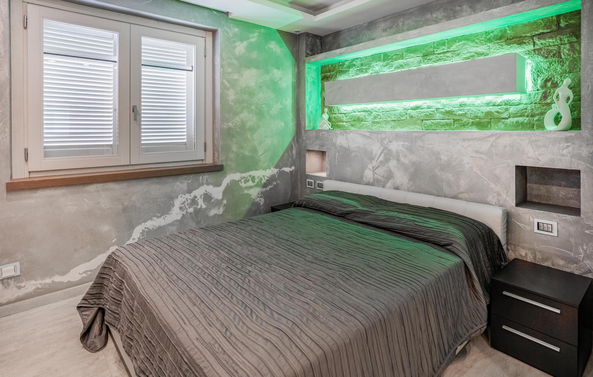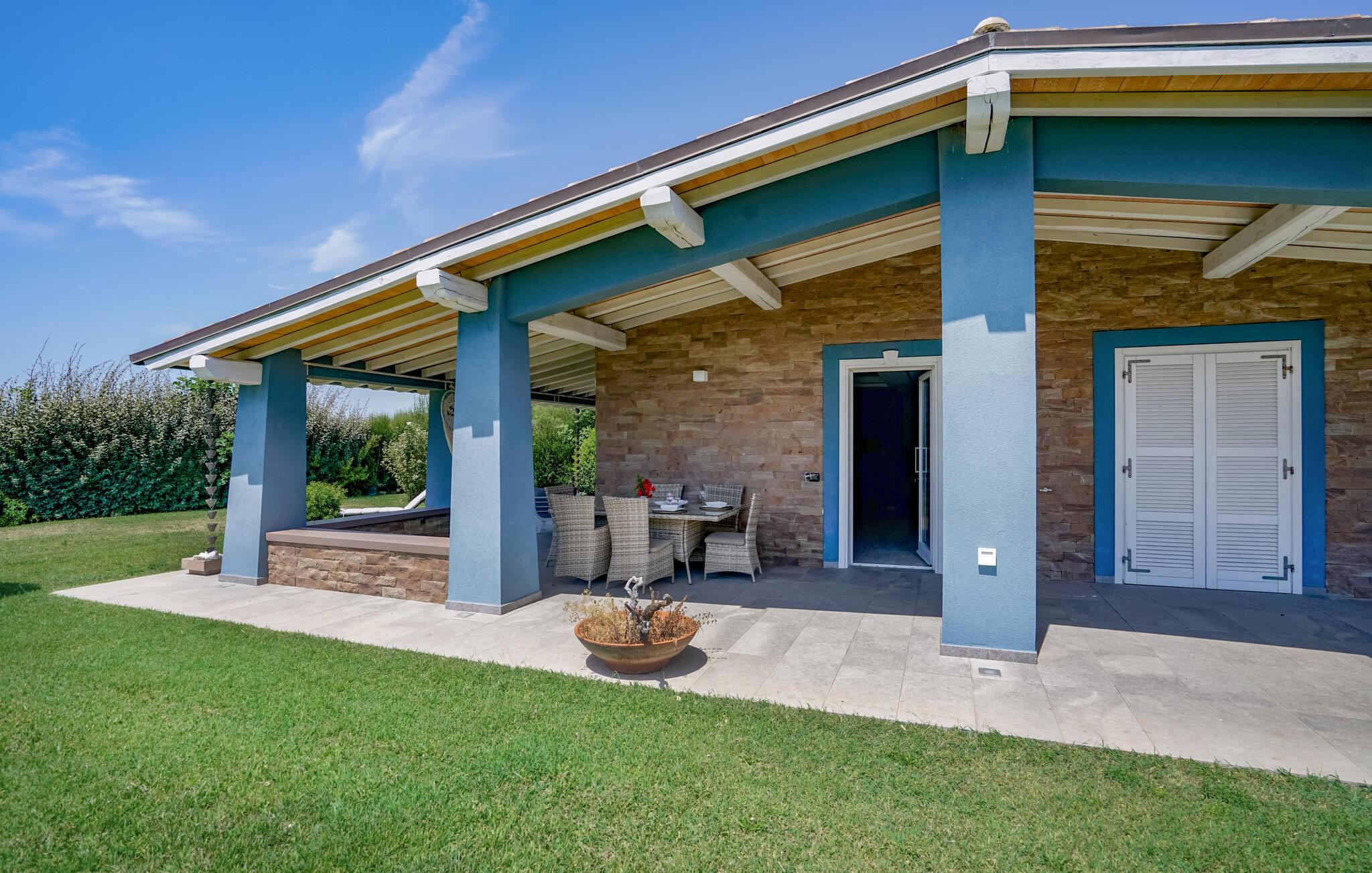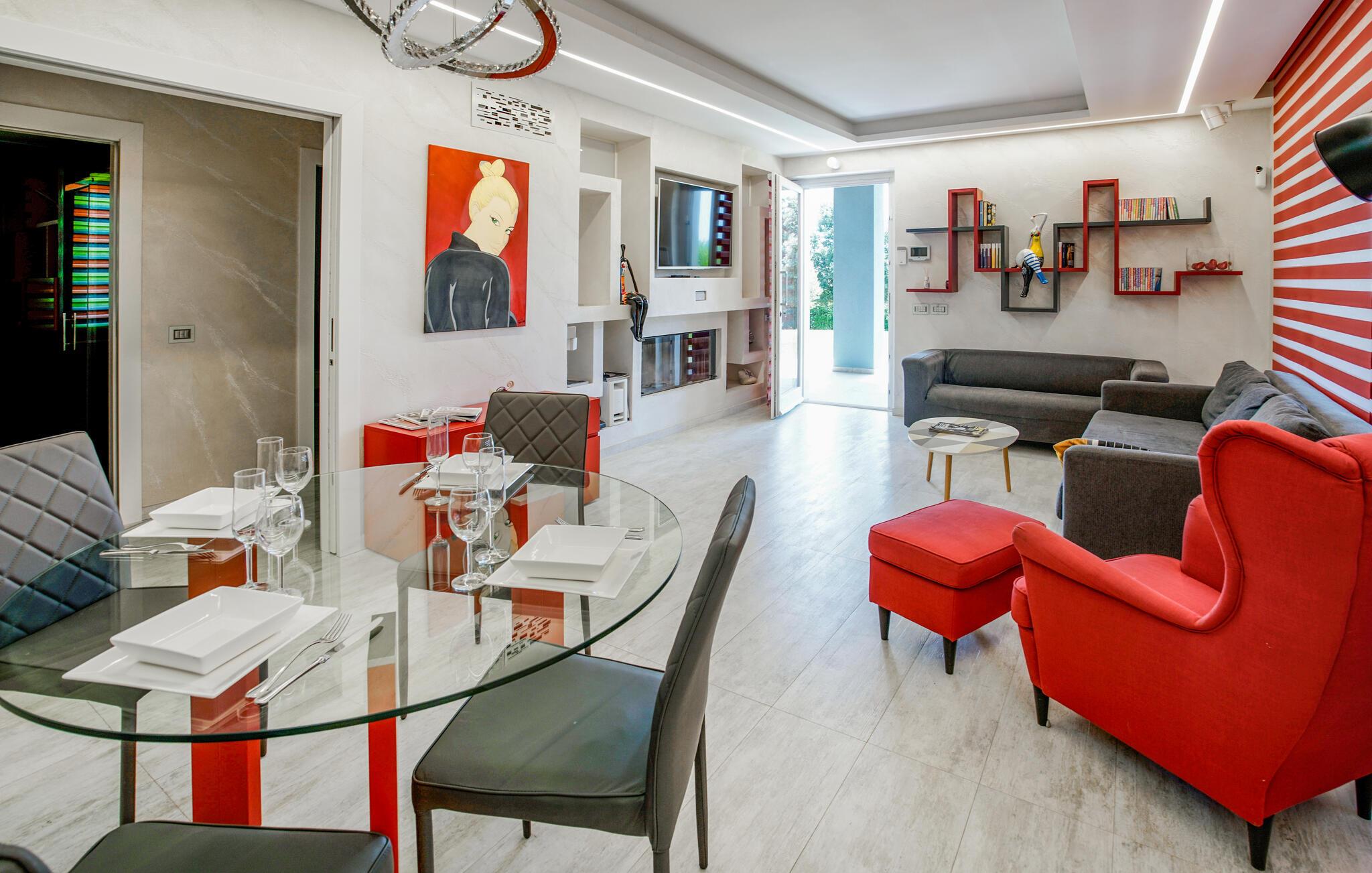 Dieses moderne und einladende Ferienhaus in Montalto di Castro vereint stilvolle Einrichtung mit einem durchdachten Design. Warme Farbakzente und geschmackvolle Dekoration schaffen eine Atmosphäre zum Wohlfühlen. Die geräumige Küche lädt Sie zum gemeinsamen Kochen ein, während das luxuriöse Badezimmer mit großzügigem Bade- und Duschbereich Ihnen pure Entspannung bietet.