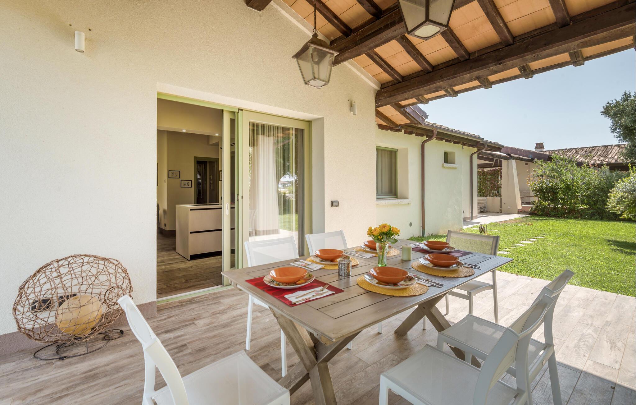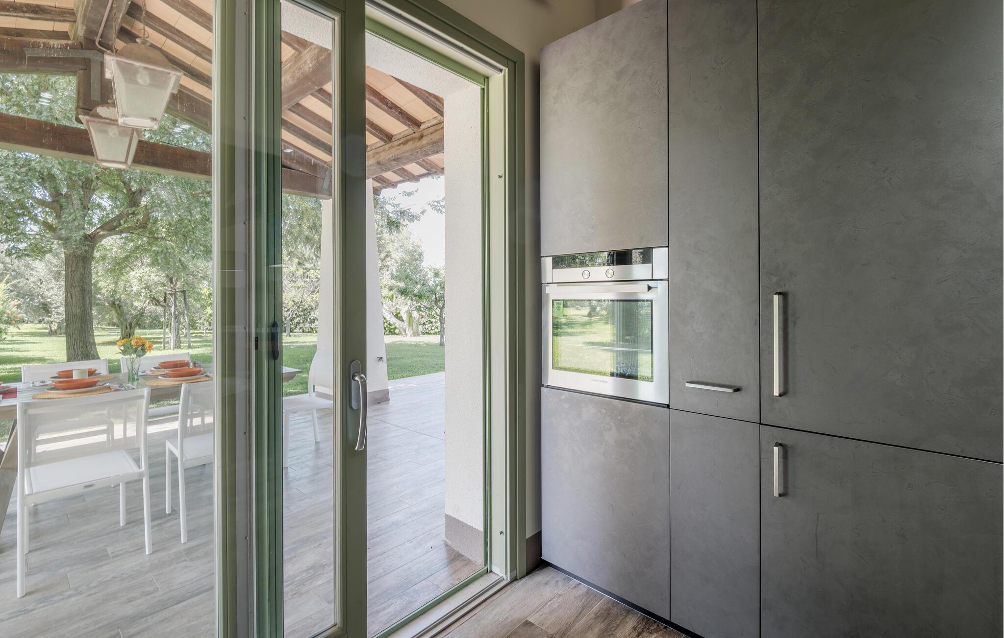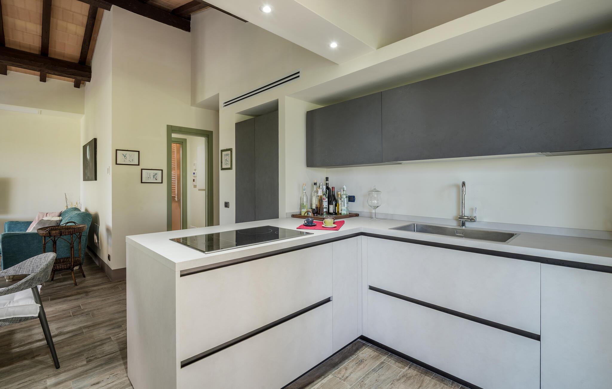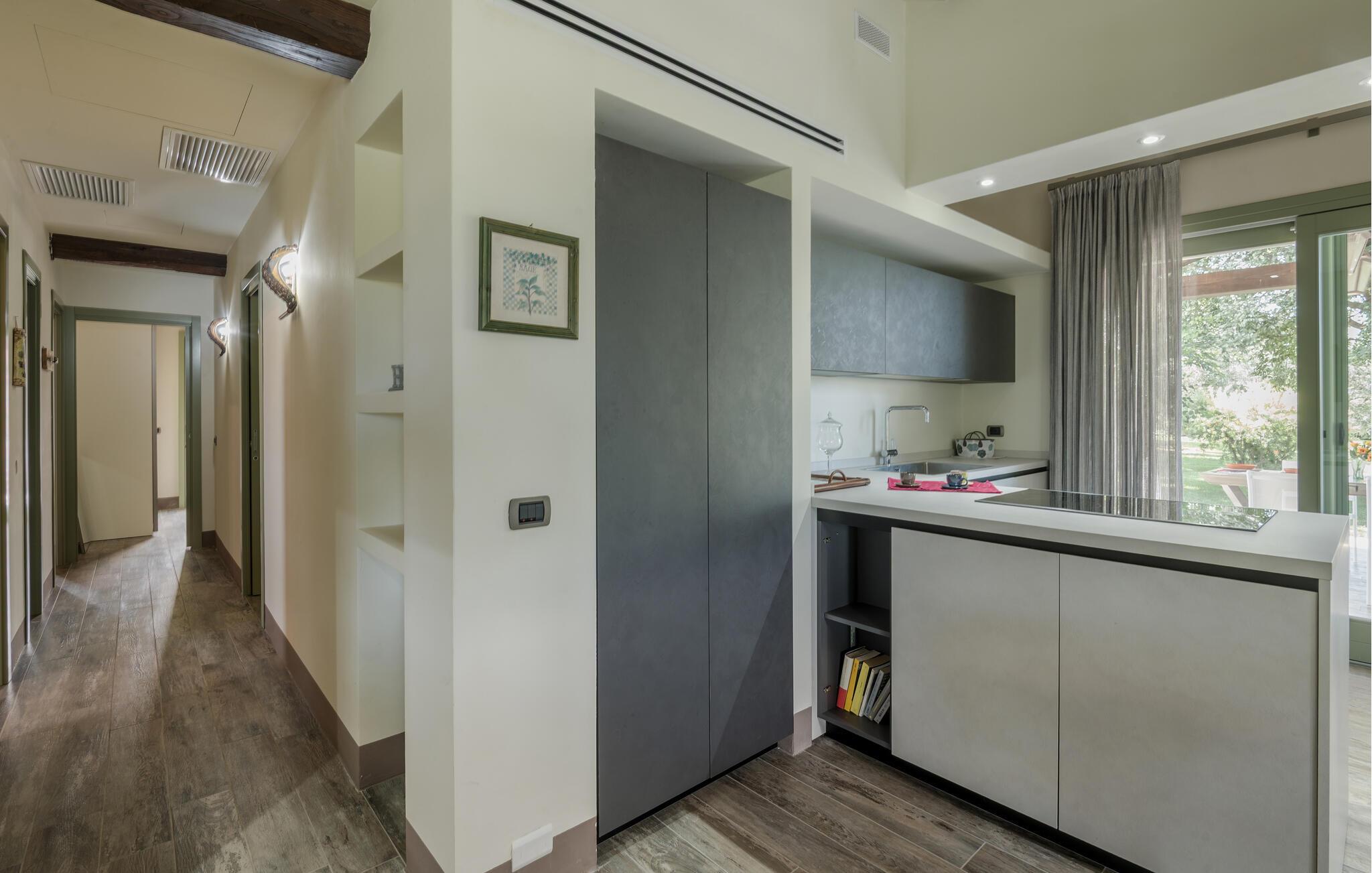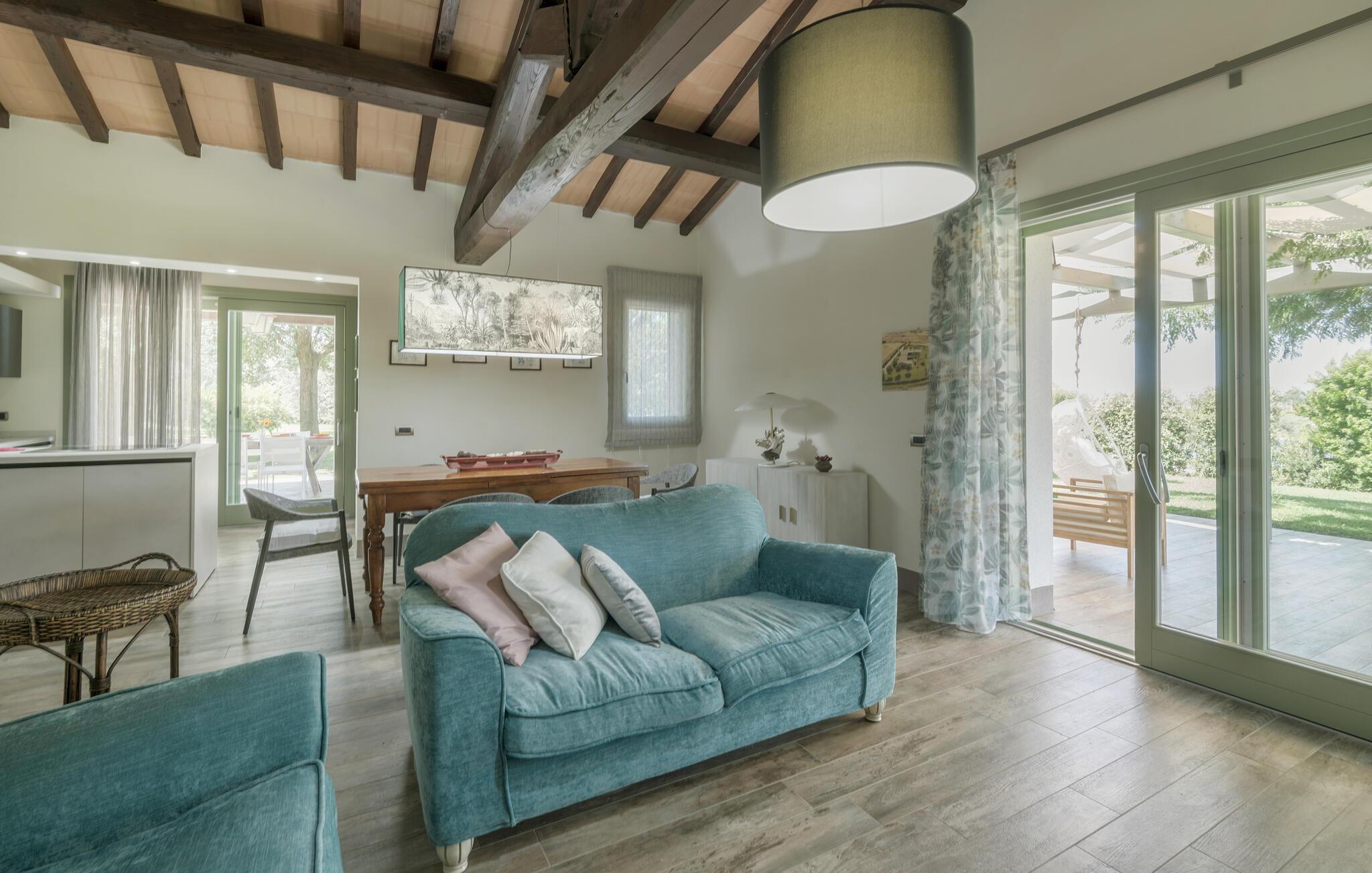 Freuen Sie sich auf eine entspannte Auszeit mit Freunden oder der Familie im eleganten Interieur dieses großzügigen Ferienhauses. Experimentieren Sie in der modernen, offenen Küche mit frischer Pasta und genießen Sie das Ergebnis gemeinsam am stilvoll beleuchteten Esstisch. Verbringen Sie ruhige Abende mit einer spannenden Serie in der Wohlfühlatmosphäre des Wohnbereichs.