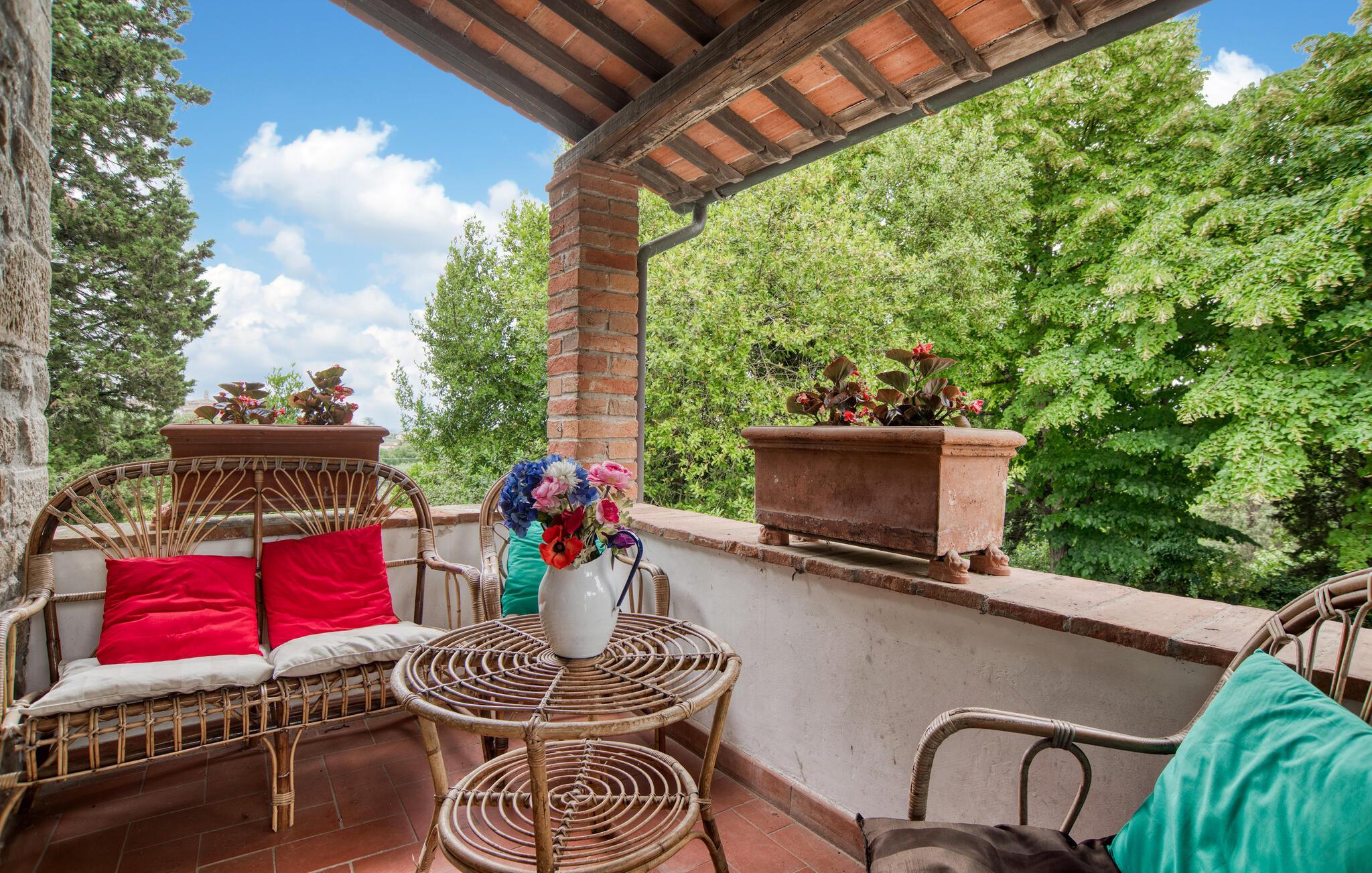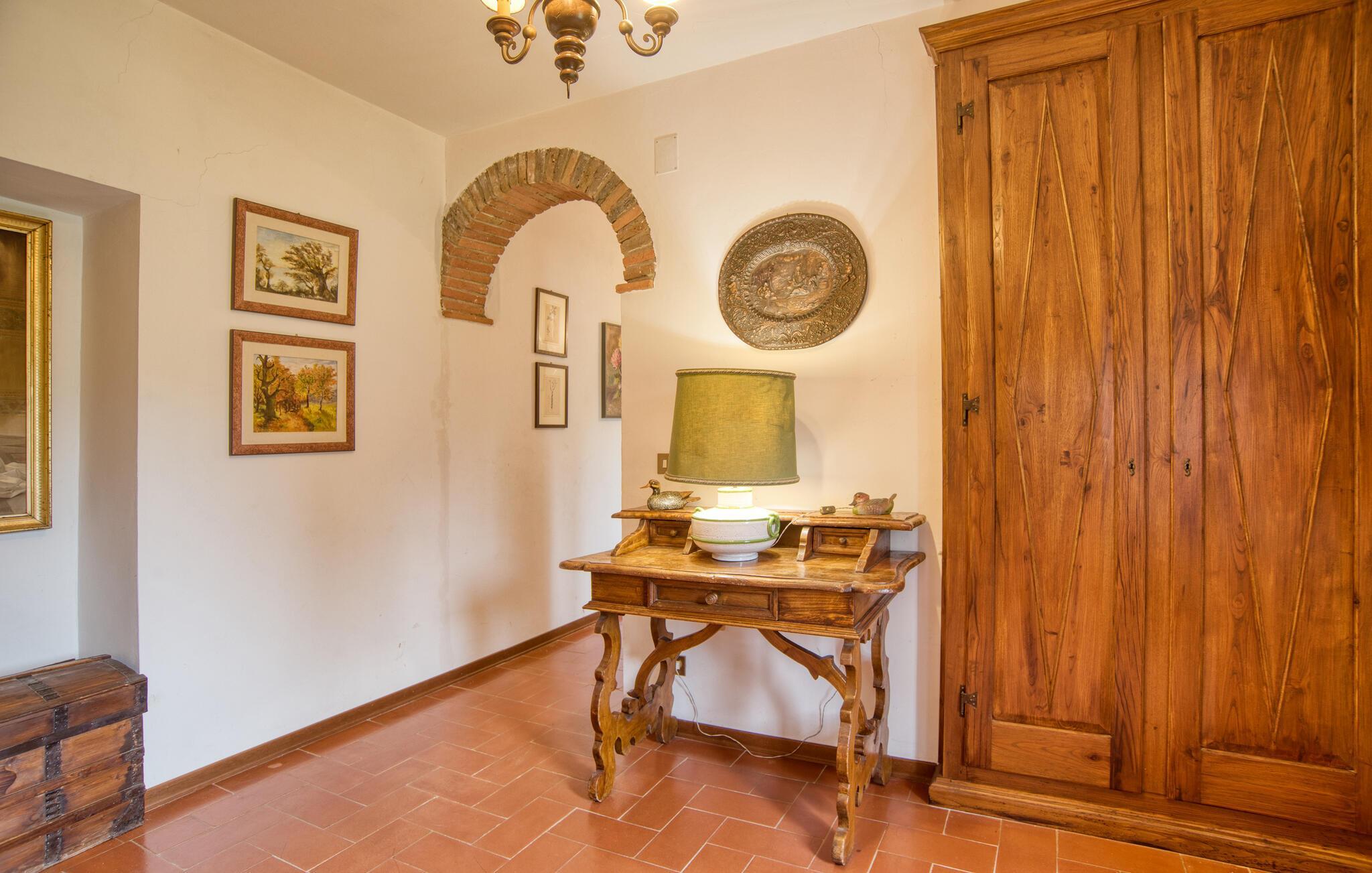 Nur 1 km außerhalb von Monte San Savino liegt diese stattliche Ferienhaus mit Pool auf einer kleinen Anhöhe. Im Erdgeschoss finden Sie einen großzügigen, auch im Sommer angenehm kühlen Wohnbereich mit Esszimmer, offenem Kamin, Bad und einer rustikalen Sommerküche mit Pizzaofen. Eine breite Steintreppe führt über die Loggia in den 1.Stock: Zunächst betreten Sie das große Wohn-Esszimmer mit offenem Kamin, mit angrenzender moderner Küche; weiter gelangen Sie von hier zu 3 Schlafzimmern und 2 Badezimmern. Eine (steile!) Treppe führt ins obere Geschoss, wo Sie über einen kleinen Salon mit Schlafcouch zum 4.Schlafzimmer und ins Bad gelangen.