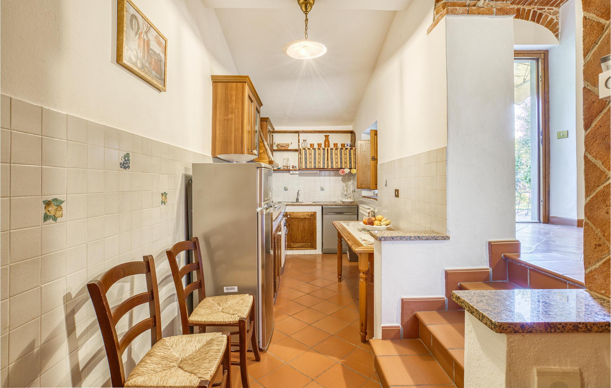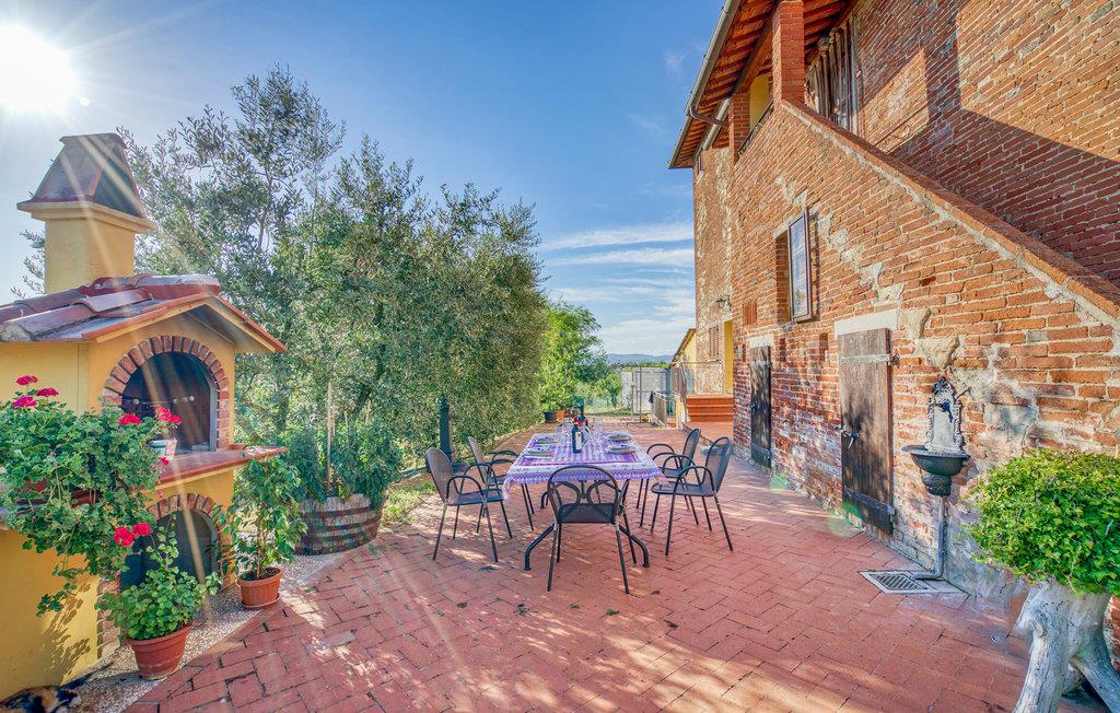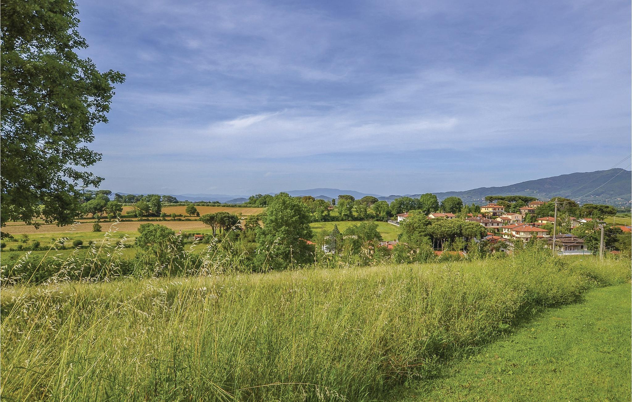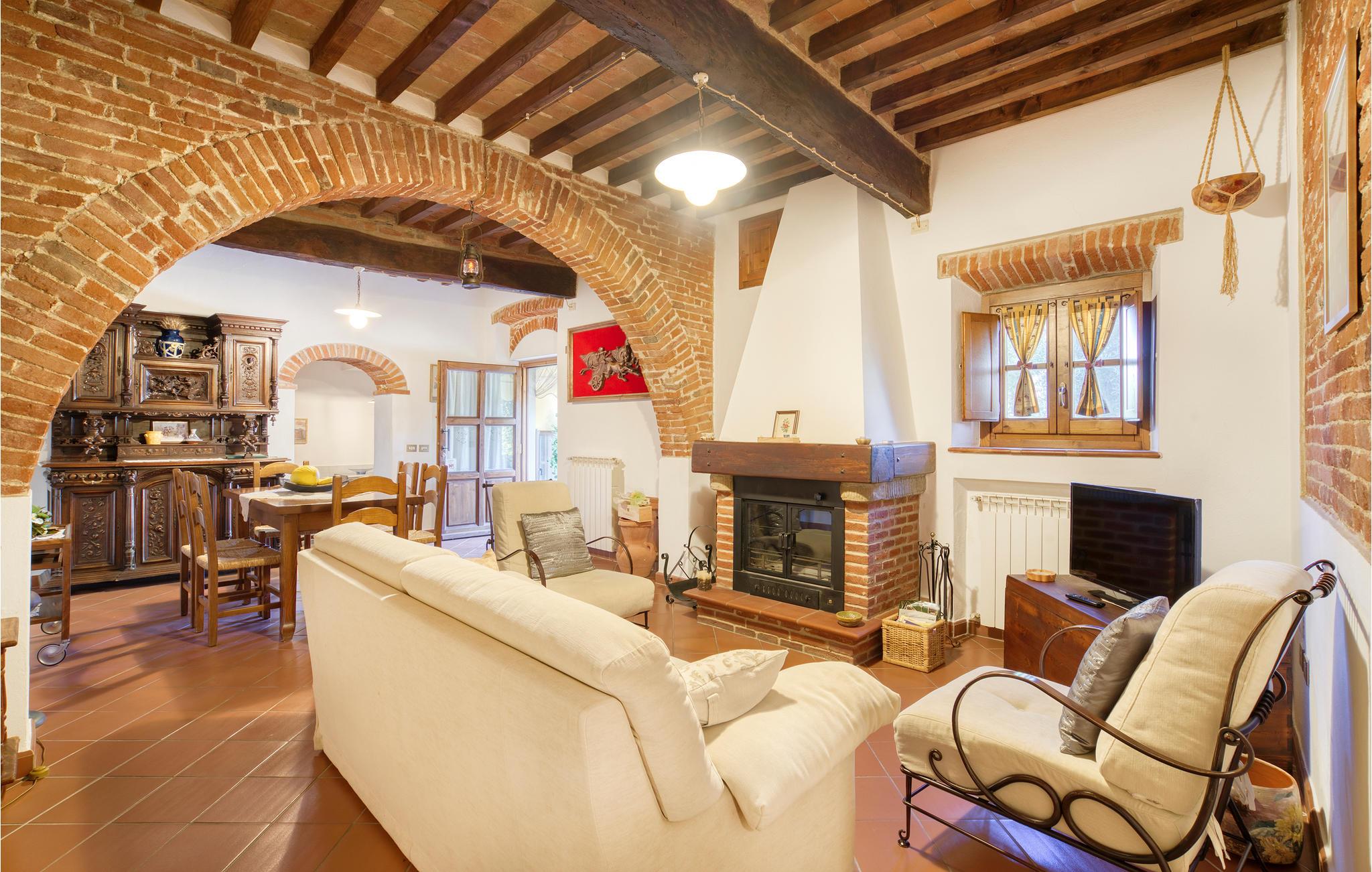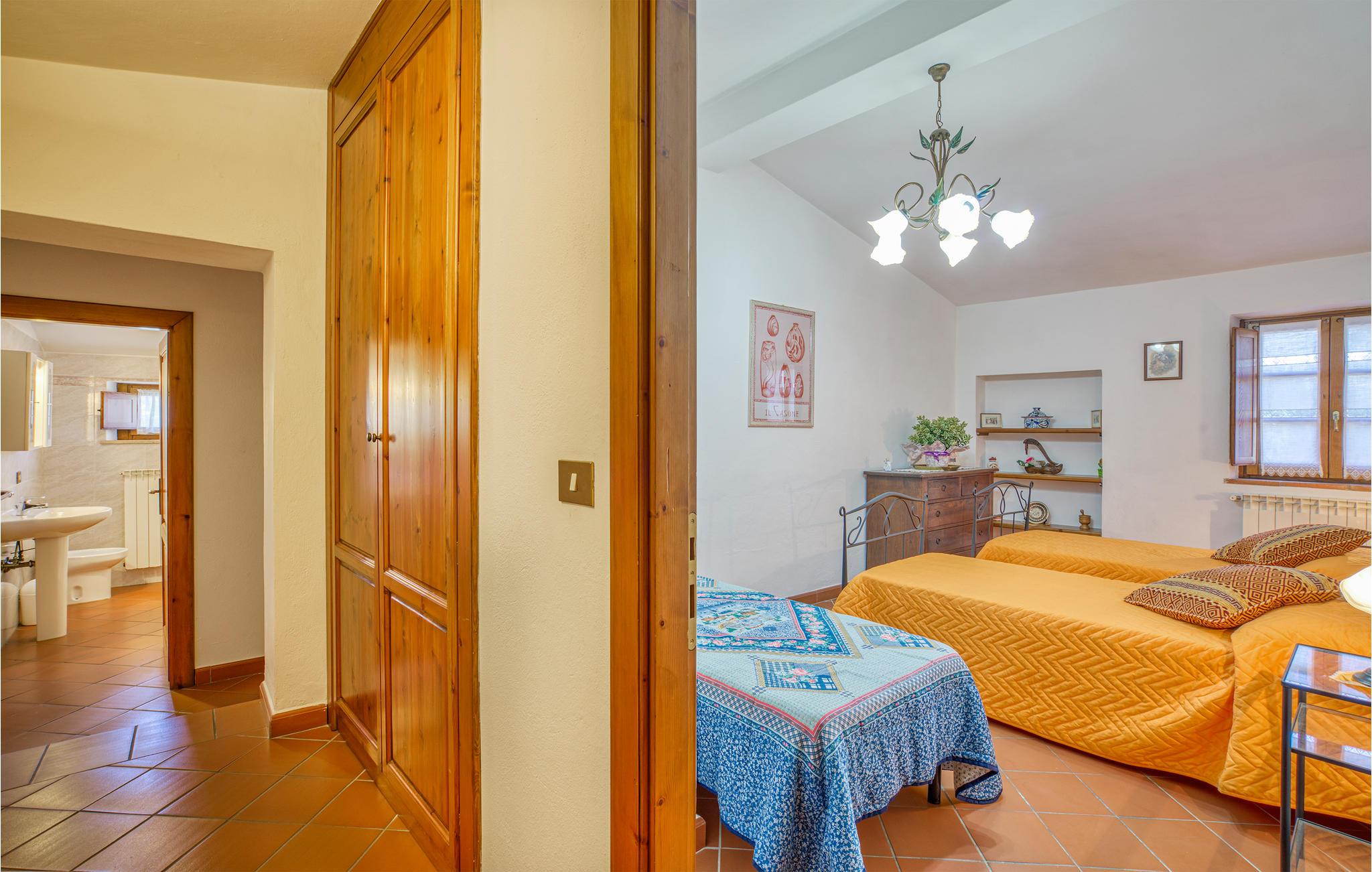 Auf einer kleinen Anhöhe im Chianatal befindet sich diese komfortable Ferienwohnung im Erdgeschoss einer privaten Villa. Sie betreten die Wohnung über die private Terrasse und befinden sich direkt im zentralen Wohnbereich, sehr gemütlich mit seinen antiken Mauern, Bögen und Deckenbalken; die Küchenecke, drei Schlafzimmer (eines mit Ausgang auf die Terrasse) und zwei Bäder schließen sich an. Die Einrichtung ist im toskanischen bäuerlichen Stil, mit offenem Kamin. Vor der Wohnung erstreckt sich die lange Backstein-Terrasse mit Sitzplatz und Barbecue. Zur Wohnung gehört außerdem ein gepflegter Gartenbereich mit Sitzplatz, Liegewiese und Kinderspielen – von überall genießen Sie einen weiten Blick über das Chiana-Tal. Die freundliche Eigentümerin bewohnt das obere Stockwerk. Die Lage ist äußerst günstig für Erkundungen der zentralen Toskana – im Nu erreichen Sie Arezzo (15 km): Bummeln Sie durch den zentralen Corso, der Sie hinauf in die alte Stadt bis zur Kathedrale führt. Sehenswerte Kirchen gibt es in Arezzo mindestens drei: die Kathedrale selbst, die die gesamte Stadt dominiert; die mittelalterliche „Pieve“ und die Kirche San Francesco. Auf der davor liegenden Piazza schmeckt der Aperitif am besten; unter den Vasari-Loggen auf der Piazza Grande hingegen lassen sich kulinarische und optische Genüsse aufs Beste verbinden. An jedem ersten Wochenende im Monat wird die ganze Altstadt vom großen nationalen Antiquitätenmarkt bunt belebt, in den Monaten Juni und September finden auf der Piazza Grande die traditionellen Reiterspiele des Saracino statt. Weitere lohnende Ausflugsziele: Die pittoreske Etruskerstadt Cortona (25 km), Monte San Savino (6 km) und Lucignano (10 km); Der Lago Trasimeno (35 km) oder die mittelalterliche Weinstadt Montepulciano (40 km) und natürlich Siena (60 km) mit dem schönsten Platz der Welt, dem "Campo"! Das Zentrum der kleinen Ortschaft Alberoro mit allerlei Geschäften, Bar, Ristorante erreichen Sie von hier aus auch gut zu Fuß (500 m).