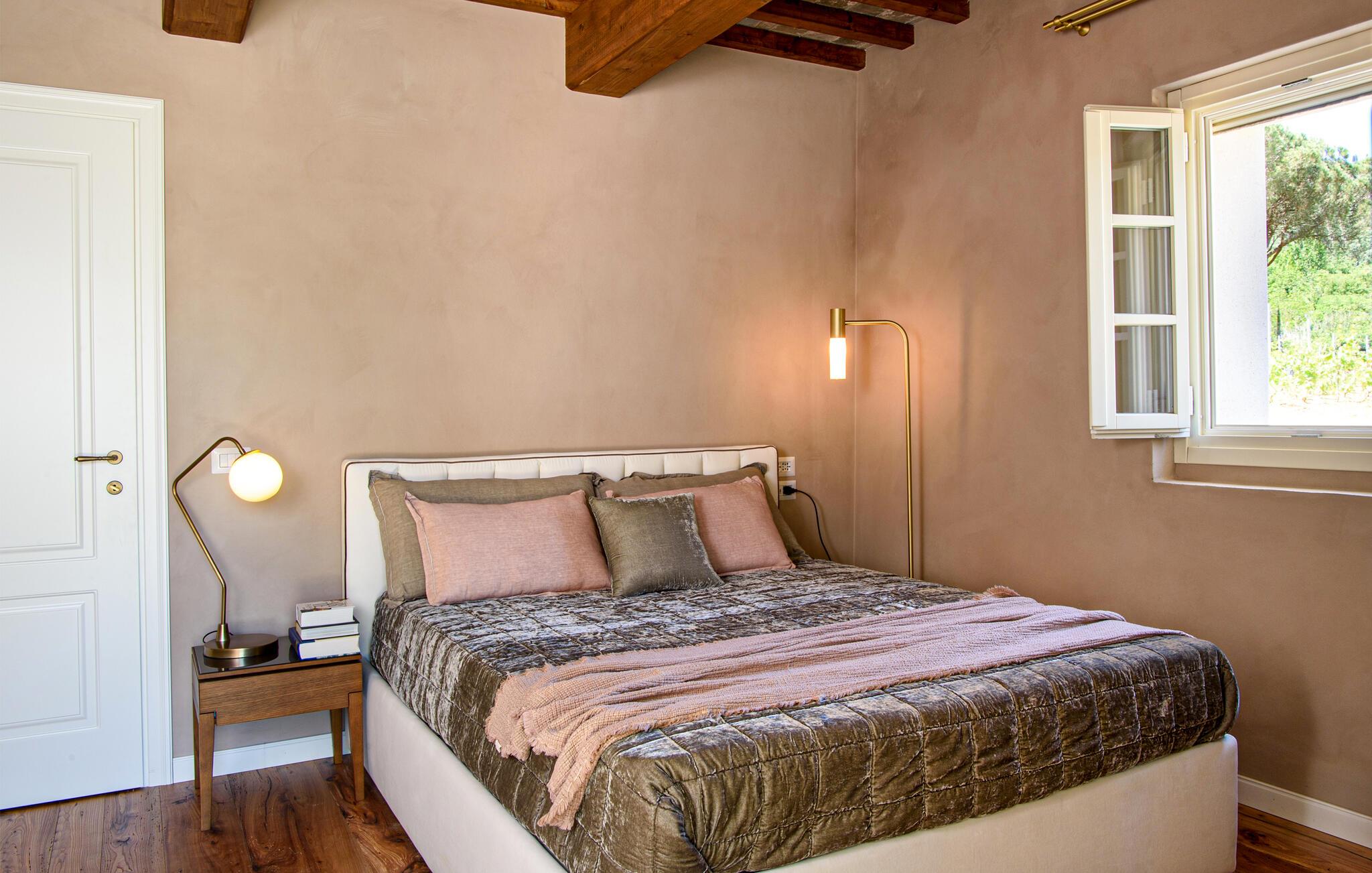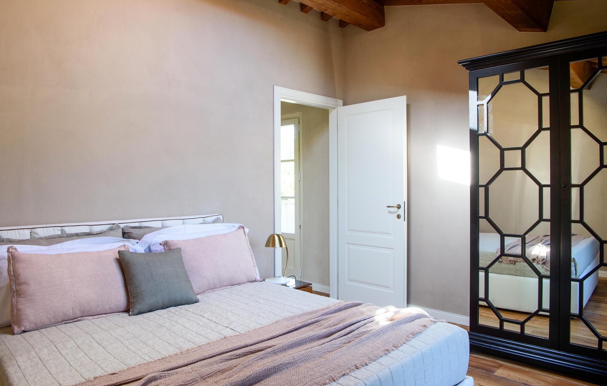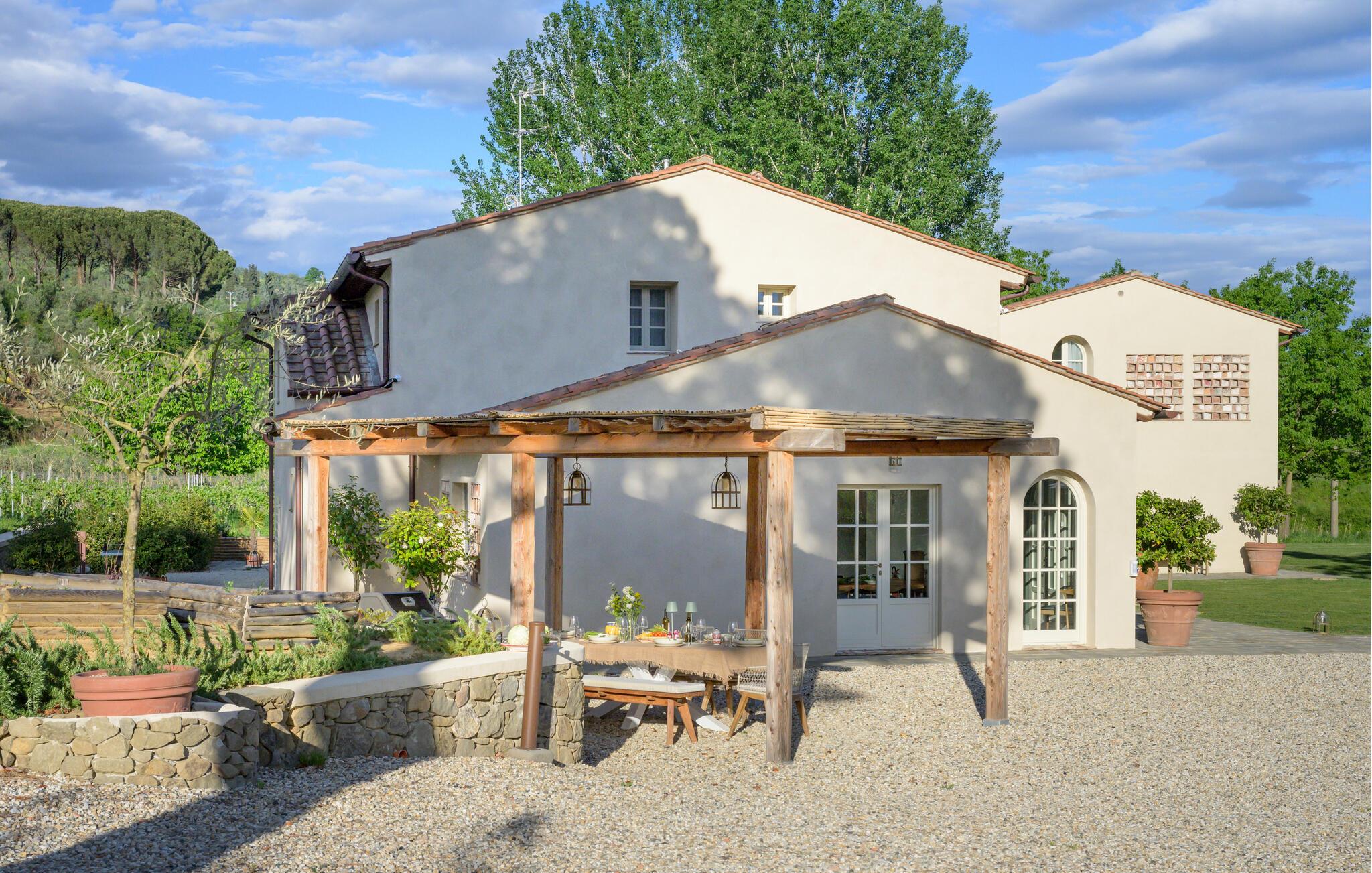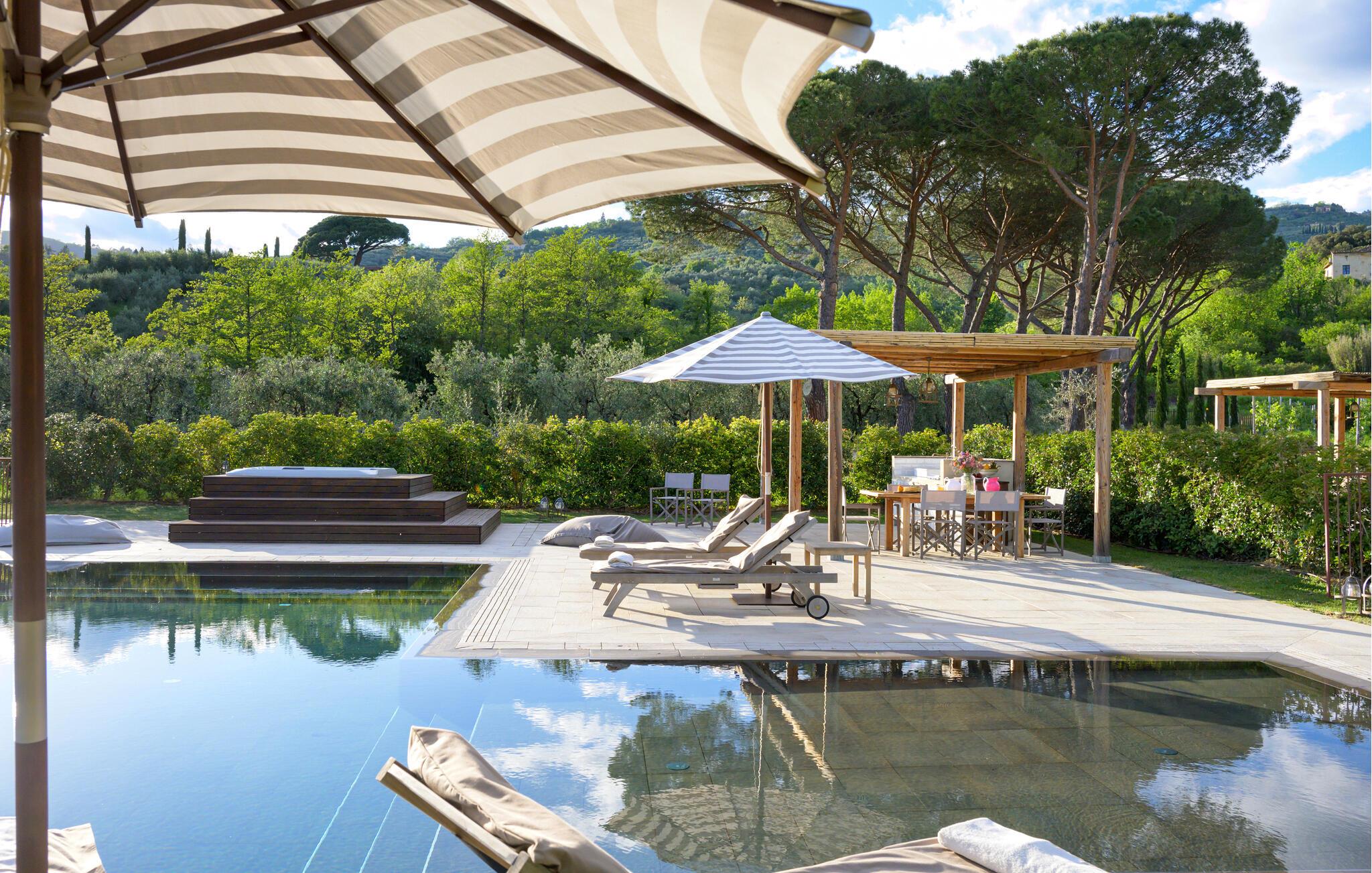 Diese großzügige Villa begeistert mit einer geschmackvollen Mischung aus modernem Design und toskanischer Gemütlichkeit. Helle Räume, freiliegende Holzbalken und elegante Möbel schaffen eine einladende Atmosphäre. Bereiten Sie gemeinsam köstliche Mahlzeiten in der offenen Küche zu und zelebrieren Sie diese im behaglichen Essbereich. Entfachen Sie den Kamin, machen Sie es sich mit einem Buch bequem oder streamen Sie einen spannenden Film.