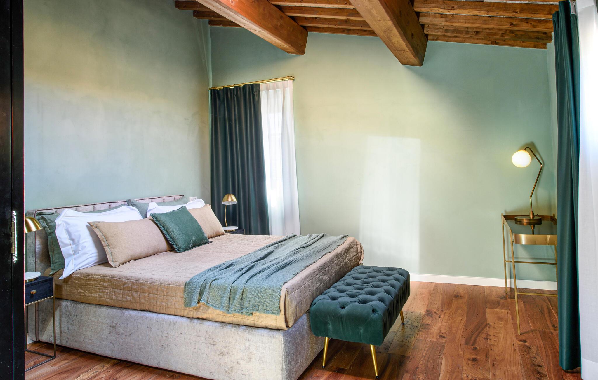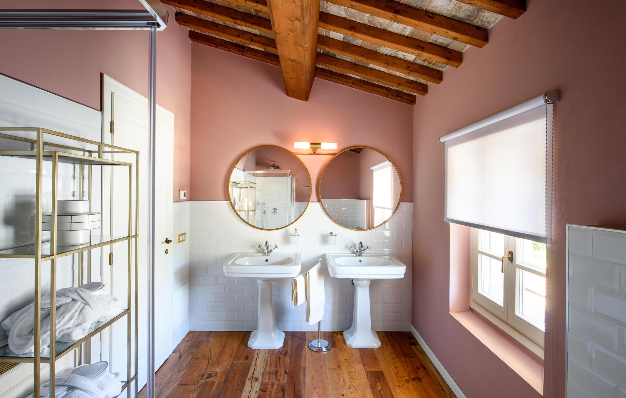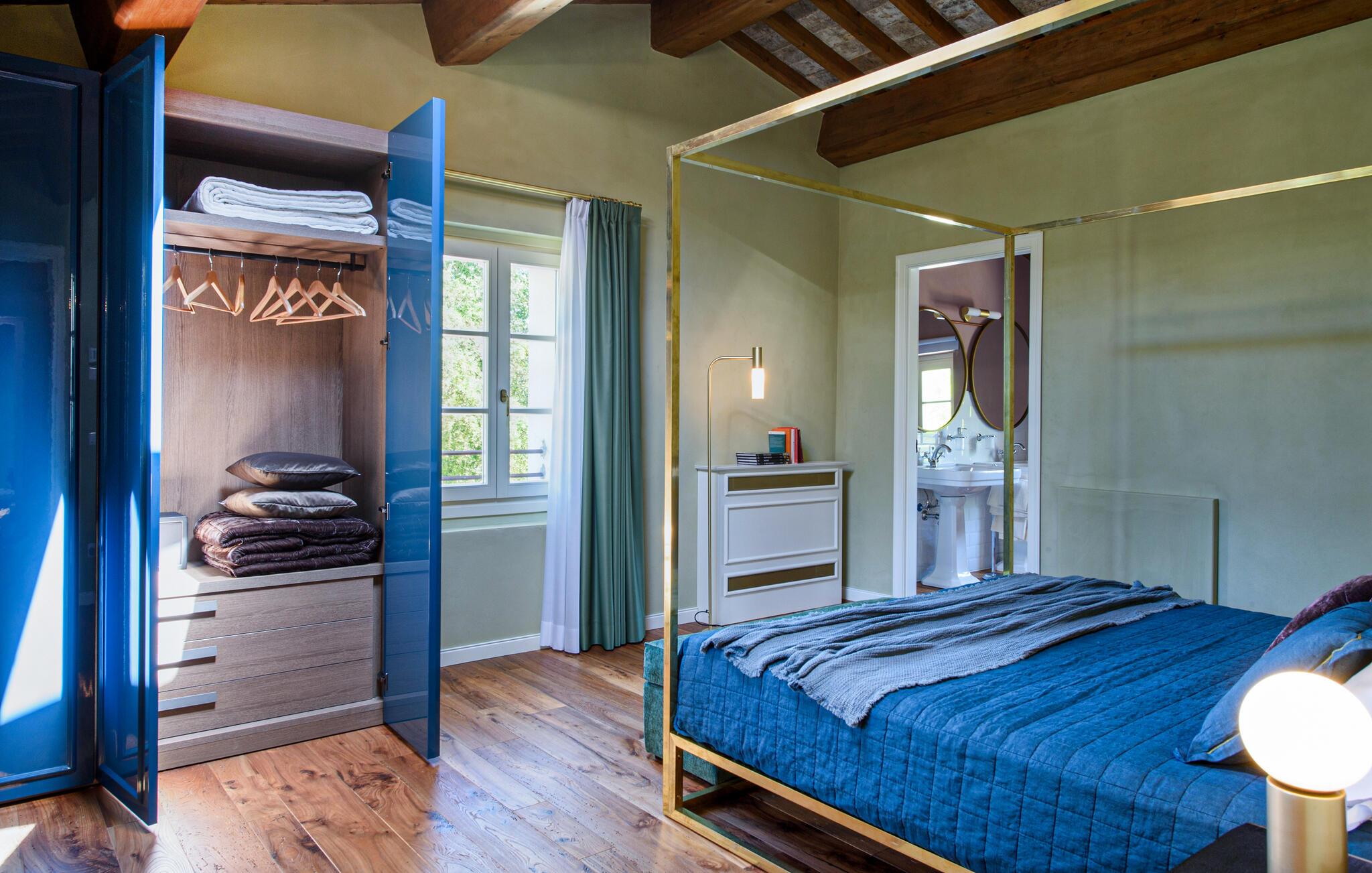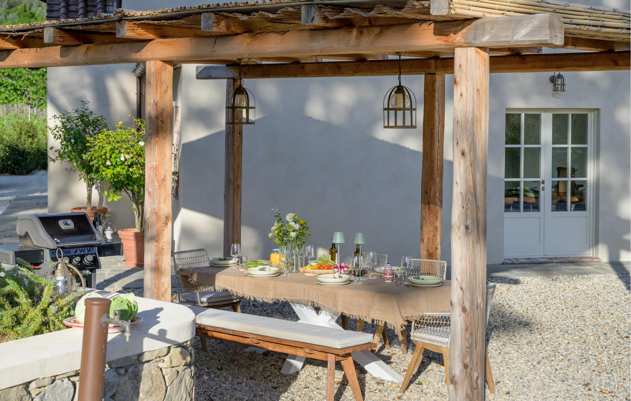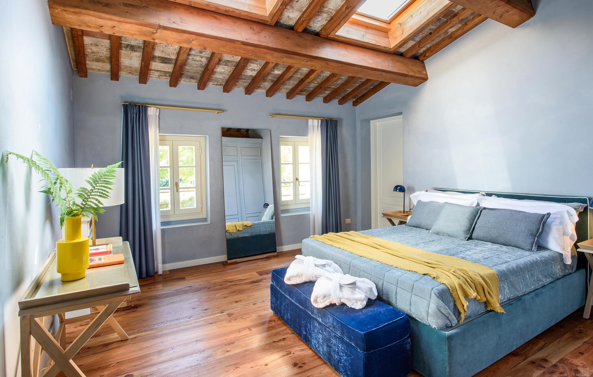 Diese großzügige Villa begeistert mit einer geschmackvollen Mischung aus modernem Design und toskanischer Gemütlichkeit. Helle Räume, freiliegende Holzbalken und elegante Möbel schaffen eine einladende Atmosphäre. Bereiten Sie gemeinsam köstliche Mahlzeiten in der offenen Küche zu und zelebrieren Sie diese im behaglichen Essbereich. Entfachen Sie den Kamin, machen Sie es sich mit einem Buch bequem oder streamen Sie einen spannenden Film.