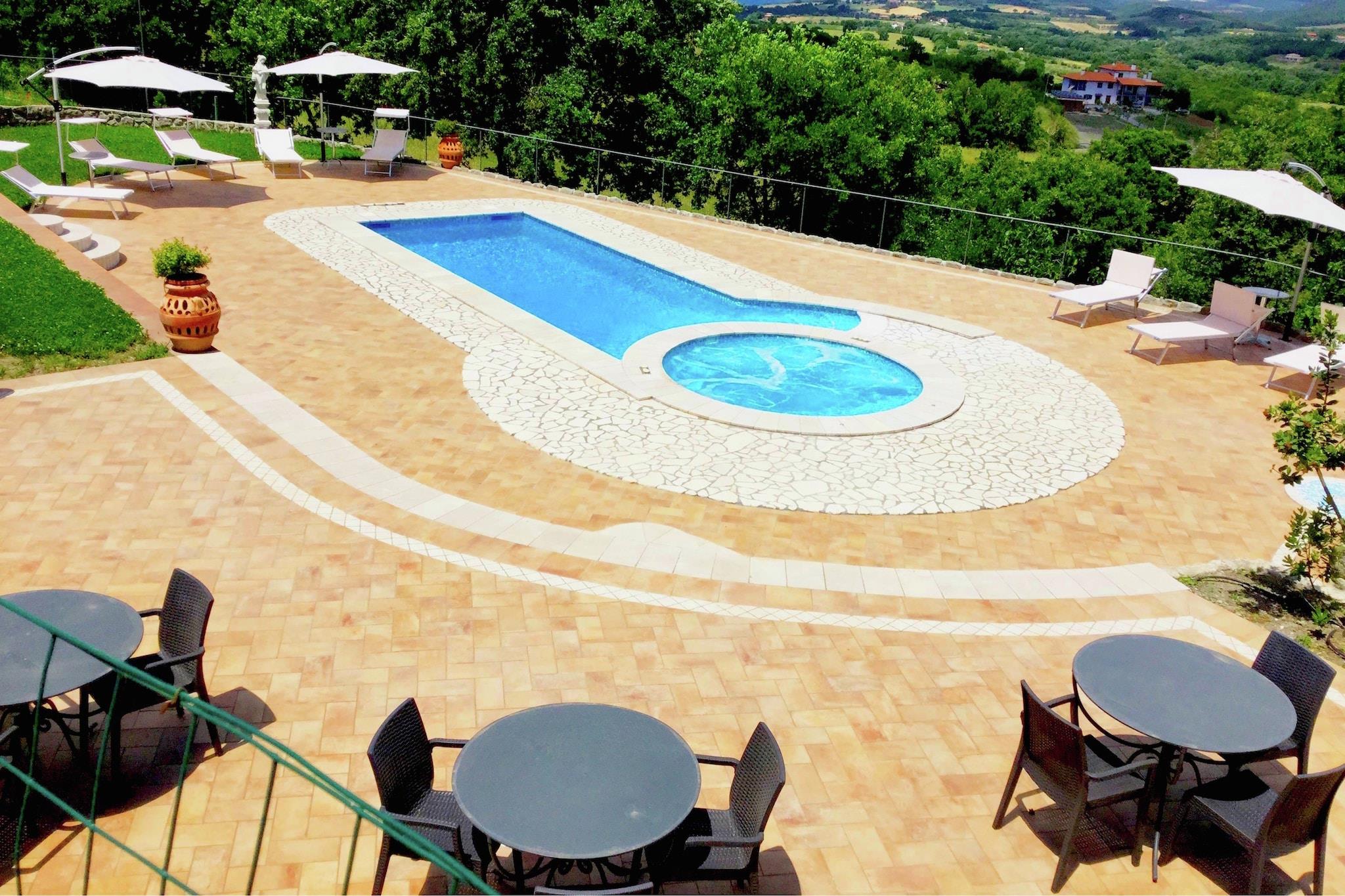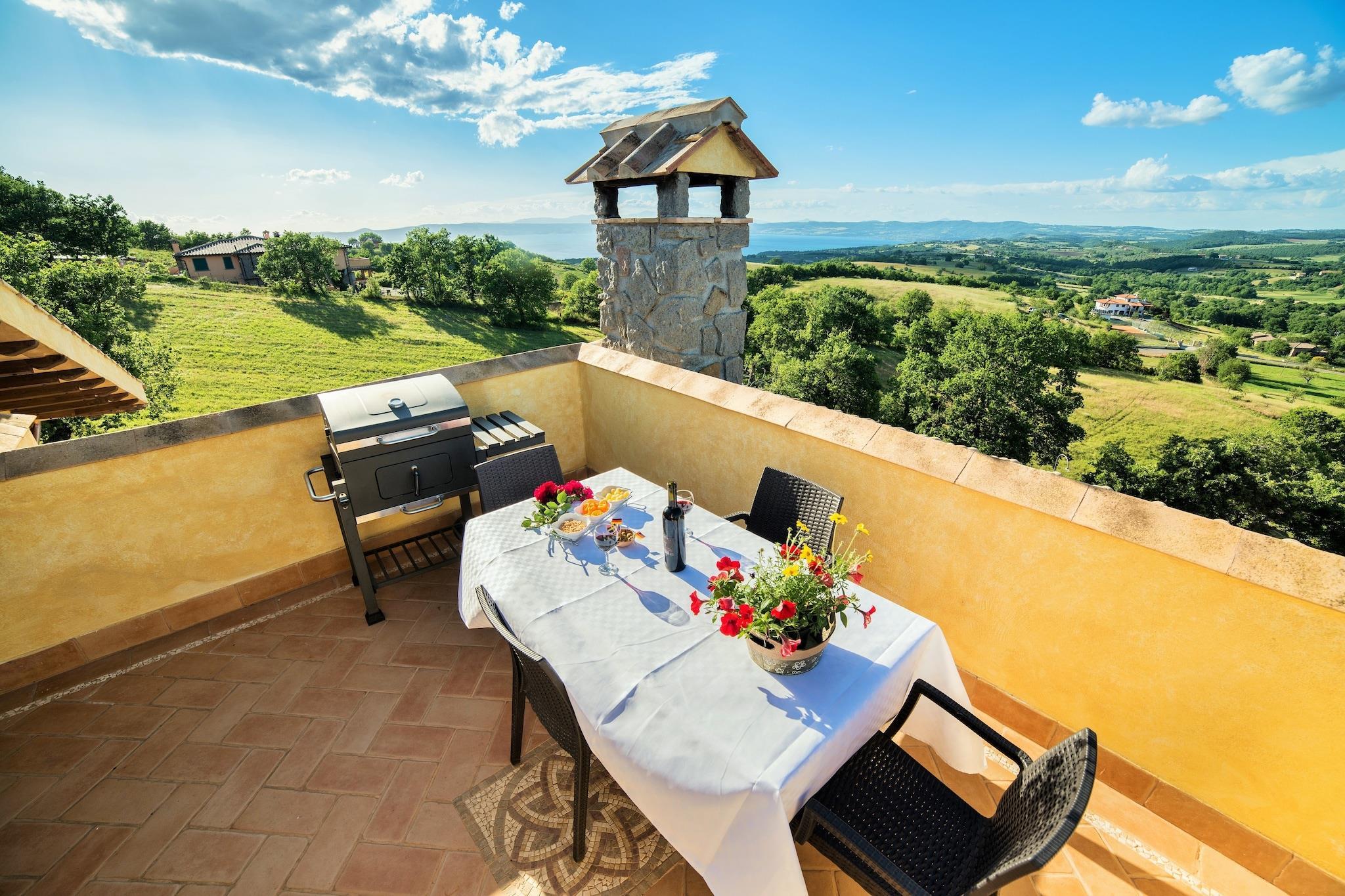 Eingebettet in einen üppig bewachsenen Hang mit weitem Blick auf den Bolsenasee und die toskanisch-umbrische Landschaft, bietet diese bezaubernde Villa einen einladenden Rückzugsort für große Familien, Freundesgruppen und ihre geliebten Haustiere. Die Villa vereint auf harmonische Weise rustikale Eleganz mit modernem Komfort. Ihre malerische Dachterrasse, die charmanten Veranden und der weitläufige, von jahrhundertealten Eichen beschattete Garten machen sie zum perfekten Ort zum Entspannen, Speisen und Feiern unter freiem Himmel. Die Villa erstreckt sich über vier großzügige Etagen und bietet eine durchdachte Raumaufteilung mit mehreren voll ausgestatteten Küchen, gemütlichen Wohn- und Essbereichen sowie 10 geschmackvoll eingerichteten Schlafzimmern, viele davon mit eigenem Balkon oder Terrasse. Einige Zimmer verfügen über ein eigenes Badezimmer, was Komfort und Privatsphäre garantiert. Klimaanlage, Sat-TV, Waschmaschinen auf jeder Etage und ein privater Wellnessbereich mit Sauna und Whirlpool runden Ihren Aufenthalt ab. Im Außenbereich erwarten Sie ein privater Swimmingpool, ein Grillplatz, Sonnenliegen und ein großer, umzäunter Garten – ein Paradies für Kinder und Haustiere. Von Tischtennis und Tischfußball bis hin zu einem Spielplatz mit Rutschen – hier ist für Unterhaltung für jeden etwas dabei. Ob Sie ein Abendessen mit Privatkoch, eine Weinprobe oder eine Bootsfahrt auf dem Bolsenasee planen – wir organisieren gerne individuelle Erlebnisse für einen unvergesslichen Aufenthalt in der Toskana und Umbrien. Hinweis: Wasser, Bettwäsche, WLAN, Pool/Whirlpool, Parkplatz und Spielplätze sind inklusive. Strom ist mit 20 kWh/Tag inklusive (Mehrverbrauch: 0,50 EURO/kWh). Gas ist von Juni bis September inklusive; in den übrigen Monaten mit 2 m³/Tag (Mehrverbrauch: 5,00 EURO/m³). Vier Espressomaschinen, ein Grill, ein Kamin und ein Holzofen (auf Anfrage) stehen Ihnen zur Verfügung.