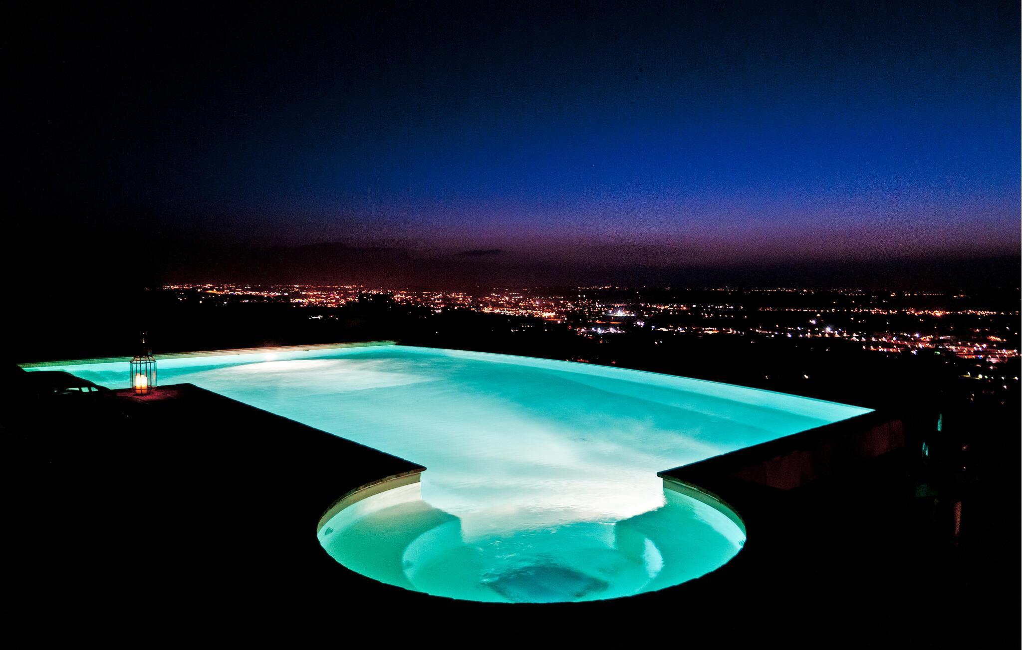 Genießen Sie in diesem Ferienhaus mit Pool und Whirlpool einen atemberaubenden Panoramablick.