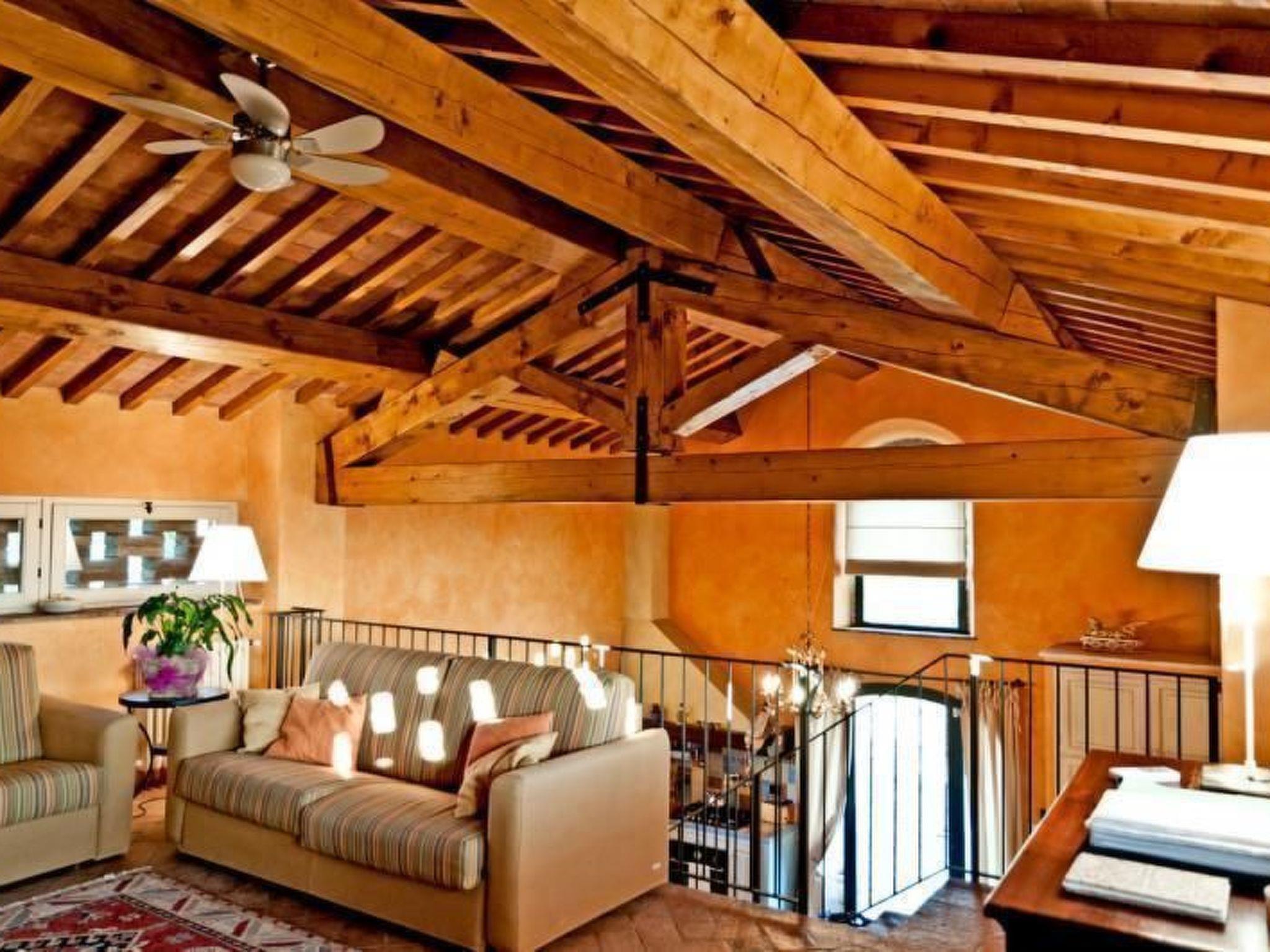 Es bietet Platz für bis zu sechs Personen und besteht aus einer hellen, farbenfrohen und voll ausgestatteten Küche mit modernen Annehmlichkeiten, zwei Doppelzimmern mit originalen antiken schmiedeeisernen Betten und zwei Bädern mit Duschkabinen. Im Obergeschoss befindet sich ein herrlicher Dachboden mit Kamin, der als Wohnzimmer mit zwei Sofas (eines davon ist ein Schlafsofa für zwei Personen) genutzt wird und ebenfalls im typisch toskanischen Stil mit einer antiken und originalen Kommode aus dem 19. Jahrhundert, Satellitenfernsehen, DVD, Stereoanlage mit CD-Spieler, kostenlosem Internetanschluss, Büchern und Zeitschriften sowie einem Korb mit Holz für den Kamin eingerichtet ist.