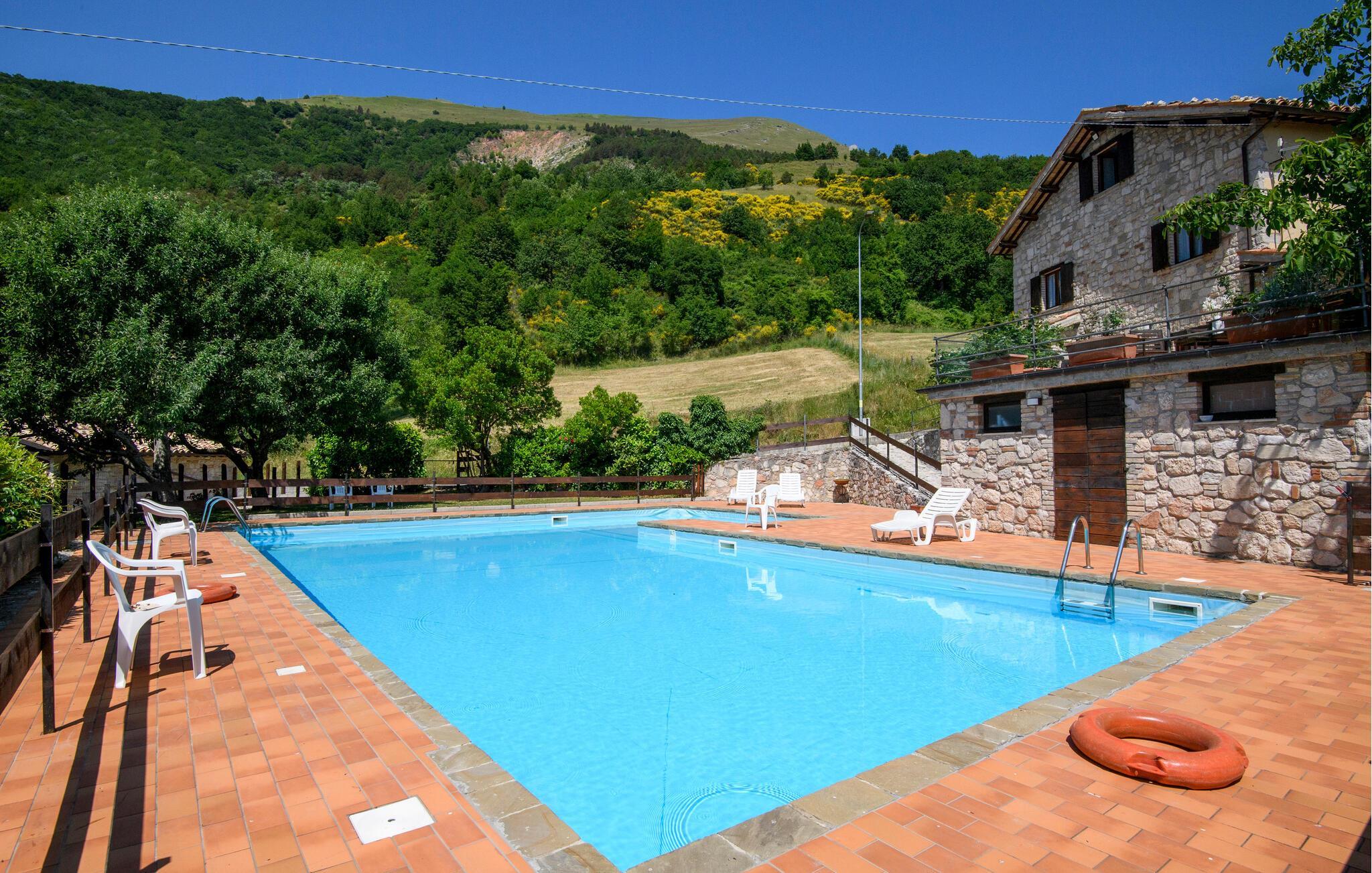 Genießen Sie nach einer Erfrischung im mit anderen Gästen geteilten Pool die Sonne auf der Terrasse, vielleicht verbringen Sie hier auch laue Sommerabende mit kalten Getränken vor zauberhafter Kulisse.