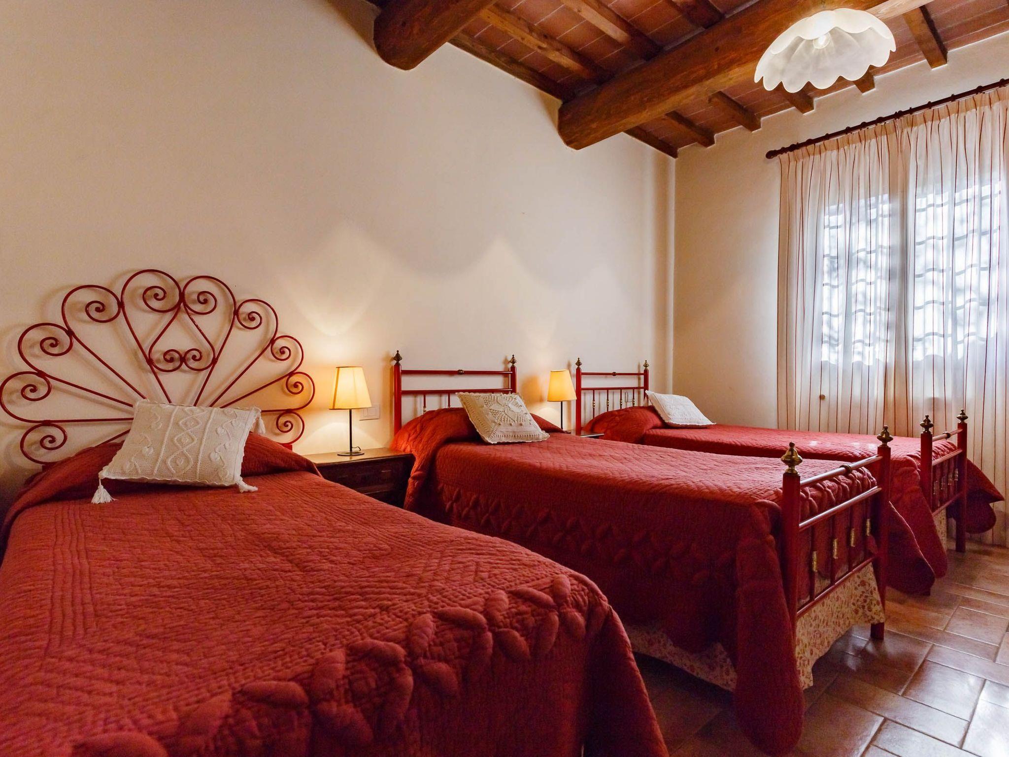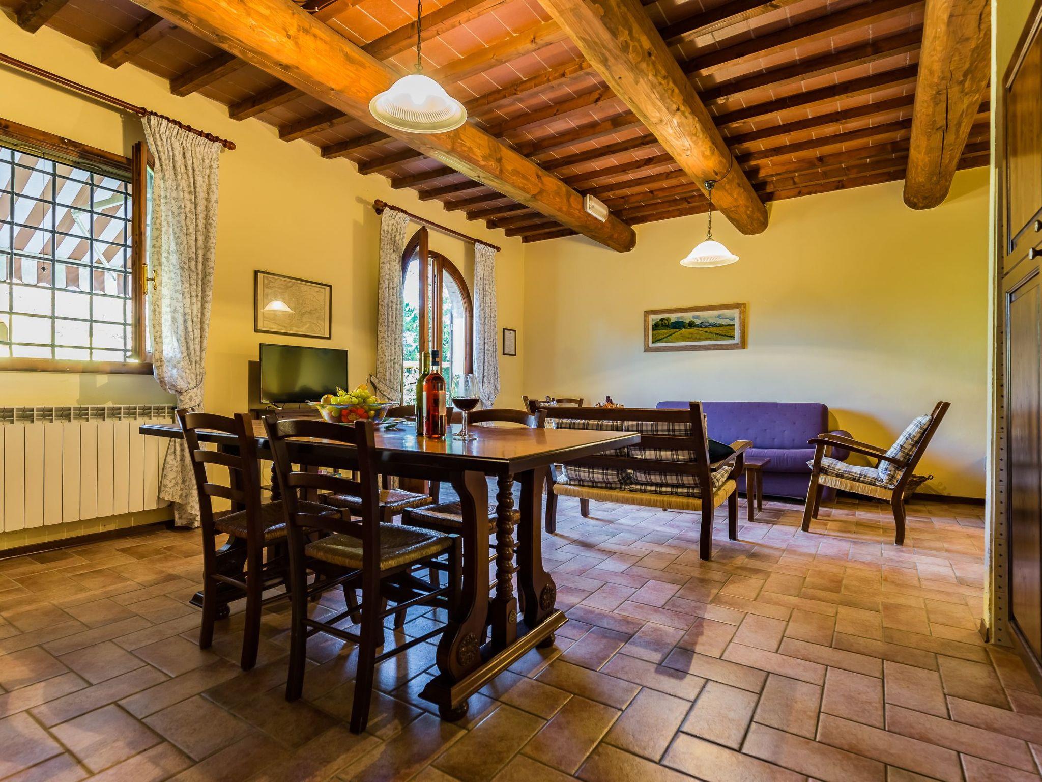 Im Erdgeschoss: großes Wohnzimmer mit ausgestatteter Küchenzeile und Essecke, Kamin und Fernseher. 2 Schlafzimmer und 1 Bad mit Dusche: ein Zimmer mit Doppelbett und eines mit drei Einzelbetten. Unabhängige Heizung. Ein Schlafsofa ist im Wohnzimmer vorhanden. Veranda am Eingang mit Tisch und Stühlen im Garten. Auf dem Grundstück: - Schwimmbad mit Aussicht, ganztägig geöffnet; - Restaurant auf Vorbestellung: Frühstücksbuffet, leichtes Mittagessen und toskanische Abendessen im Garten; - Weinkeller für die Herstellung von Chianti und supertoskanischen Weinen: Führungen und Verkostungen; - Direktverkauf der landwirtschaftlichen Produkte: Weine, natives Olivenöl extra und Aufschnitt; - Parkplatz.