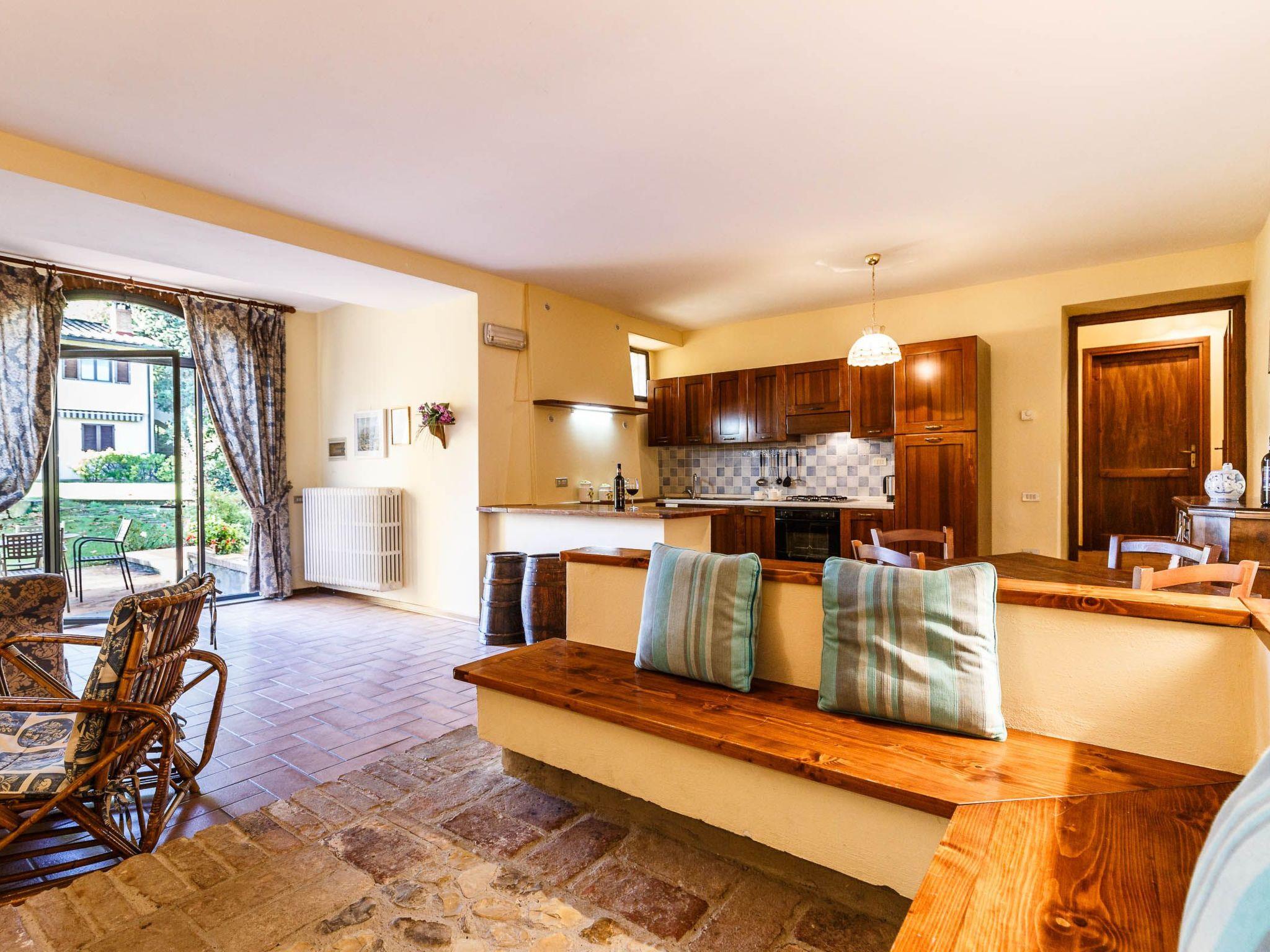 Im Erdgeschoss: großes Wohnzimmer mit ausgestatteter Küchenzeile und Essecke, Kamin und Fernseher. 1 Doppelschlafzimmer, 1 Badezimmer mit Dusche. Unabhängige Heizung. Ein Schlafsofa ist im Wohnzimmer vorhanden. Veranda am Eingang mit Tisch und Stühlen im Garten. Auf dem Grundstück: - Schwimmbad mit Aussicht, ganztägig geöffnet; - Restaurant auf Vorbestellung: Frühstücksbuffet, leichtes Mittagessen und toskanische Abendessen im Garten; - Weinkeller für die Herstellung von Chianti und supertoskanischen Weinen: Führungen und Verkostungen; - Direktverkauf der landwirtschaftlichen Produkte: Weine, natives Olivenöl extra und Aufschnitt; - Parkplatz.