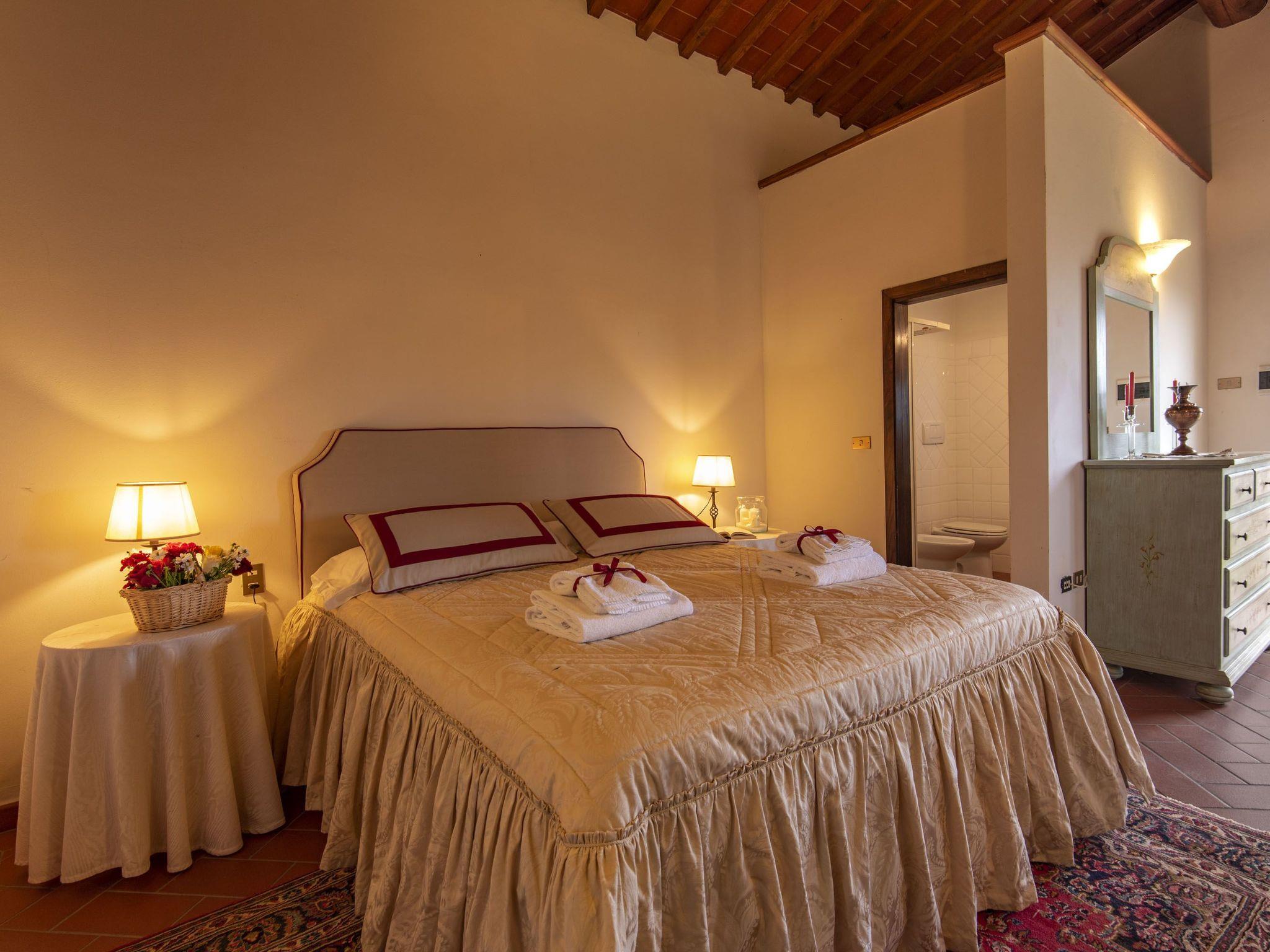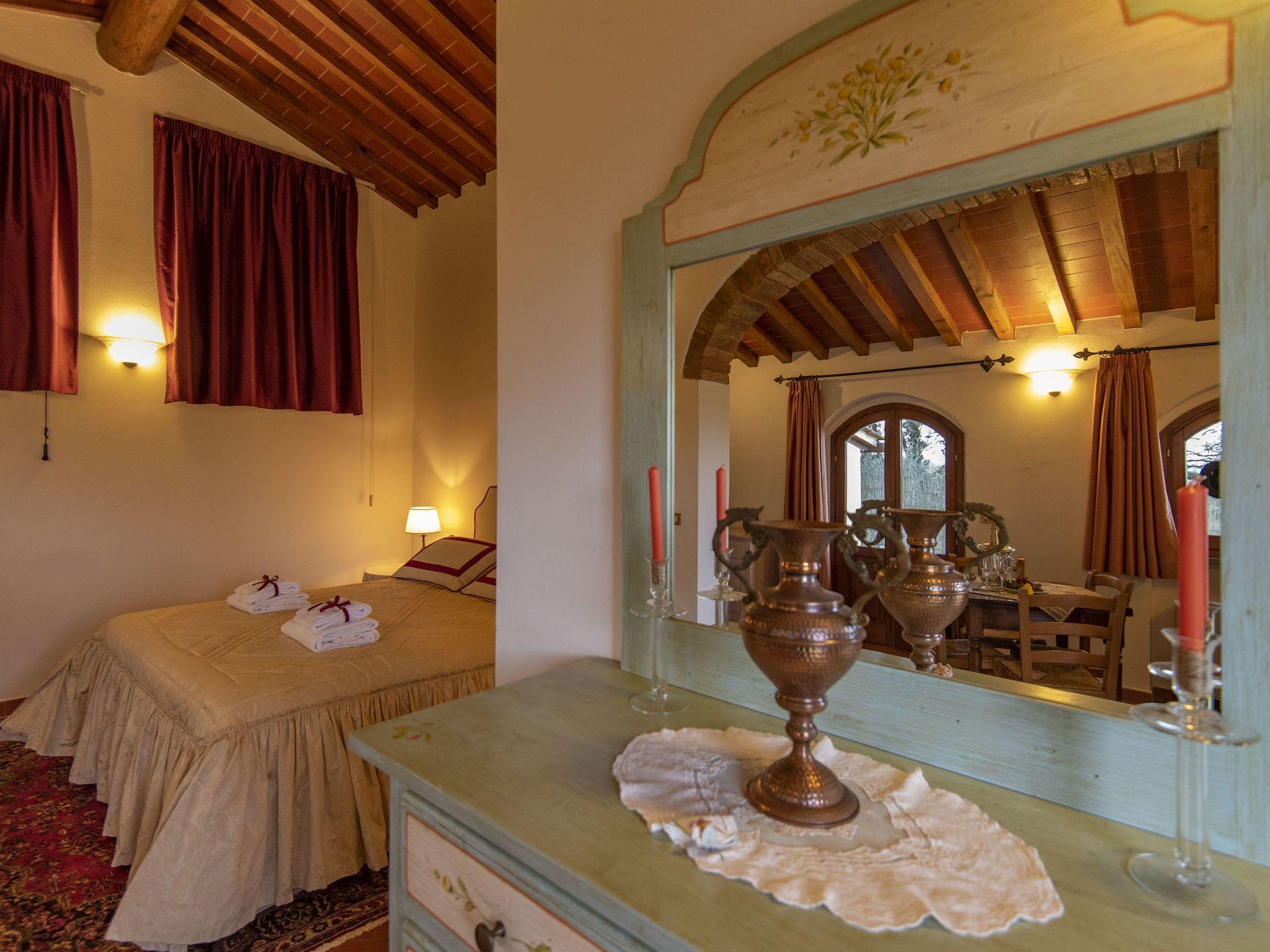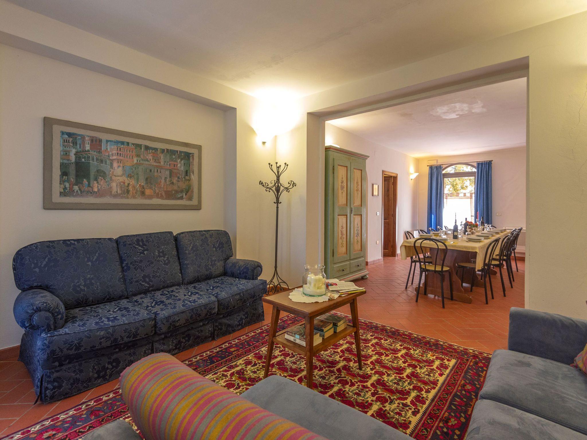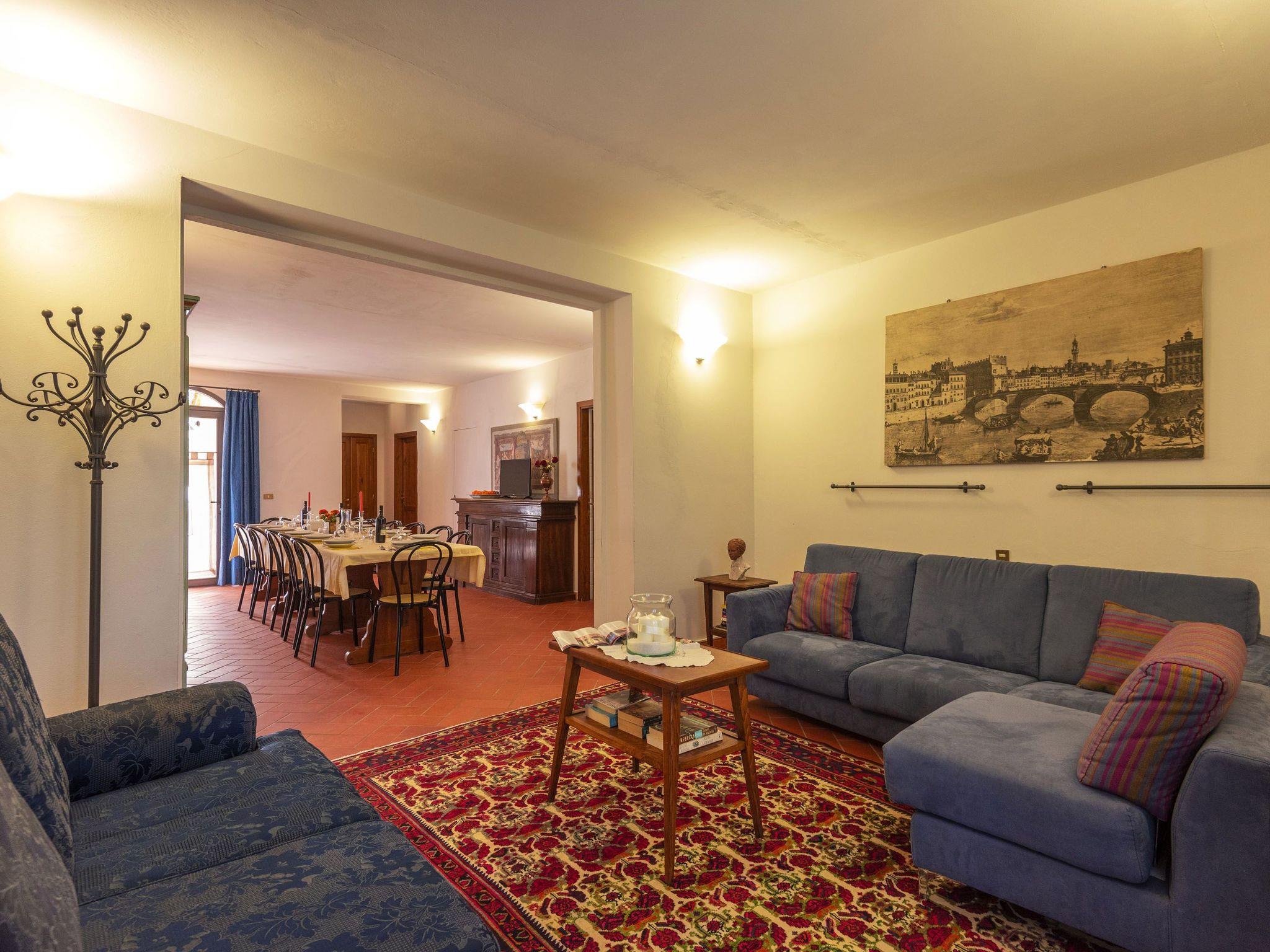 Umgeben von Olivenhainen und Weinbergen liegt die Villa für 21 Personen in der Chianti-Landschaft in Panoramalage auf einem Hügel, von dem aus sich ein herrlicher Blick auf die toskanische Landschaft bietet. Es wurde im 19. Jahrhundert als Herrenhaus eines großen landwirtschaftlichen Anwesens erbaut und befindet sich in Montespertoli, einem Ortsteil von Montegufoni, etwa auf halber Strecke zwischen Florenz und Siena, in einer sehr ruhigen und verkehrsfreien Lage. Es gibt fünf Wohnungen, von denen sich eine im zweiten Stock der Villa befindet und eine herrliche Aussicht genießt. Drei weitere Wohnungen befinden sich in einem an die Villa angrenzenden Gebäude im Erdgeschoss, im ersten und im zweiten Stock; die letzte ist ein Nebengebäude im Garten. Jede der Wohnungen verfügt über eine Wohnküche mit Satellitenfernsehen, mehrere Schlafzimmer und Bäder. Im zweiten Stock befinden sich drei Doppelzimmer und zwei Bäder mit Dusche und Bidet. Im ersten Stock gibt es zwei Doppelzimmer und ein Zweibettzimmer sowie zwei Bäder mit Dusche und Bidet. Im Erdgeschoss gibt es drei Doppelzimmer, ein Zweibettzimmer und vier Bäder mit Dusche und Bidet. Auf dieser Etage befinden sich eine große Küche mit Elektroherd, Mikrowelle, Gasherd, Kaffeemaschine, Geschirrspüler und Waschmaschine, in der im Allgemeinen für alle Mitglieder der Gruppe gekocht wird, sowie ein Esszimmer, in dem gegessen werden kann, wenn das Wetter es nicht zulässt, den großen Garten für Mahlzeiten im Freien zu nutzen. Alle Zimmer sind mit Heizung und Klimaanlage ausgestattet und jede Wohnung verfügt über einen kostenlosen Internetzugang. Das Grundstück ist von einem komplett eingezäunten Garten mit Grillplatz umgeben; es gibt zwei große Pavillons mit Tischen und Stühlen. Der Swimmingpool ist ebenfalls mit Sonnenschirmen und 10 Liegestühlen ausgestattet und ist komplett eingezäunt und durch ein Tor zugänglich, so dass er auch für Kinder sicher ist. In der Umgebung der Villa gibt es zahlreiche landschaftlich reizvolle Routen für lange Ausflüge zu Fuß oder mit dem Fahrrad durch die toskanische Hügellandschaft. In der Nähe der Villa gibt es auch Tennisplätze und zwei Reitställe. Die Villa liegt etwa 20 Kilometer vom Zentrum von Florenz entfernt und ist ein idealer Ausgangspunkt für Tagesausflüge nach Volterra, Vinci, Certaldo, San Gimignano, Siena, Lucca und Pisa. Nur 900 Meter entfernt befindet sich das Dorf Montagnana mit Post, Bank, Bar, Pizzeria und einem bekannten Restaurant, in dem man "la bistecca alla fiorentina" genießen kann.