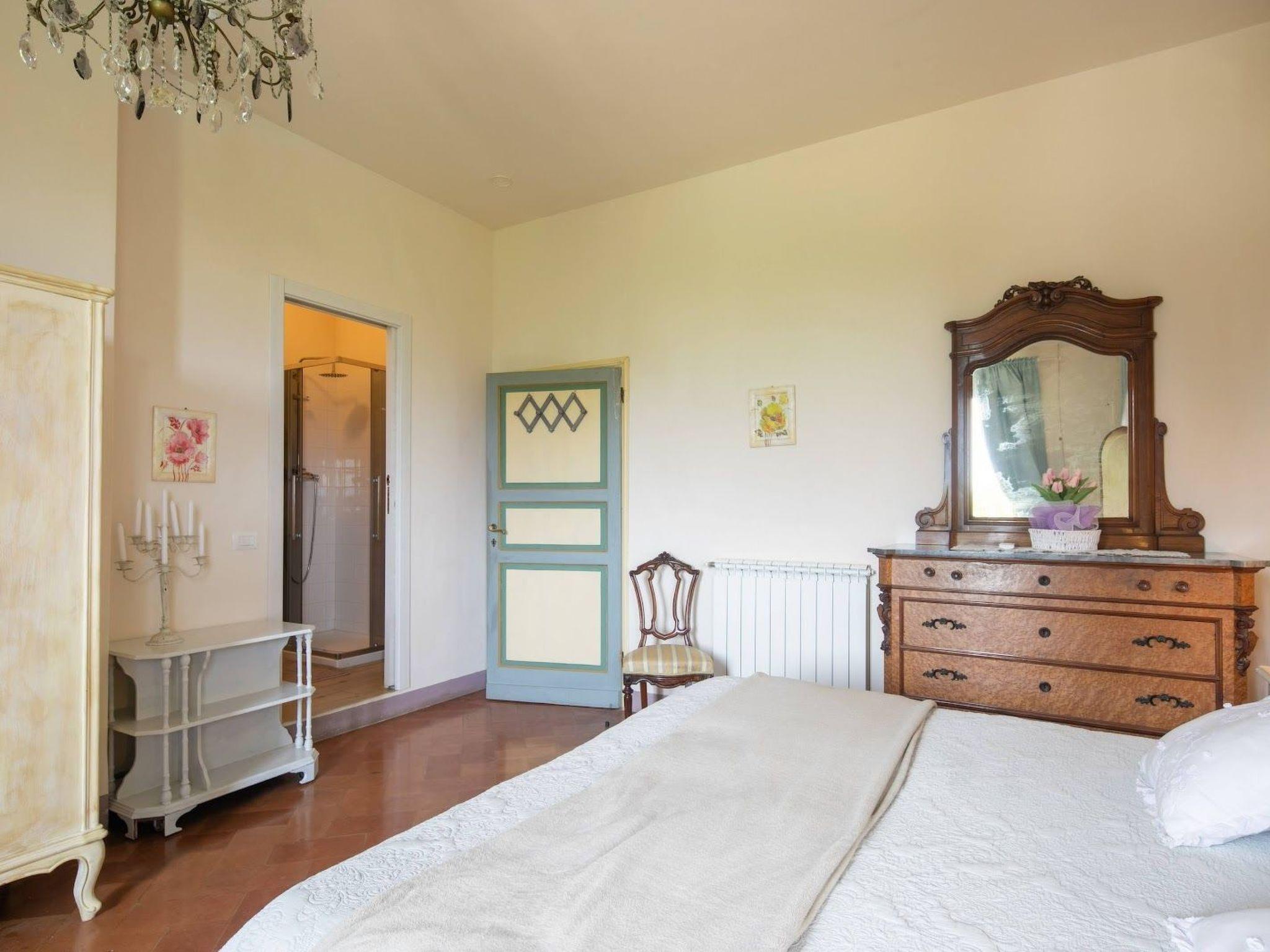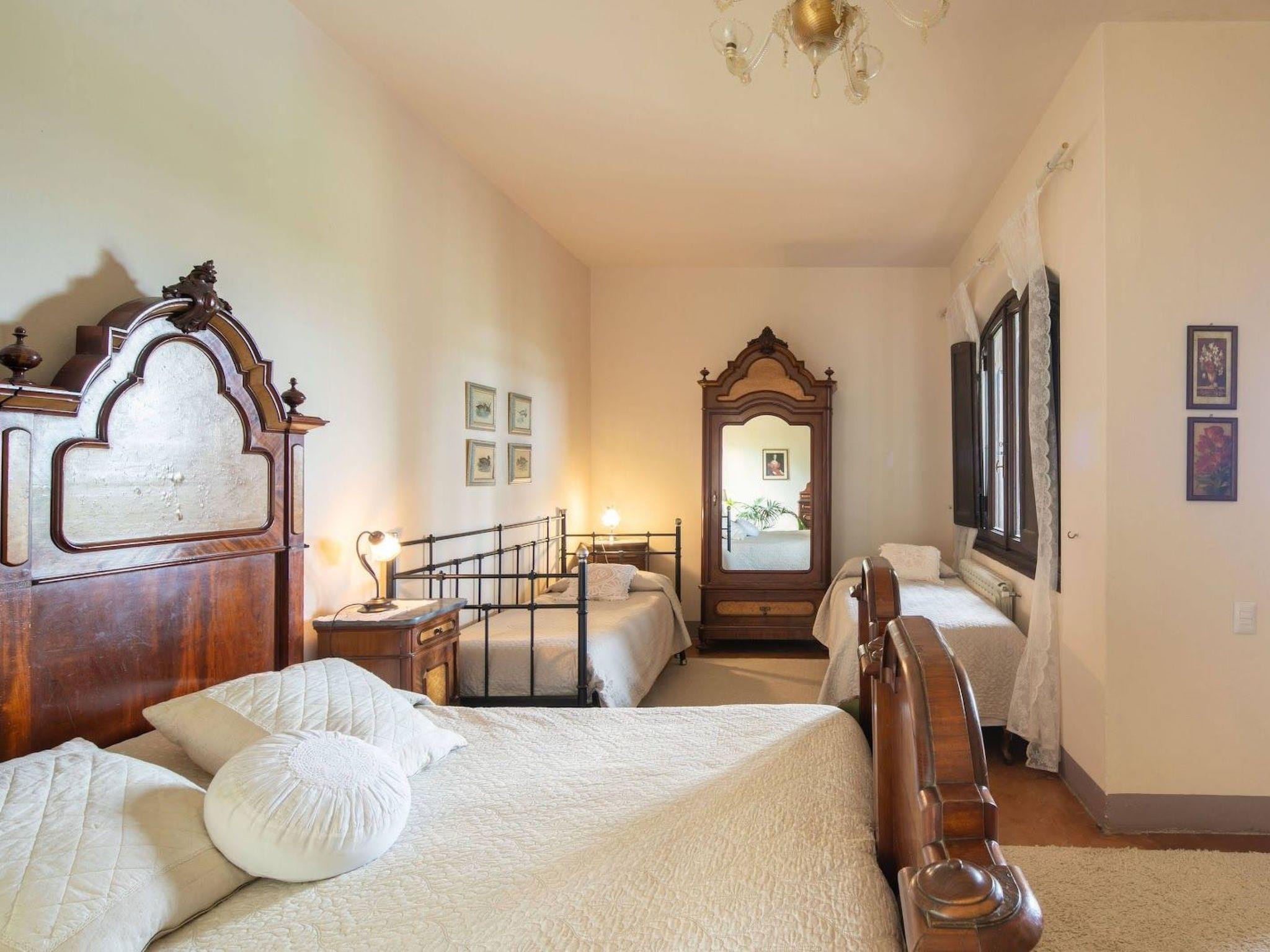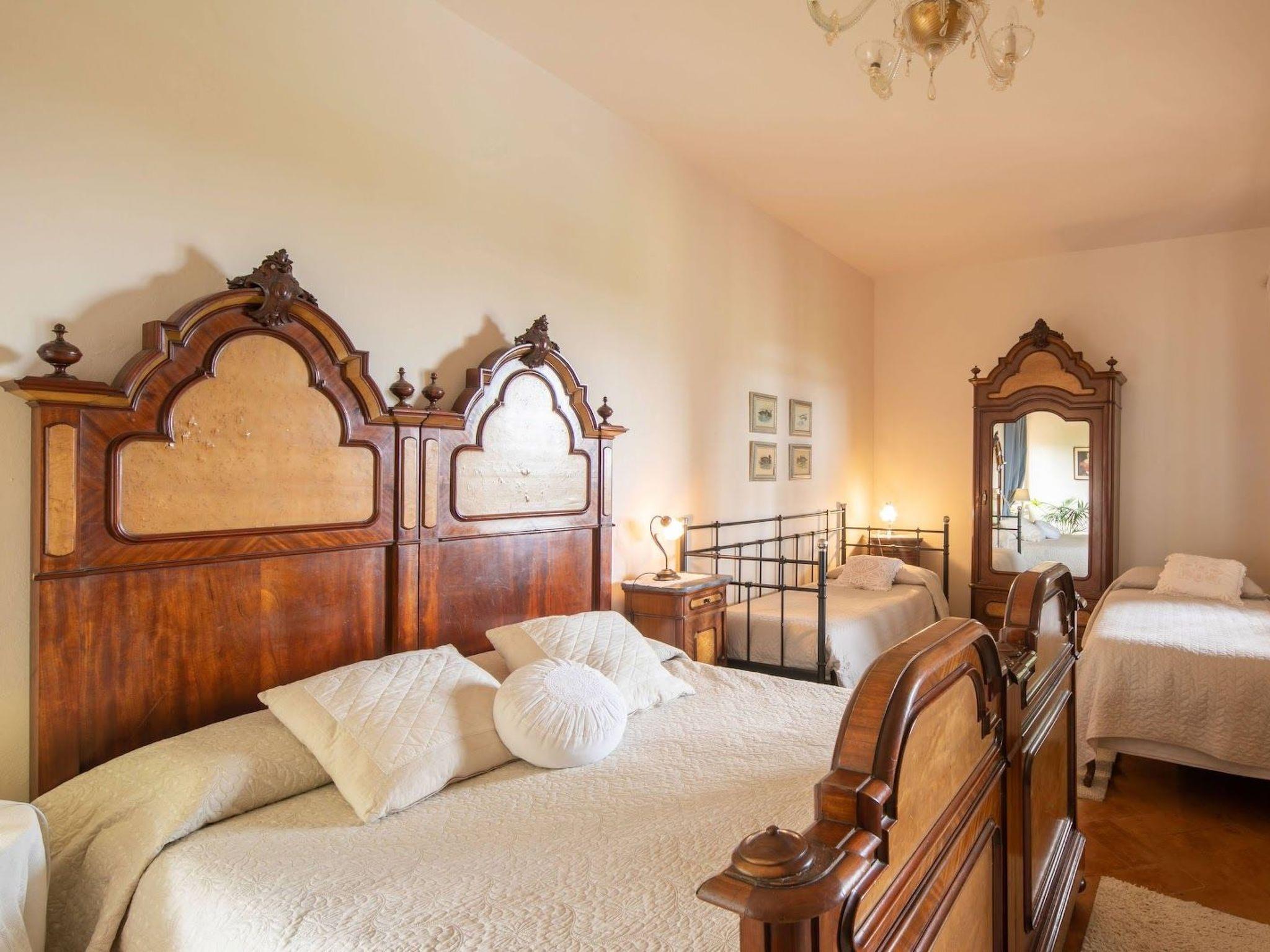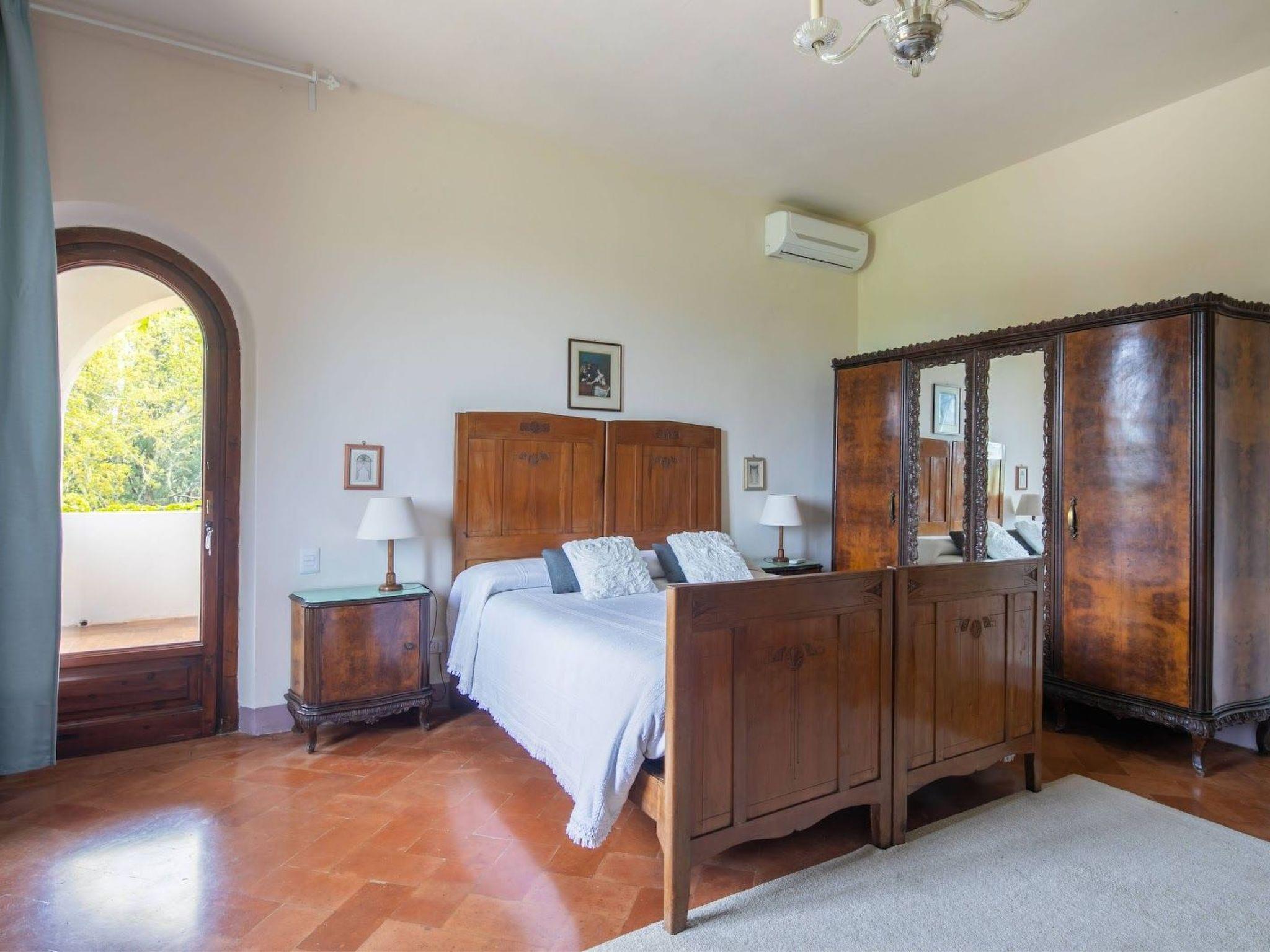 Im ersten Stock (nur über eine Treppe erreichbar) befinden sich vier geräumige Schlafzimmer (ein Doppelzimmer, zwei Dreibettzimmer mit Einzelbetten und ein großes Zimmer mit einem Doppelbett und zwei Einzelbetten). Alle Zimmer sind klimatisiert und verfügen über einen privaten Balkon mit Blick auf den großen Garten der Villa, der mit Zypressen, dem Symbol der Toskana, geschmückt ist.