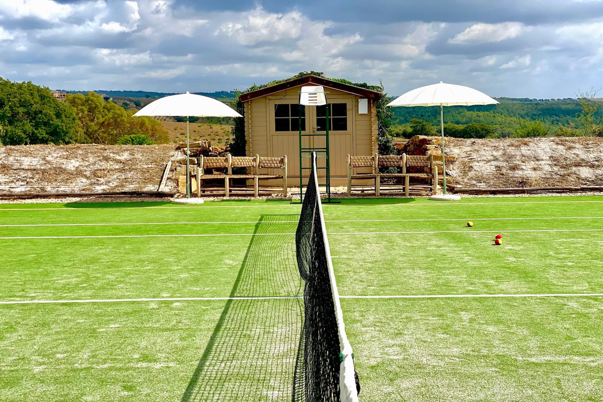 Eingebettet im Herzen der Toskana und nur eine kurze Fahrt von der Mittelmeerküste entfernt, vereint diese außergewöhnliche Villa zeitlosen italienischen Charme mit luxuriösem Komfort. Mit umfassendem Personal und in einem hervorragenden Zustand ist sie ein Paradies für Familien oder Gruppen bis zu sechzehn Personen, die Entspannung, Erholung und gehobenes Wohnen suchen – und das alles weniger als zwei Stunden von Rom entfernt. Umgeben von prächtigen Gärten, die von alten Bäumen gesäumt sind und einen atemberaubenden Blick auf das Meer bieten, lädt das Anwesen seine Gäste zum Entspannen inmitten der Natur ein. Verbringen Sie Ihre Tage mit Schwimmen im olympischen Pool, perfektionieren Sie Ihren Aufschlag auf dem privaten Tennisplatz oder erholen Sie sich im Fitnessraum und in der Sauna. Ihr Privatkoch und das aufmerksame Personal sorgen dafür, dass jeder Moment mühelos verläuft – vom entspannten Frühstück auf der Terrasse bis zum Abendessen bei Kerzenschein unter dem Sternenhimmel. Die Villa besticht durch ein warmes und elegantes Interieur mit einem geräumigen Wohnzimmer mit Kamin, Fernseher und Essbereich sowie einer voll ausgestatteten Küche mit modernen Geräten. In sieben stilvoll eingerichteten Schlafzimmern und sechs Badezimmern genießen die Gäste absolute Privatsphäre – von Suiten mit Kingsize-Bett und eigenem Bad bis hin zu gemütlichen Zweibett- und Etagenbettzimmern, ideal für Familien. Jedes Detail ist auf Komfort ausgelegt: Klimaanlage, WLAN, Grillplatz, Waschmaschine und Trockner, Safe und Ladestation für Elektroautos. Für Kinder gibt es eine Spielecke, ein Kinderbett, einen Hochstuhl und Treppenschutzgitter. Ob Sie auf dem Balkon einen lokalen Wein genießen, die umliegenden Dörfer erkunden oder den Sonnenuntergang über den toskanischen Hügeln bewundern – diese Villa bietet Ihnen den Inbegriff eines italienischen Urlaubs: luxuriös, ruhig und unvergesslich.