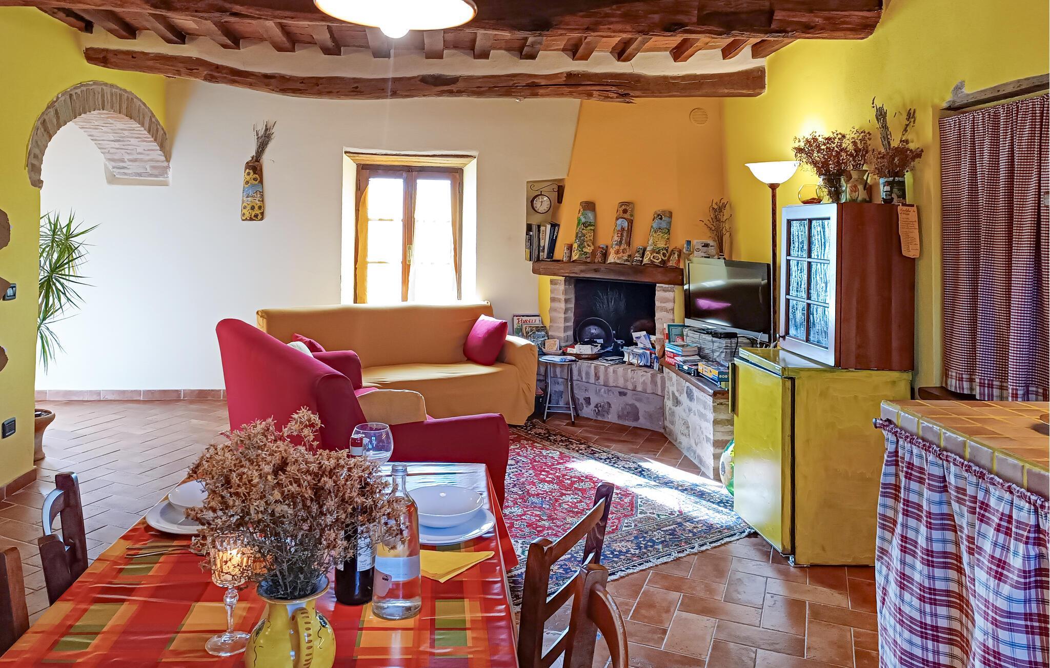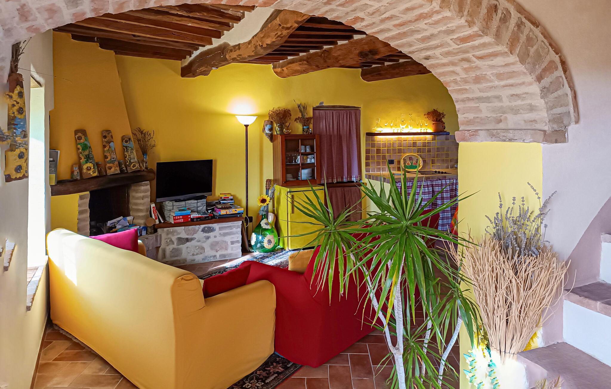 Die gemütliche Ferienwohnung beeindruckt mit einem einladenden Wohnbereich, der durch seine sonnige Farbgestaltung und rustikale Einrichtung eine warme Atmosphäre schafft. Entspannen Sie sich auf den komfortablen Sofas am Kamin und genießen Sie einen geselligen Abend. Kochen Sie in der charmanten Landhausküche köstliche Gerichte und lassen Sie sich von der liebevollen Einrichtung inspirieren.