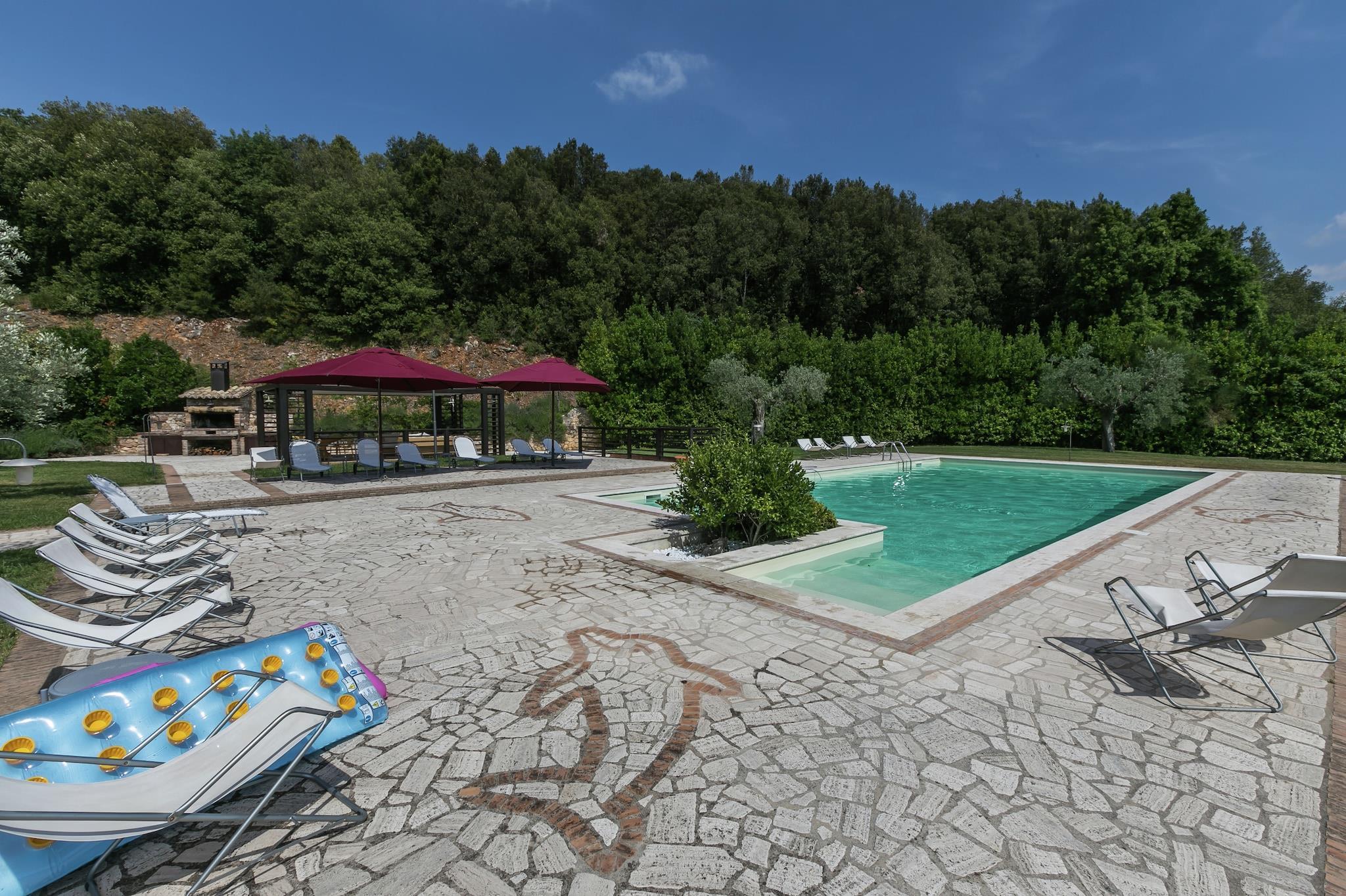 In der 1. Etage: (Wohnzimmer(TV, Esstisch, Kaminofen, Sitzecke), offene Küche(Kochplatte, Dunstabzugshaube, Backofen, Mikrowelle, Spülmaschine, Kühl-/Gefrierkombination), Schlafzimmer(Etagenbett), Schlafzimmer(Doppelbett), Badezimmer(Badewanne mit Dusche, Whirlwanne, Waschbecken, Toilette, Bidet), Empore(Einzelbett)) Esstisch, Waschmaschine(Gemeinschaftliche Nutzung mit anderen Gästen), Heizung, Terrasse, Garten(Gemeinschaftliche Nutzung mit anderen Gästen, > 1000 m2), Gartenmöbel, Liegen, Grill(Gemeinschaftliche Nutzung mit anderen Gästen), Sonnenschirm, Pool(Gemeinschaftliche Nutzung mit anderen Gästen, 14 x 7 m., geöffnet von Jun bis einschließlich Sep), Markise