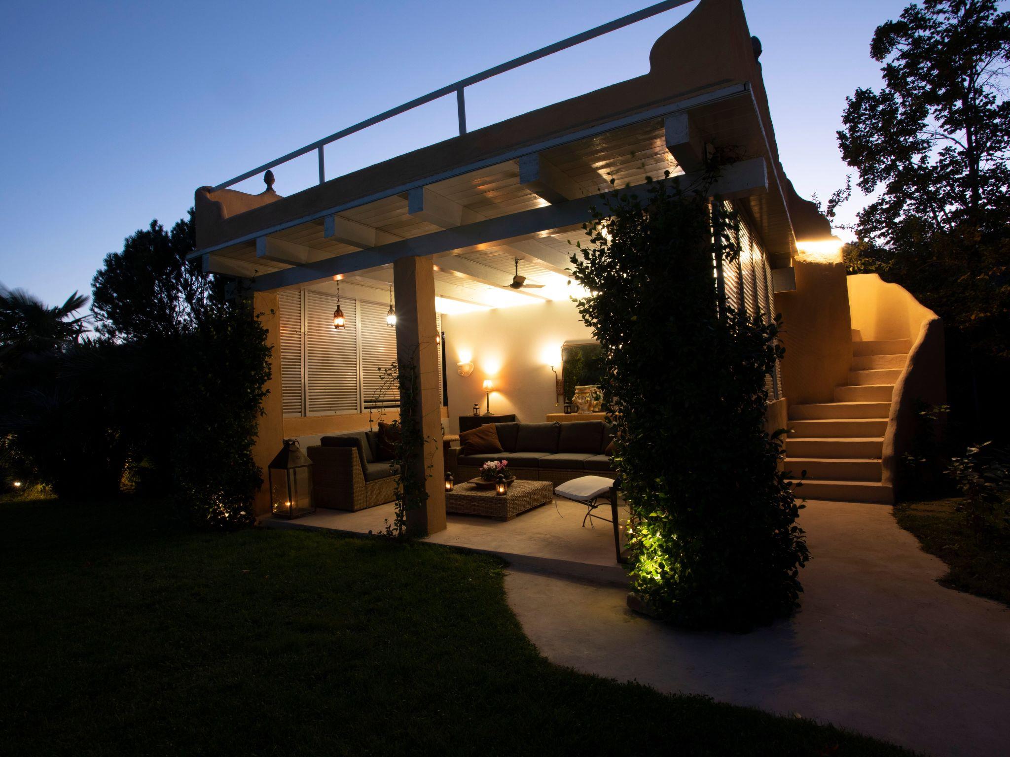Wenige Schritte vom Pool entfernt befindet sich auch eine romantische Pergola mit Sofas, einem Couchtisch und einem Deckenventilator.
